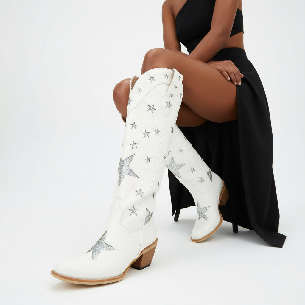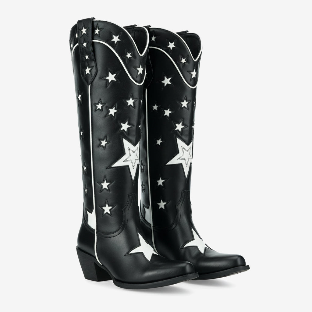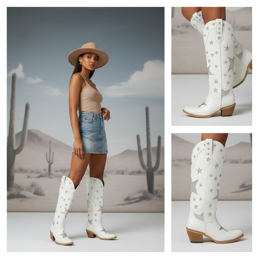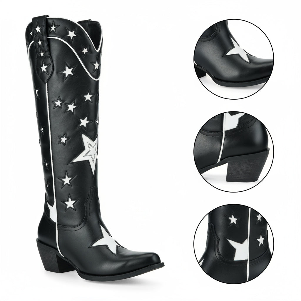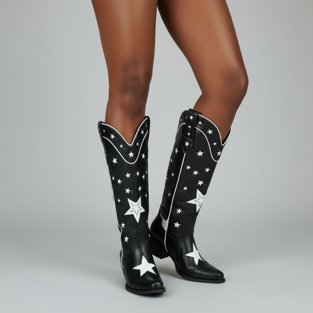 Step into style with our Western Cowgirl Boots, crafted from premium vegan leather for lasting comfort and eco-friendliness. Featuring unique star inlays, these boots offer a standout look that will elevate any outfit.