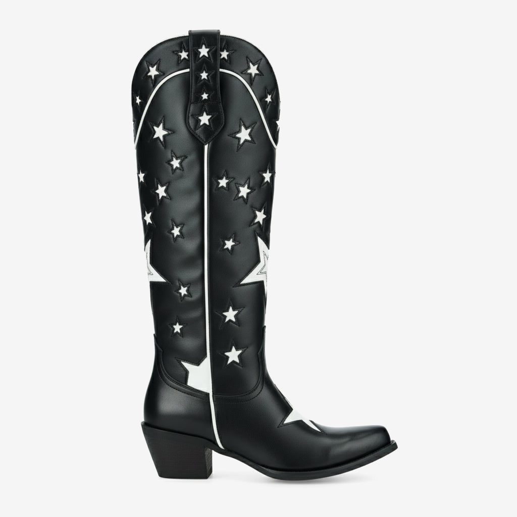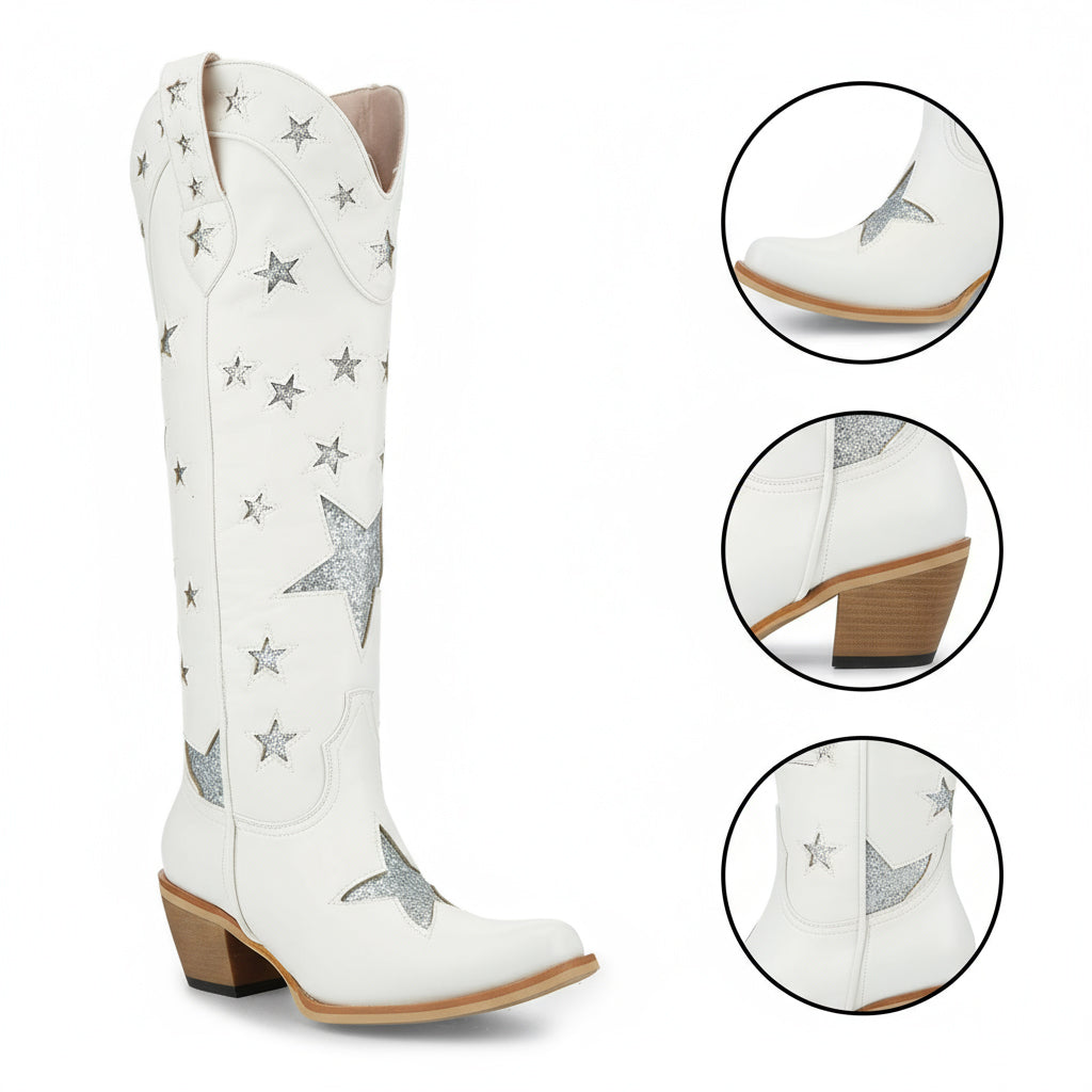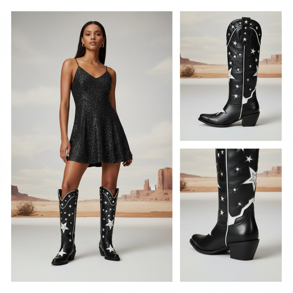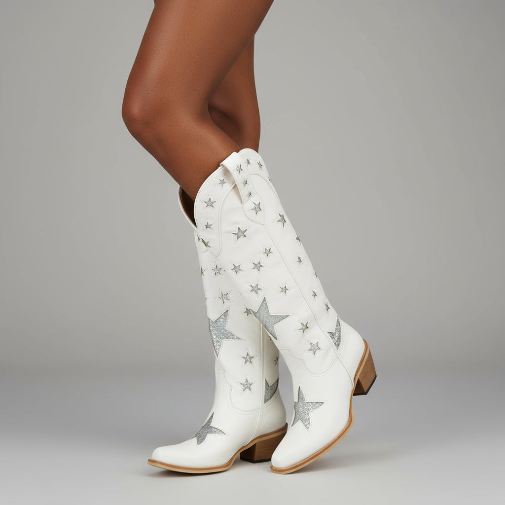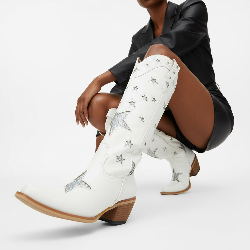 Step into style with our Western Cowgirl Boots, crafted from premium vegan leather for lasting comfort and eco-friendliness. Featuring unique star inlays, these boots offer a standout look that will elevate any outfit.