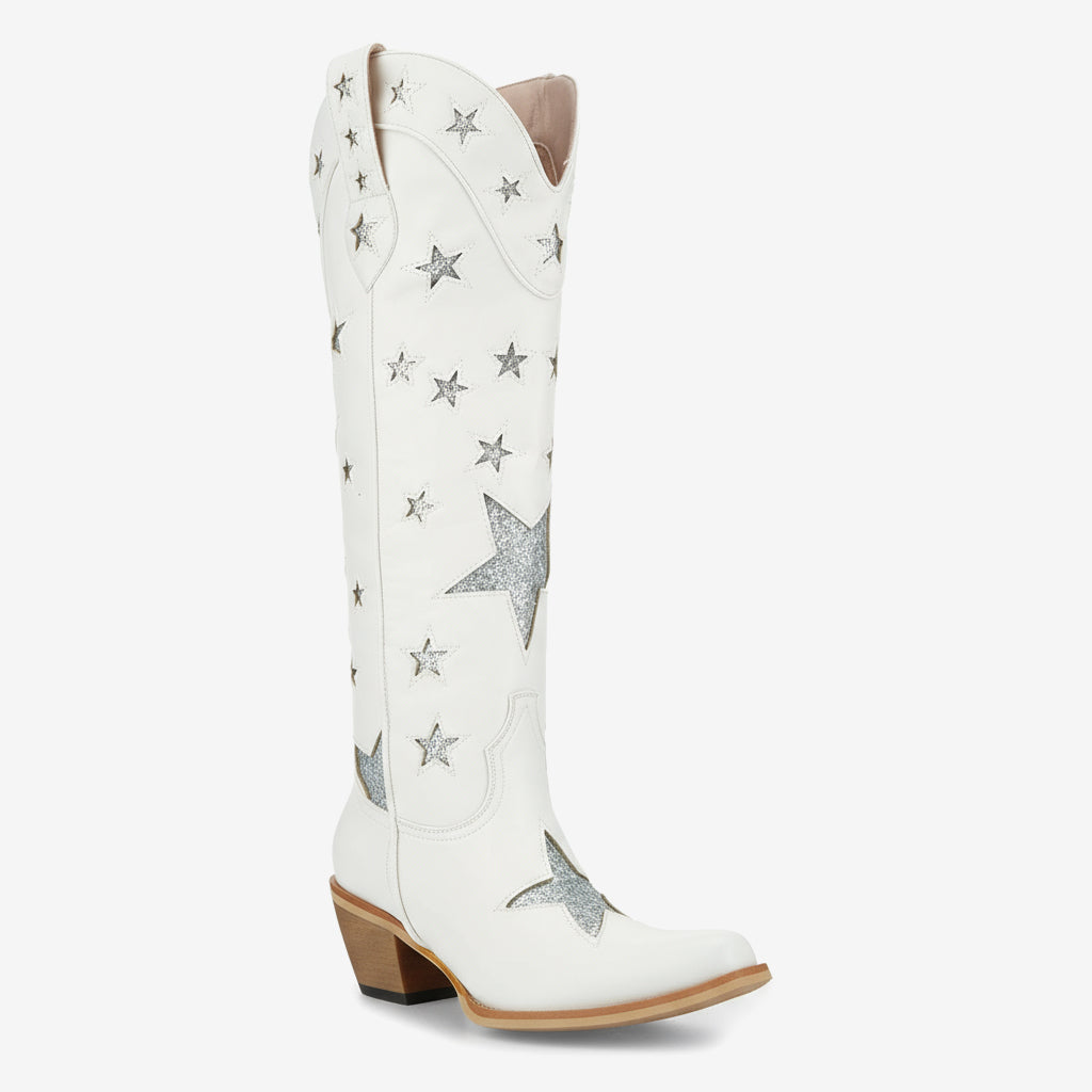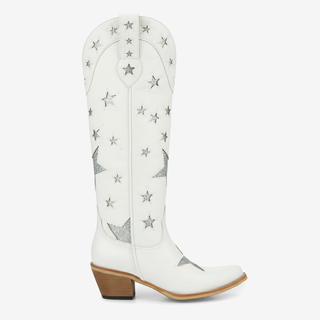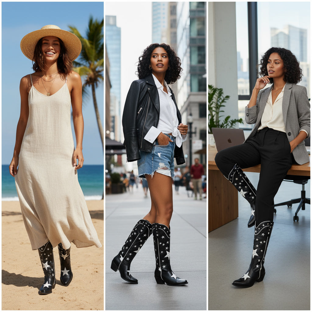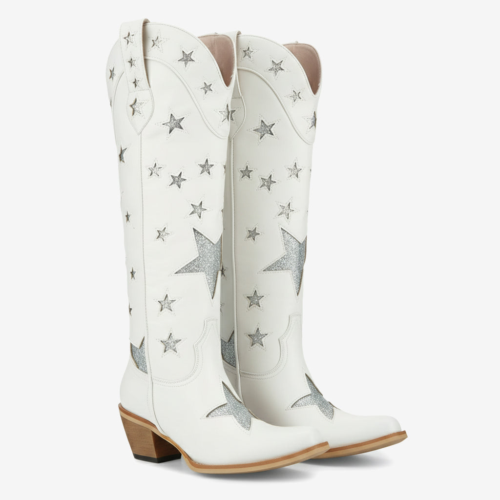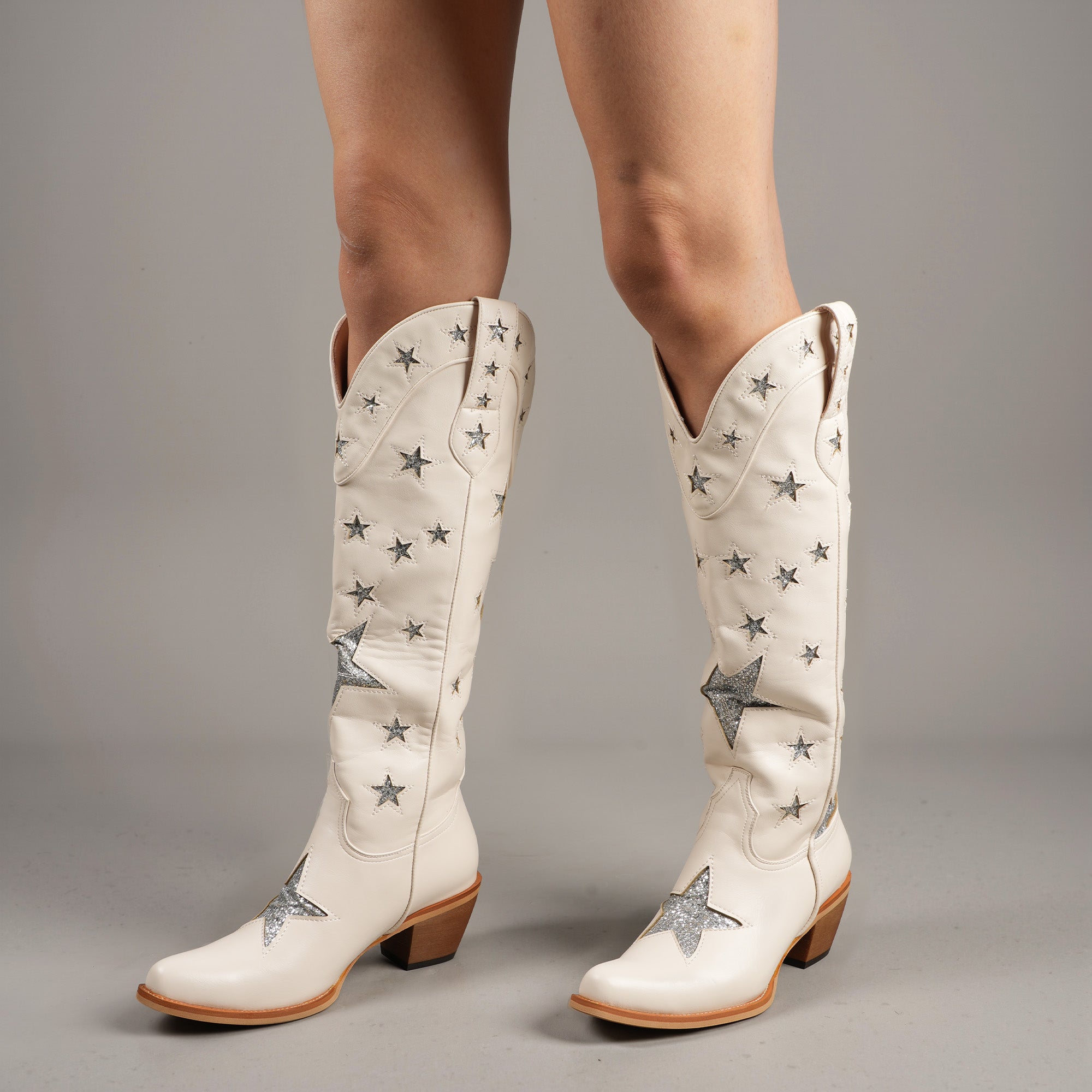 Step into style with our Western Cowgirl Boots, crafted from premium vegan leather for lasting comfort and eco-friendliness. Featuring unique star inlays, these boots offer a standout look that will elevate any outfit.