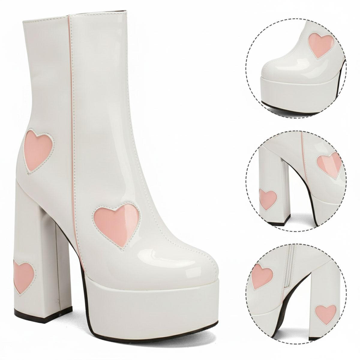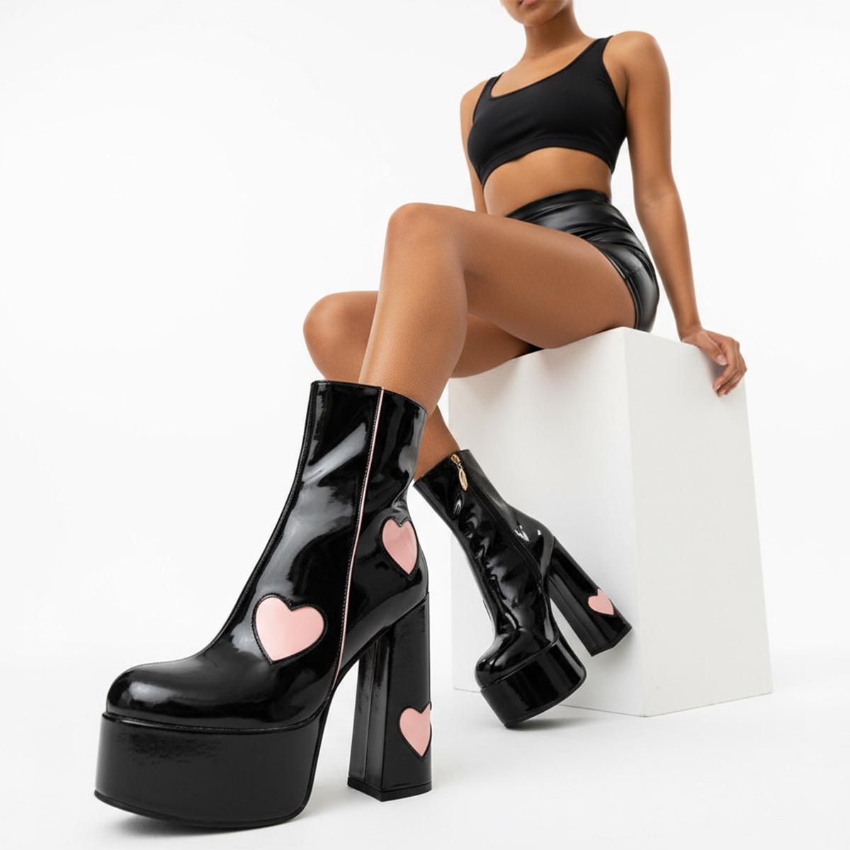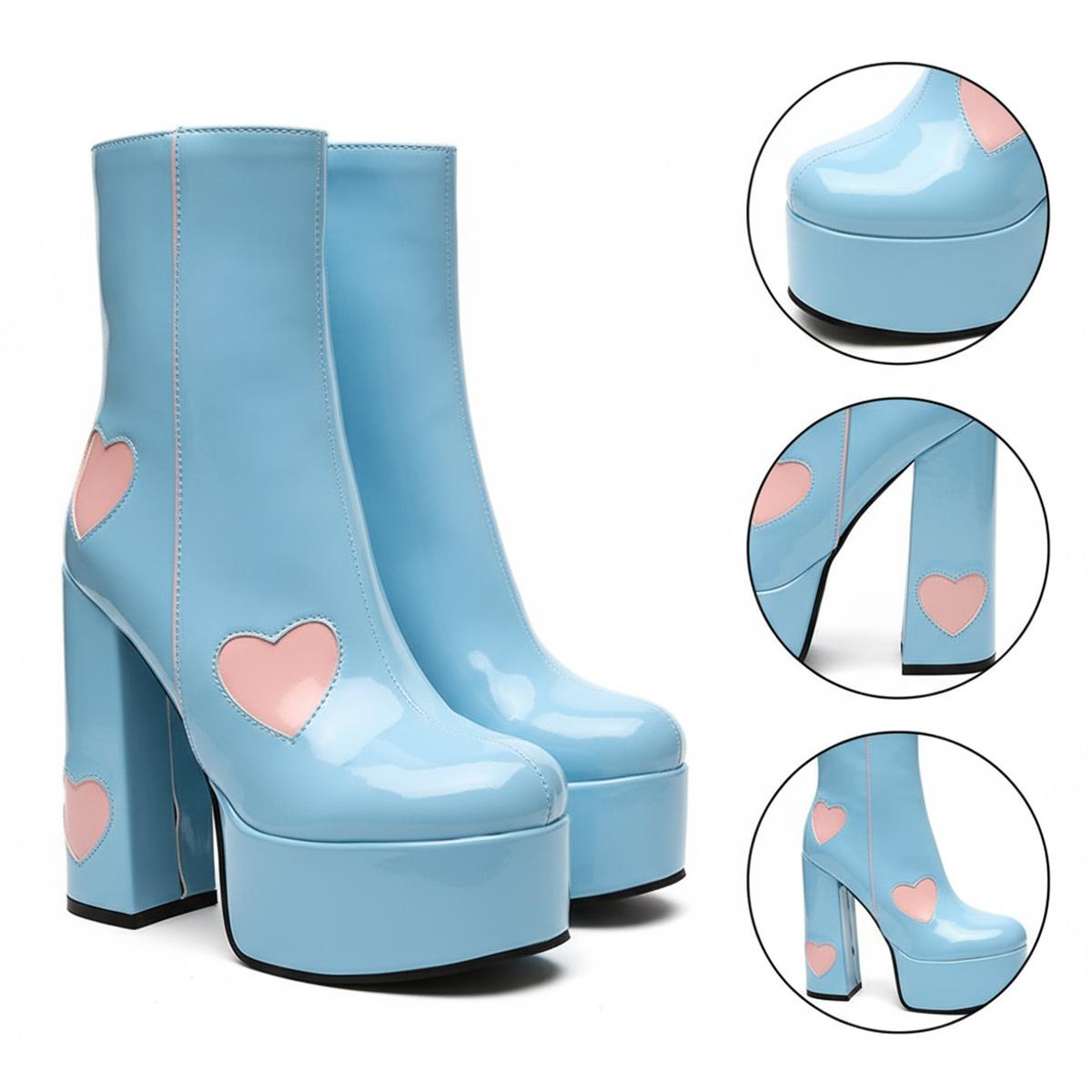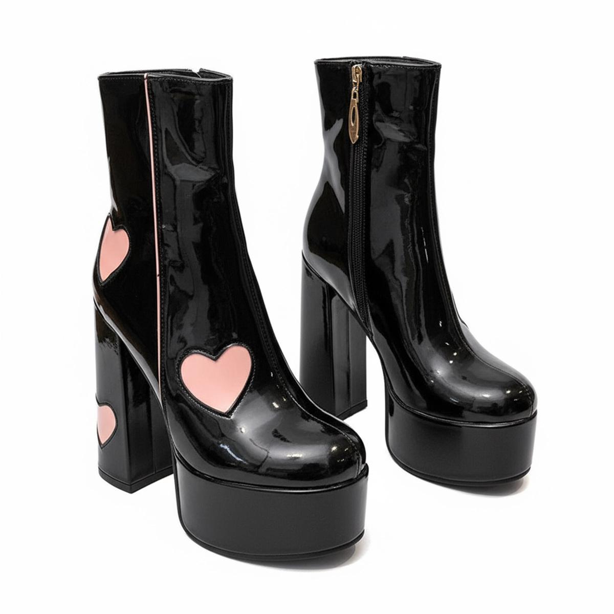 Core Value: Crafted with precision, these ankle boots feature a heart pattern that sets them apart. The combination of high-quality synthetic patent leather and handcrafted details ensures an eye-catching aesthetic and durability.