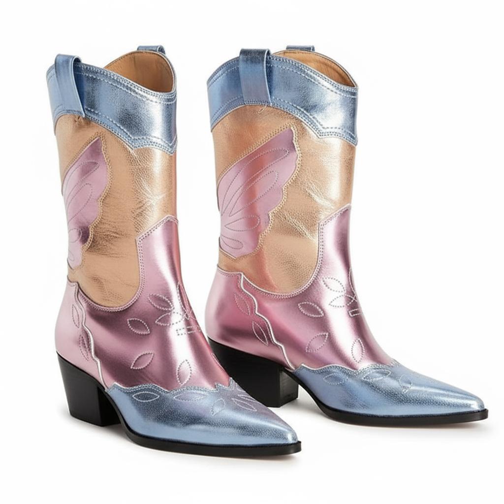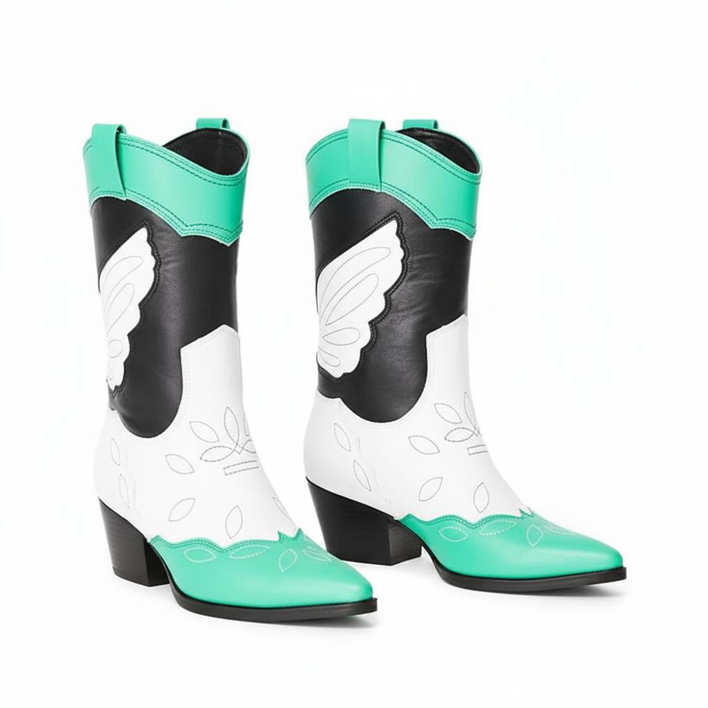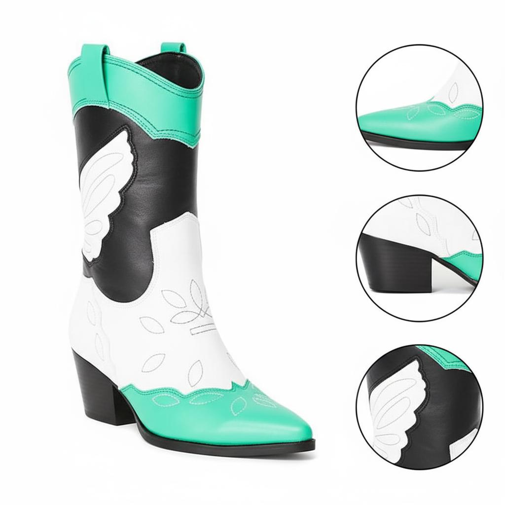 Discover Exceptional Craftsmanship: Our Colorful Metallic Western Mid Calf Boots are expertly handcrafted from premium full-grain leather, ensuring a unique design that marries traditional western aesthetics with modern flair. Each pair is individually crafted with attention to detail, featuring exquisite wing embroidery and a stunning metallic finish. These boots are more than just footwear; they are a statement of style and individuality.