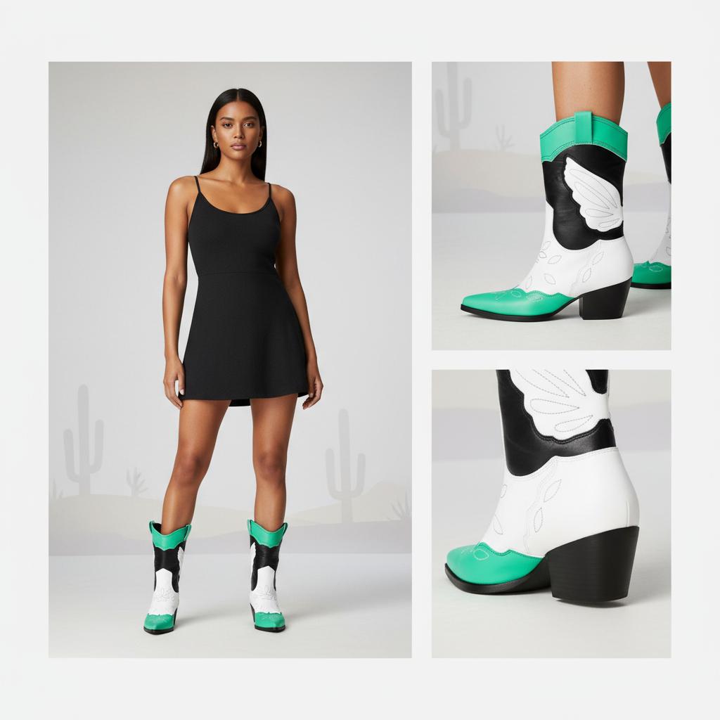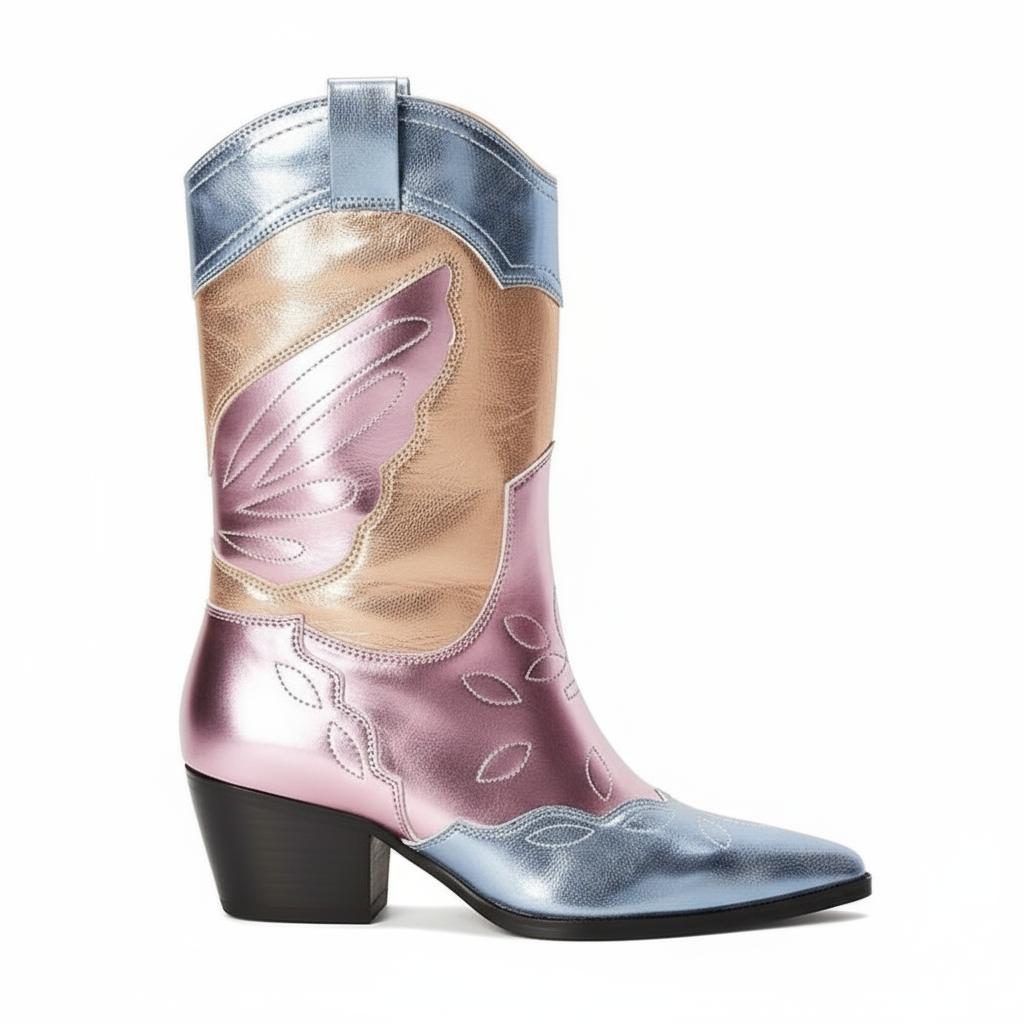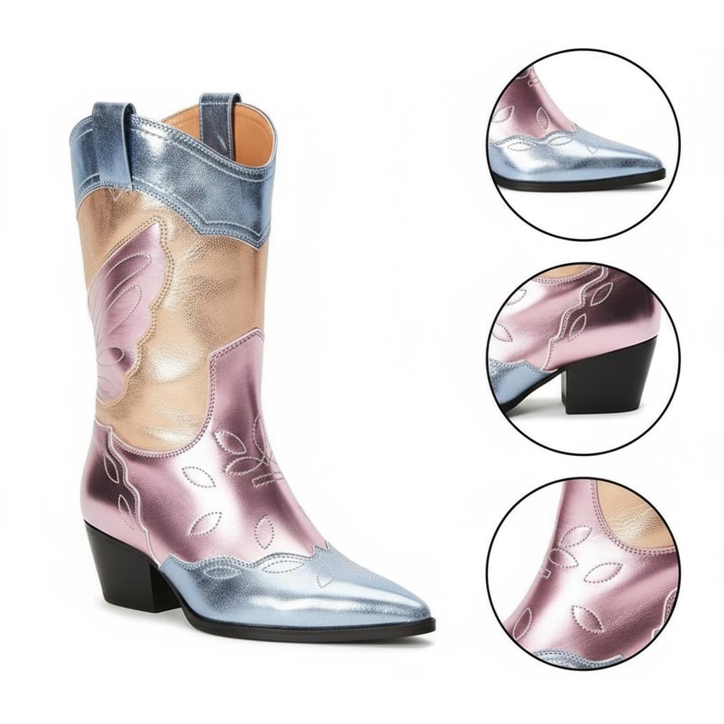 Discover Exceptional Craftsmanship: Our Colorful Metallic Western Mid Calf Boots are expertly handcrafted from premium full-grain leather, ensuring a unique design that marries traditional western aesthetics with modern flair. Each pair is individually crafted with attention to detail, featuring exquisite wing embroidery and a stunning metallic finish. These boots are more than just footwear; they are a statement of style and individuality.