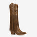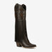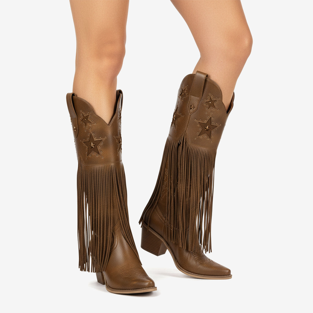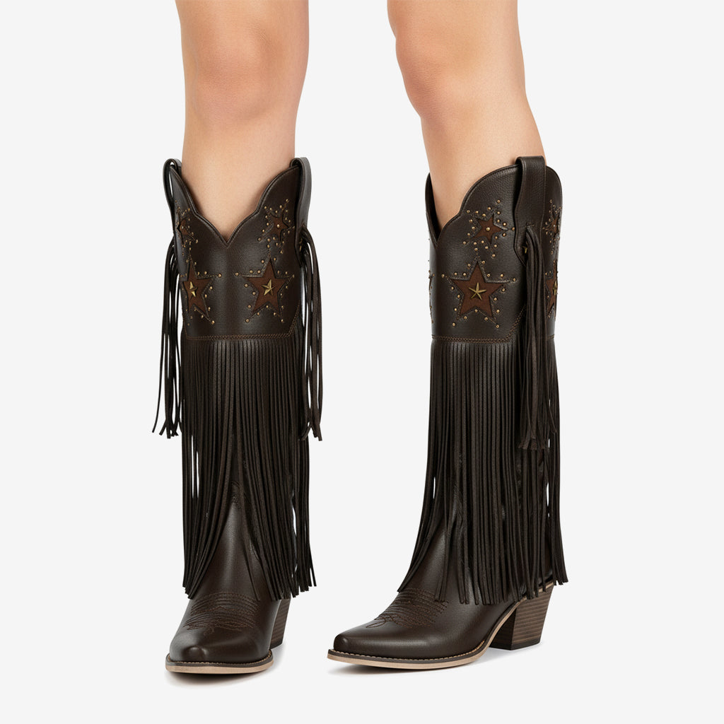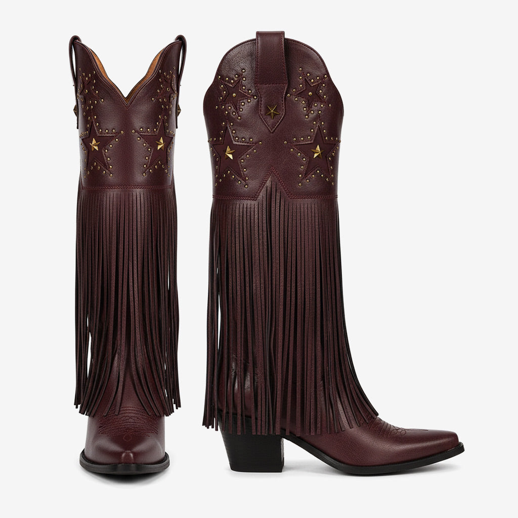 Unleash your inner fashionista with our stunning Western knee boots, meticulously crafted from premium full-grain leather. With an emphasis on unique craftsmanship, these boots feature exquisite handcrafted details that set them apart from the crowd. The bold design elements, including fringe accents and eye-catching studs, create a striking look perfect for any occasion.