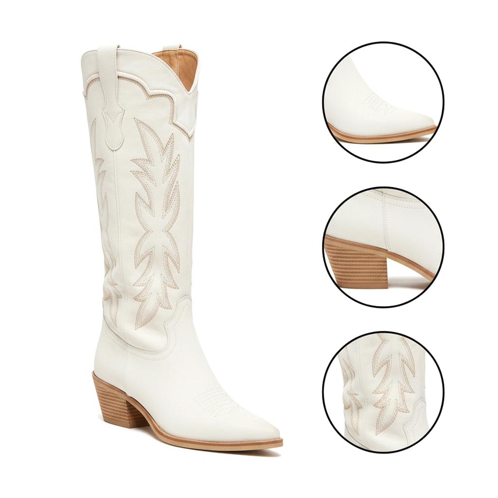 Introducing our Embroidered Chunky Heel Western Cowboy Boots for Women, meticulously crafted from soft, durable vegan leather. These boots feature a unique embroidered design that adds a touch of elegance and sophistication to your outfit. With a pointed toe silhouette, they exude a chic vibe that complements any wardrobe.