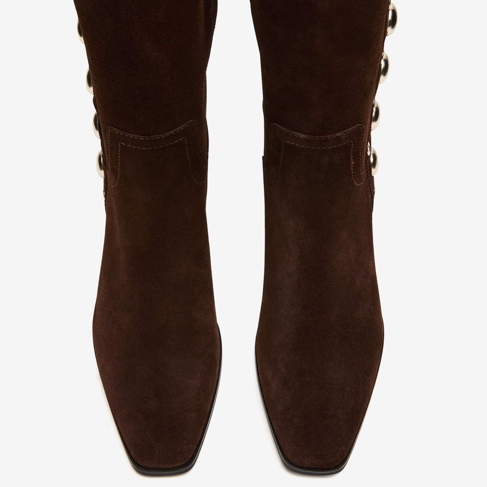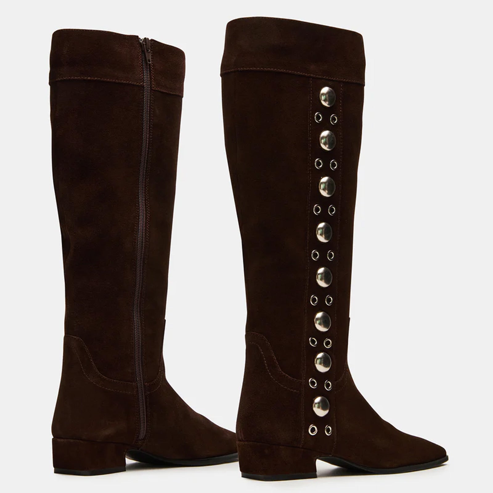 Embrace a blend of elegance and functionality with our unique knee-high boots, expertly crafted from premium faux suede. Featuring a chic square toe and bold metal accents, these boots are not just footwear; they are a stunning fashion statement that elevates any outfit.