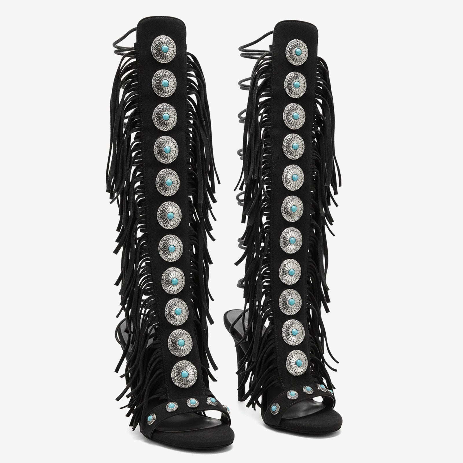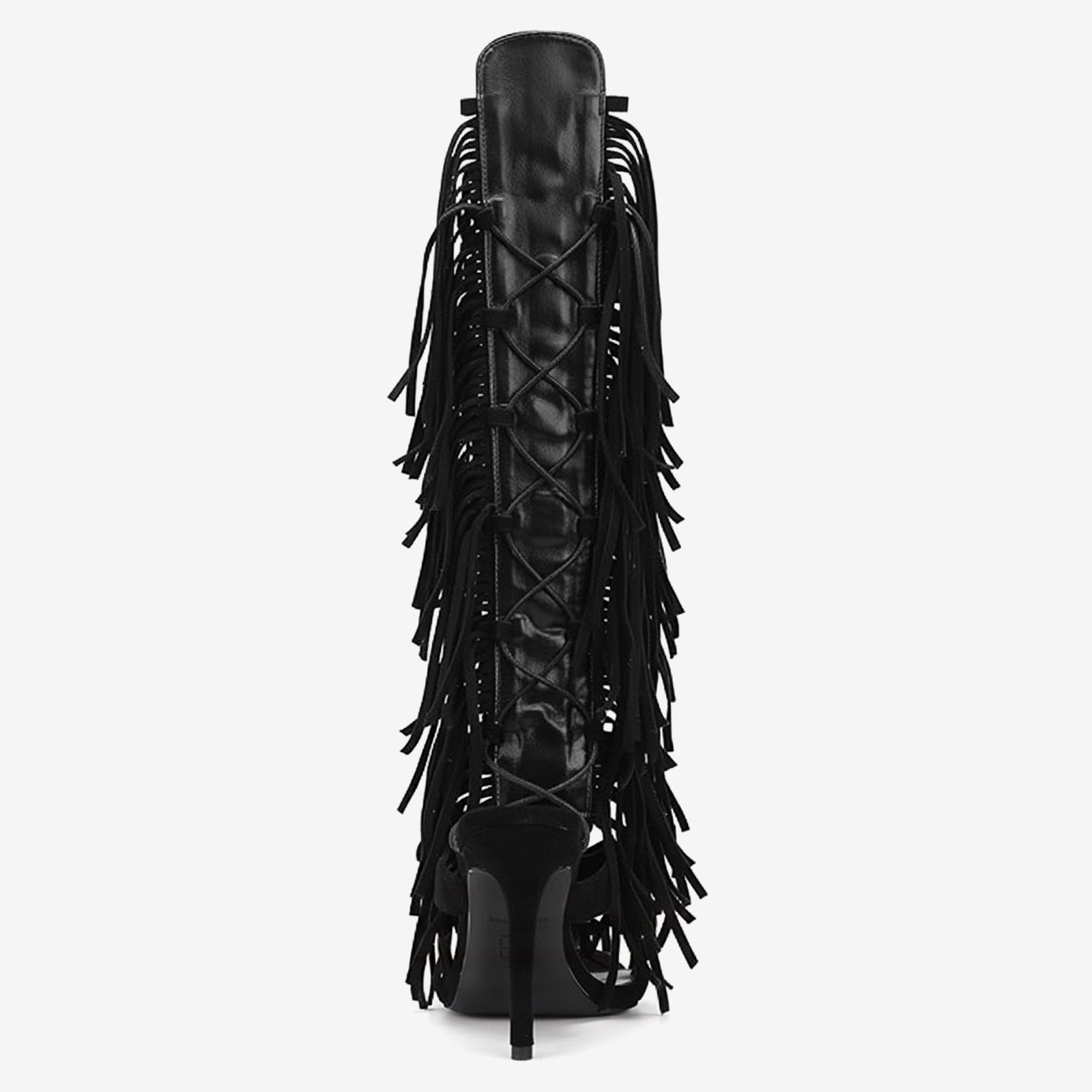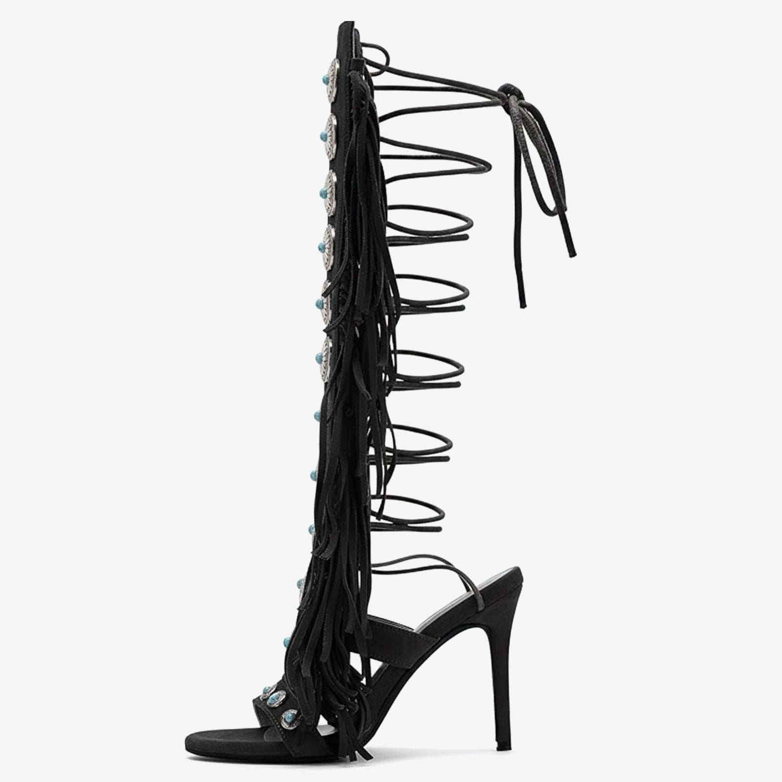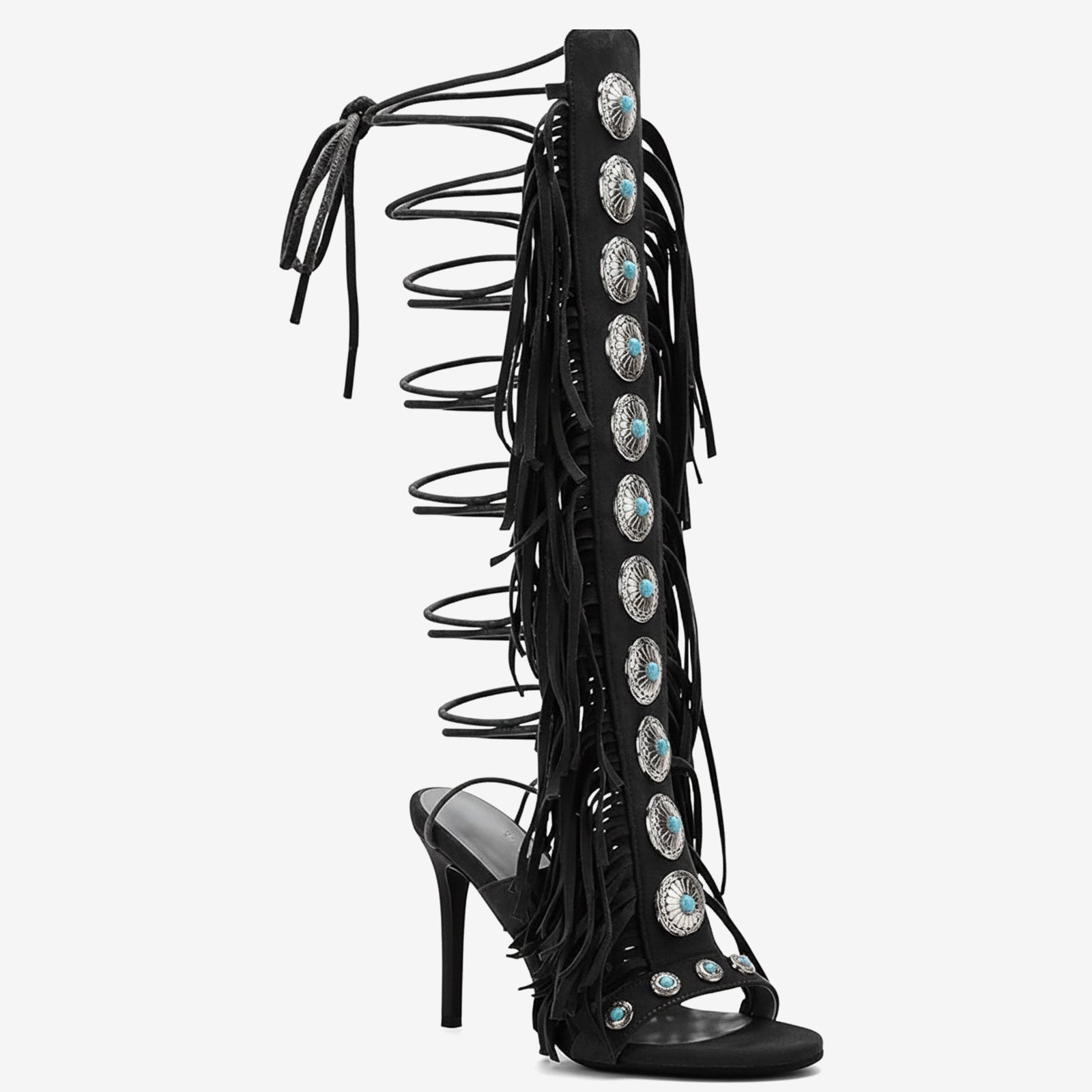 Unleash Your Inner Fashionista: Our High Heel Open Toe Booties with Fringe and Stone Detail are meticulously crafted to elevate your style for any party or fashion runway event. Featuring an exclusive design that seamlessly blends elegance and contemporary flair, these booties are perfect for making a memorable entrance.