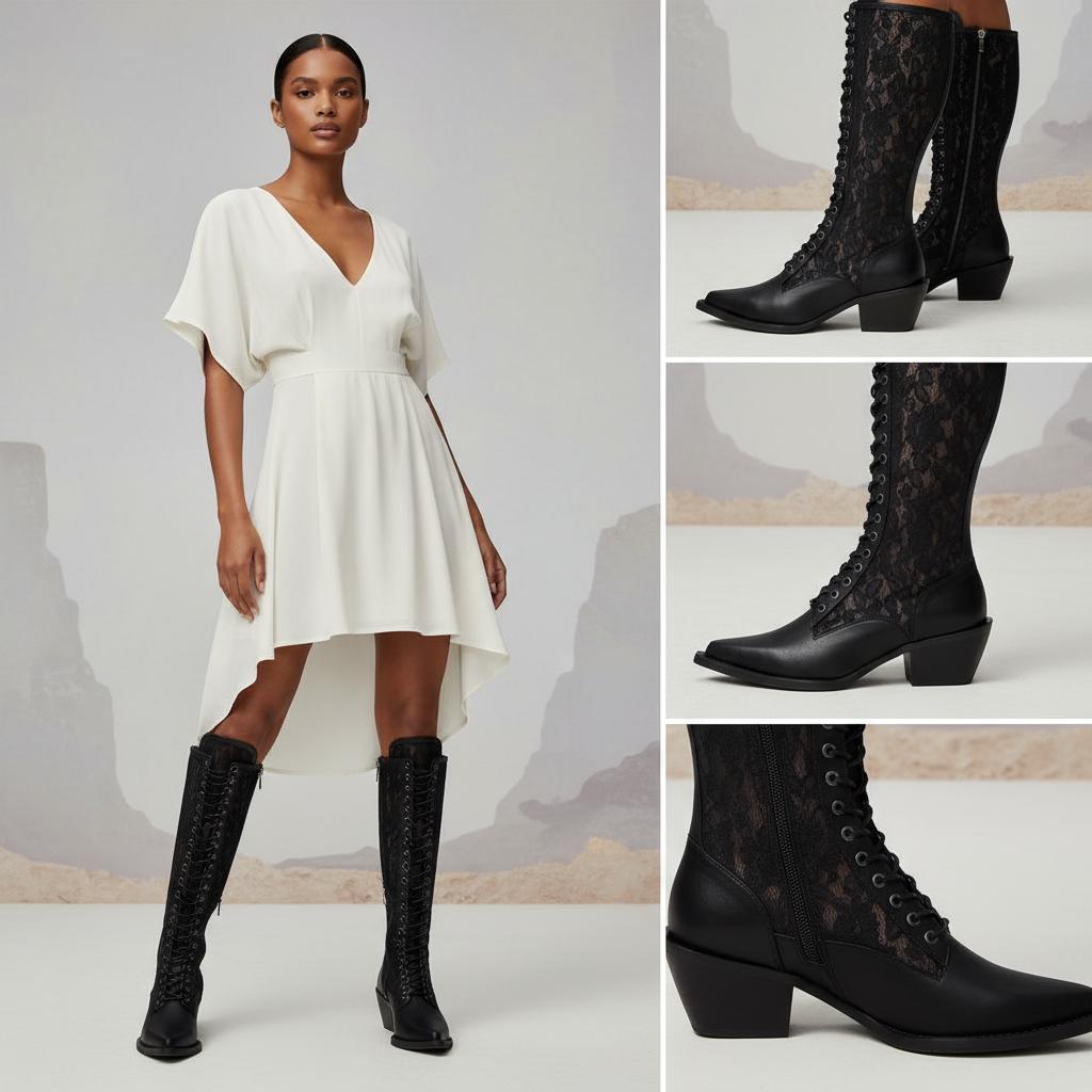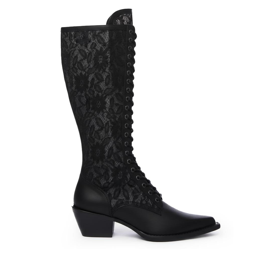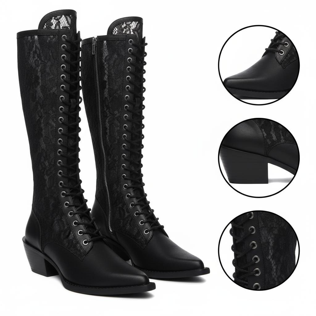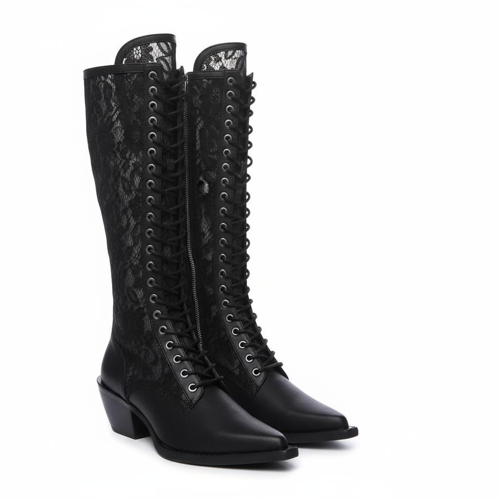 Step into elegance with our striking black mesh flower embroidered lace-up knee-high boots. Meticulously handcrafted, these boots feature a unique design that combines modern fashion with intricate artistry, ensuring you stand out in any crowd. Each pair is crafted with attention to detail, showcasing expert craftsmanship that sets them apart.