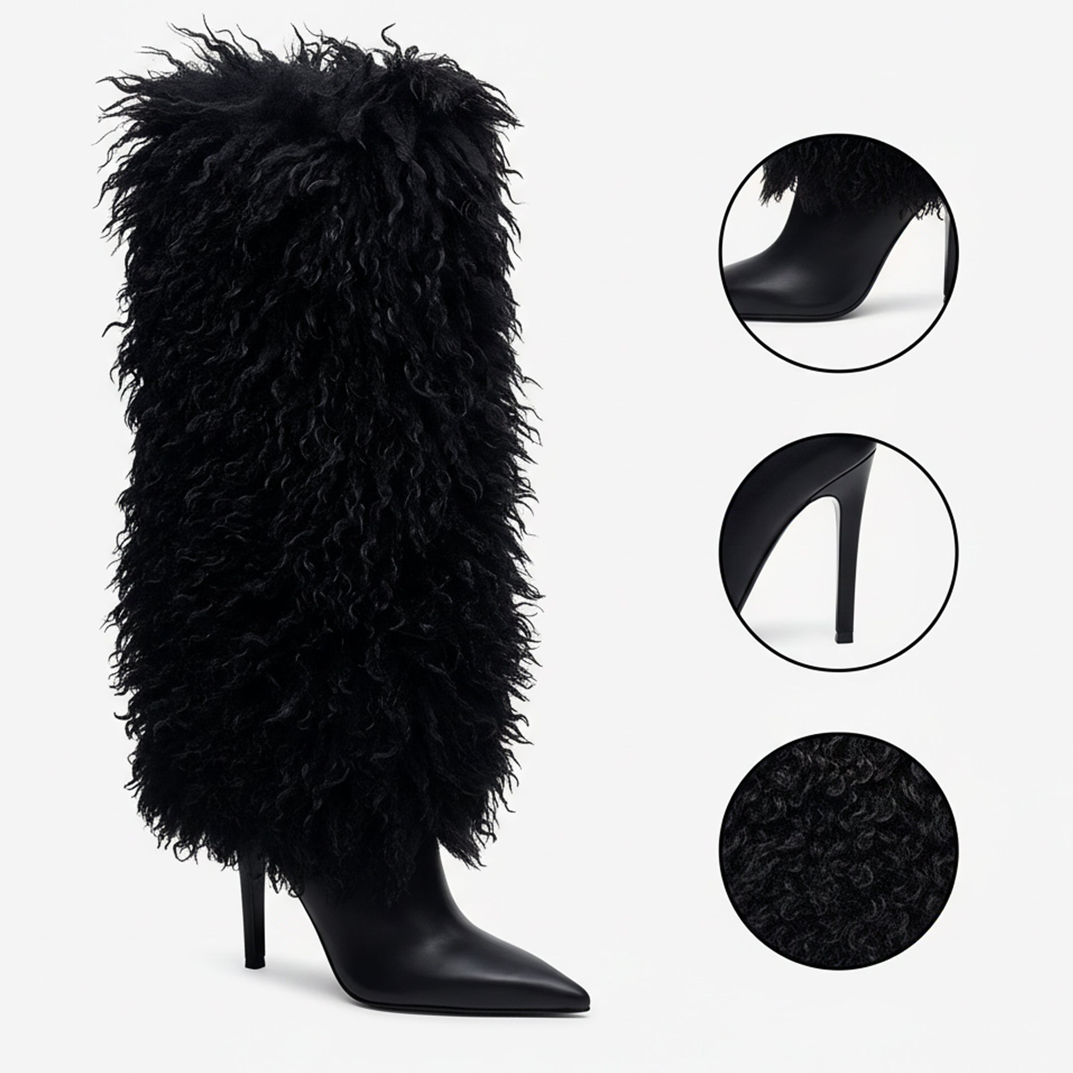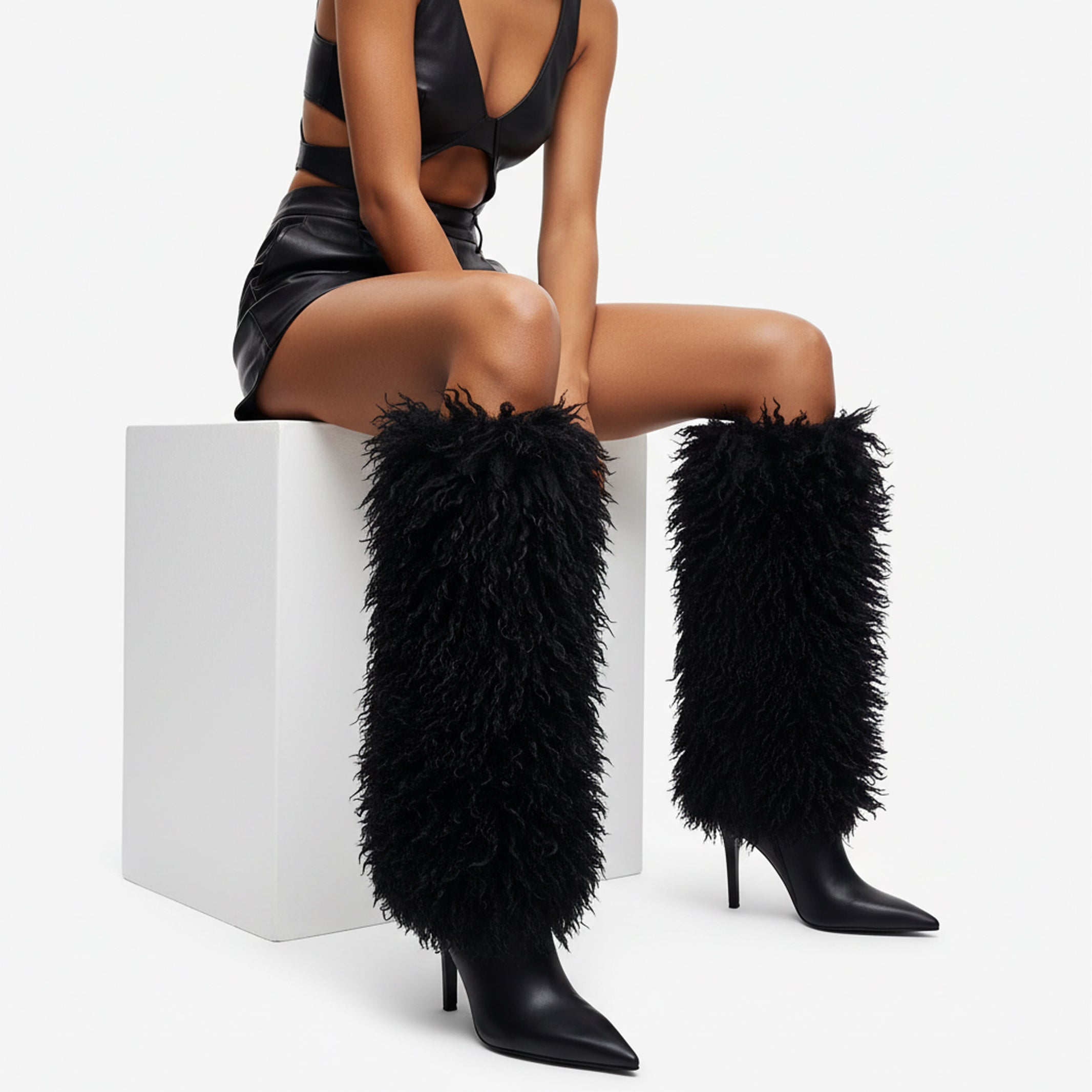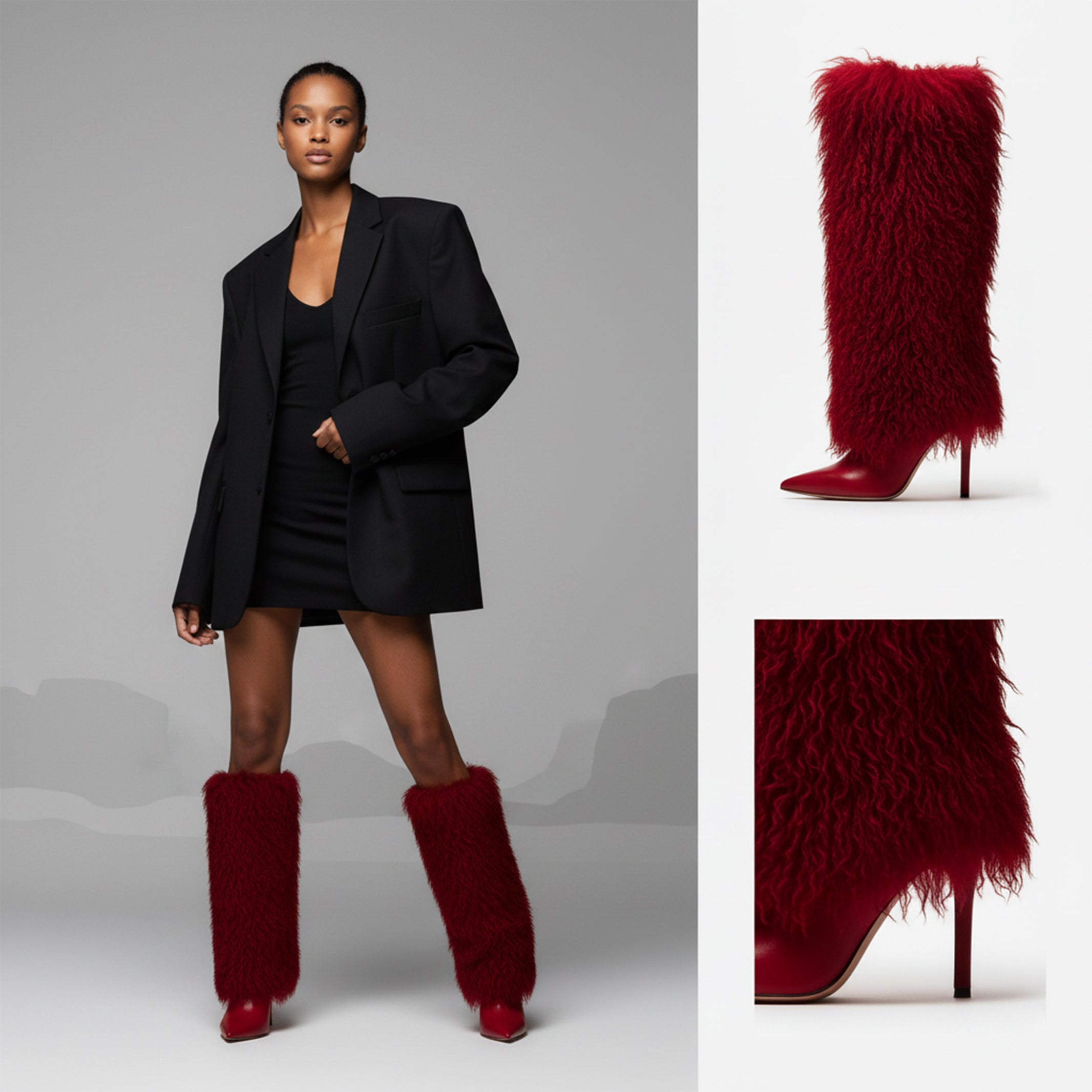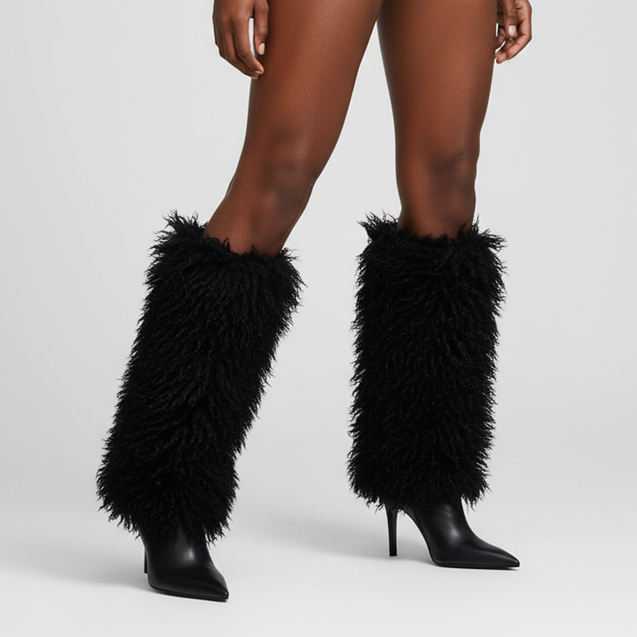 This stunning pair of knee-high boots seamlessly blends fashion and function. Crafted with exquisite faux fur and PU materials, they offer a unique design that stands out, making them perfect for runways and parties alike.