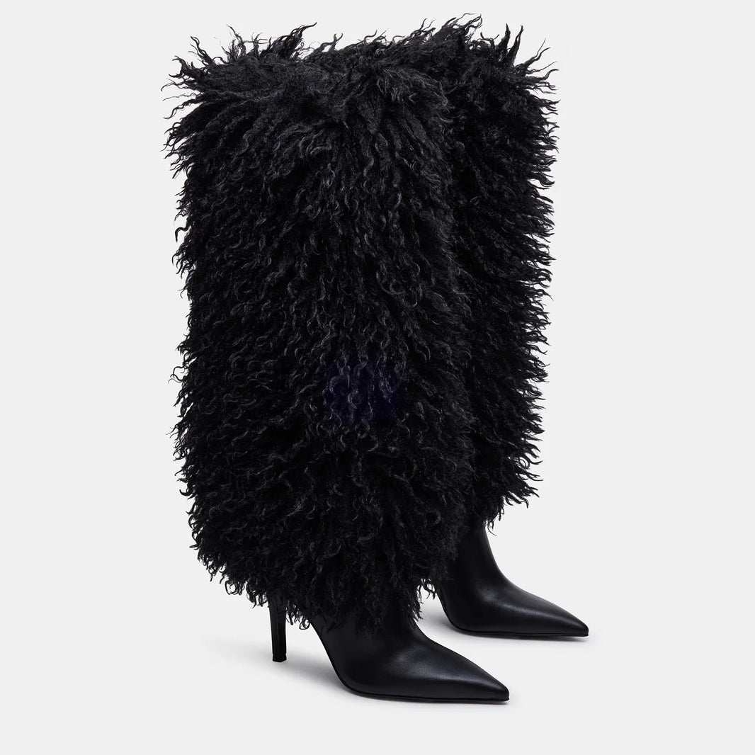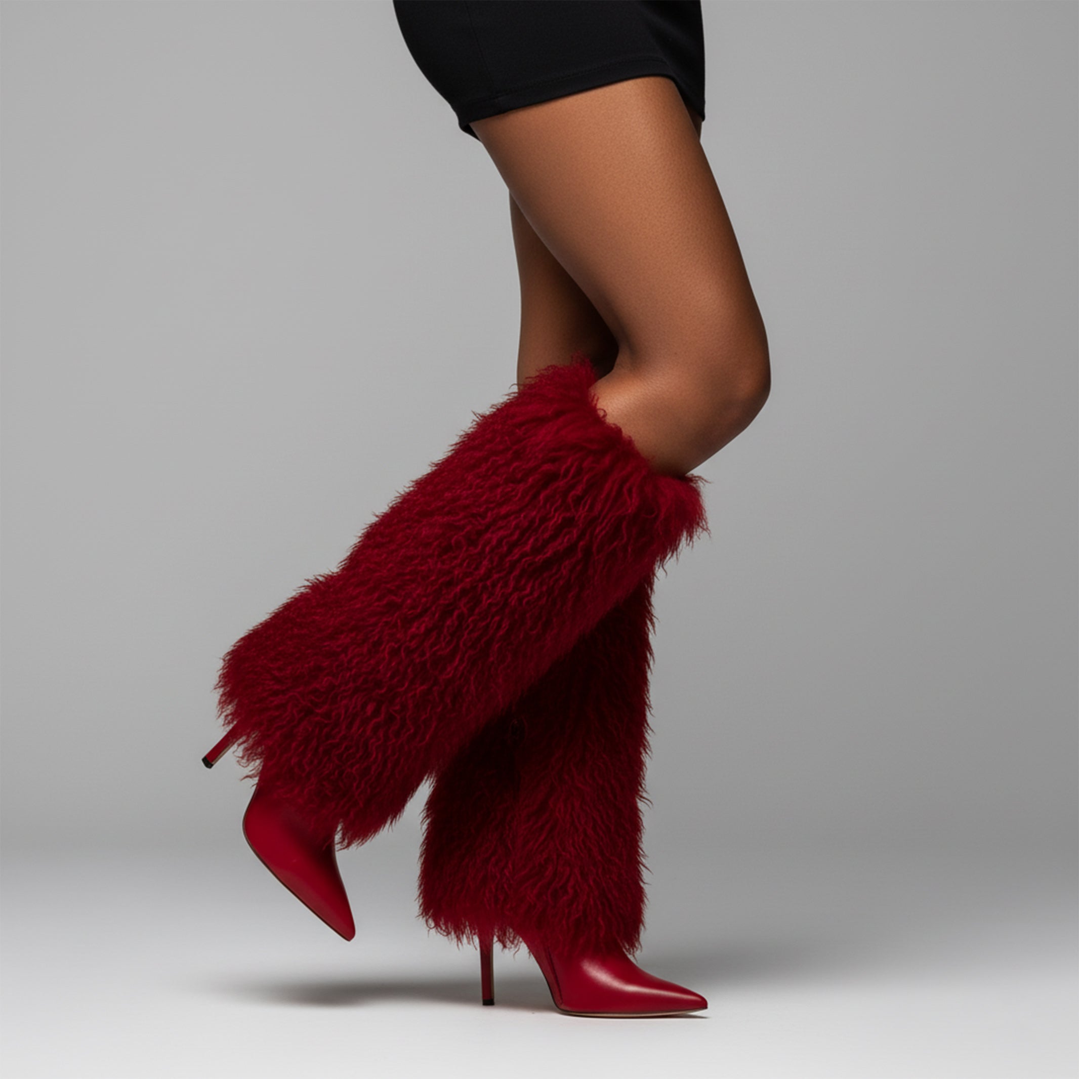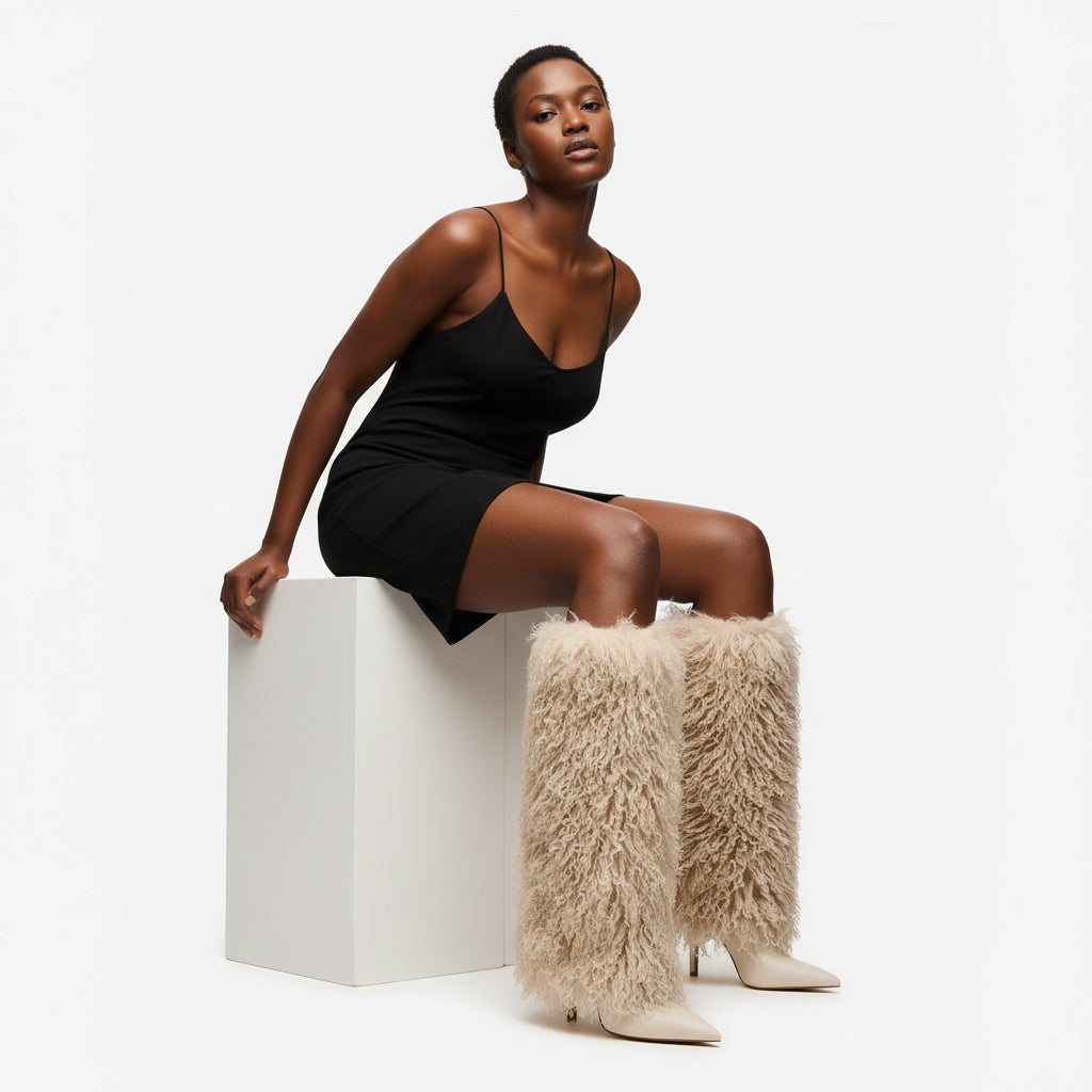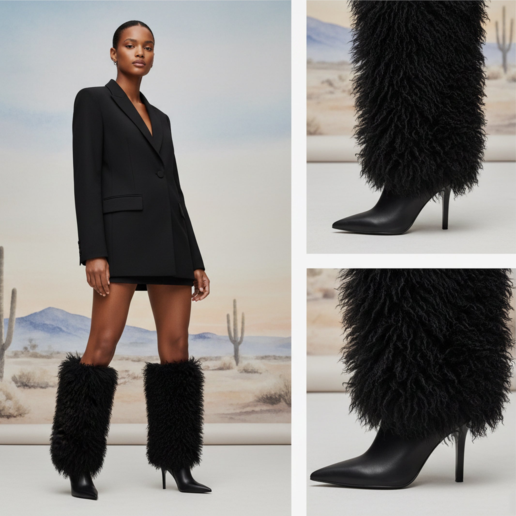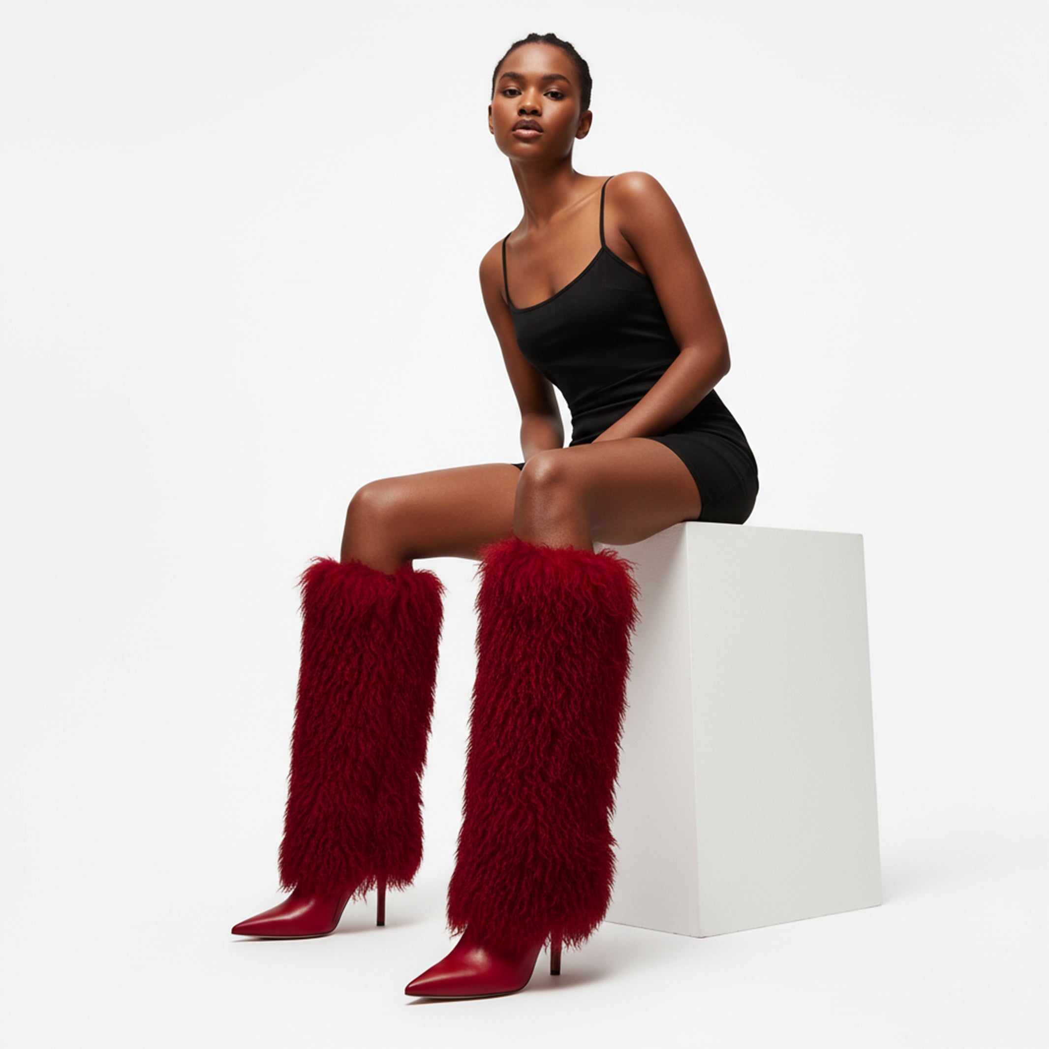 This stunning pair of knee-high boots seamlessly blends fashion and function. Crafted with exquisite faux fur and PU materials, they offer a unique design that stands out, making them perfect for runways and parties alike.