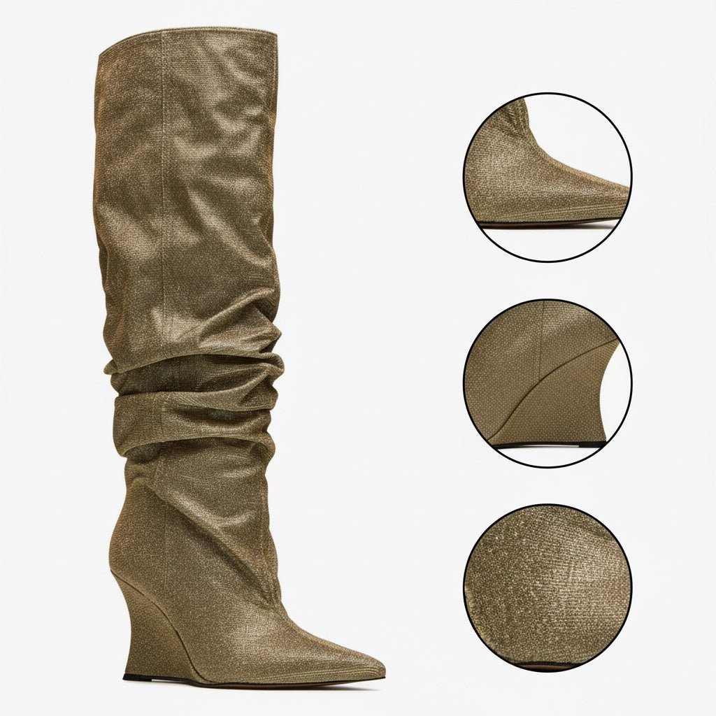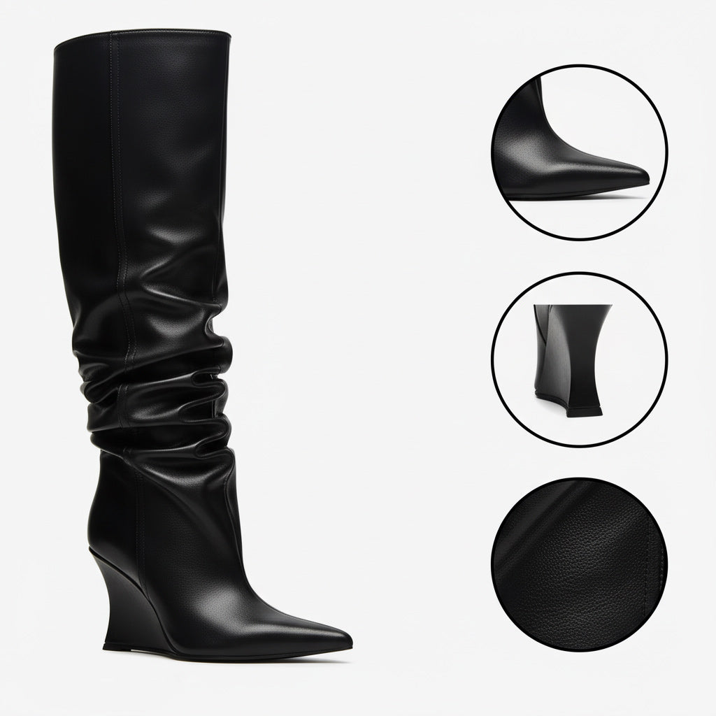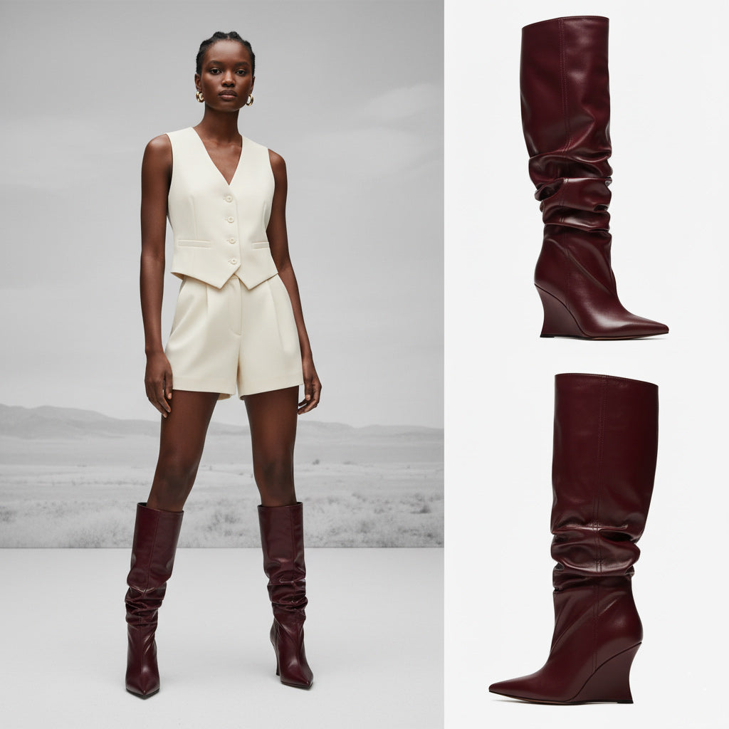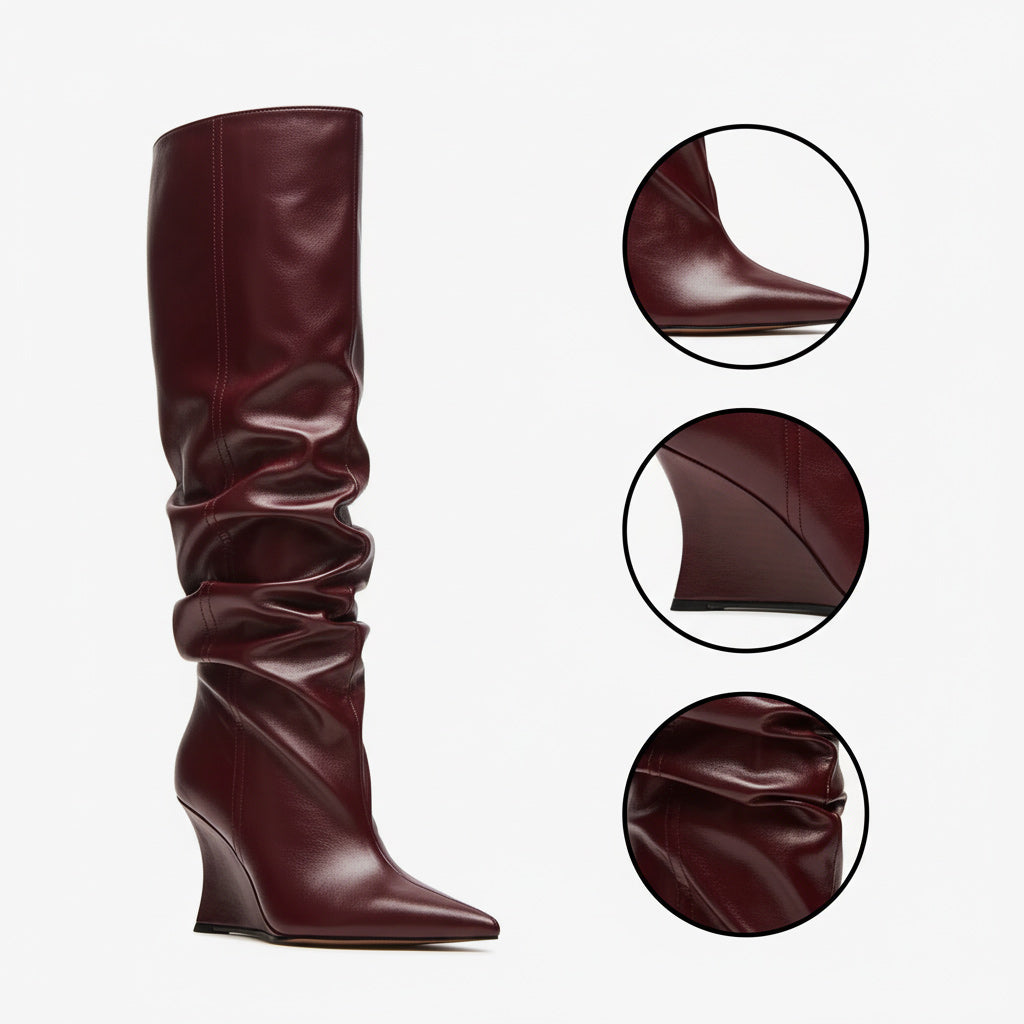 Step into elegance with our unique women's knee-high boots, crafted from premium lacquered and featuring a chic wrinkled design. These exclusive boots not only elevate your style but also complement various outfits, making them a must-have in your wardrobe.