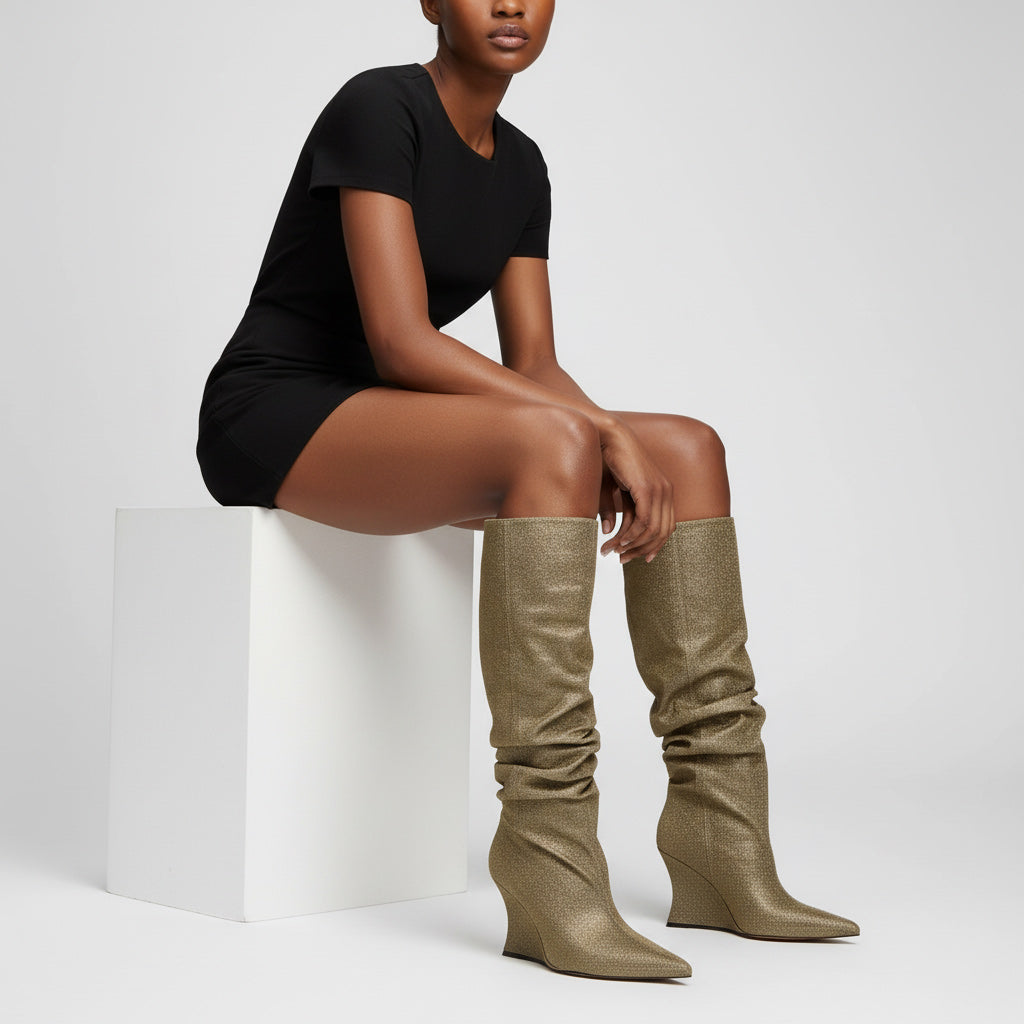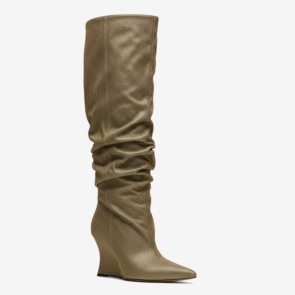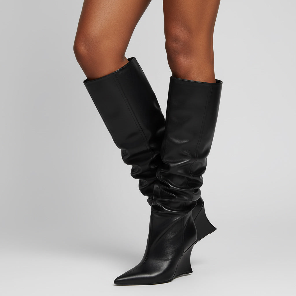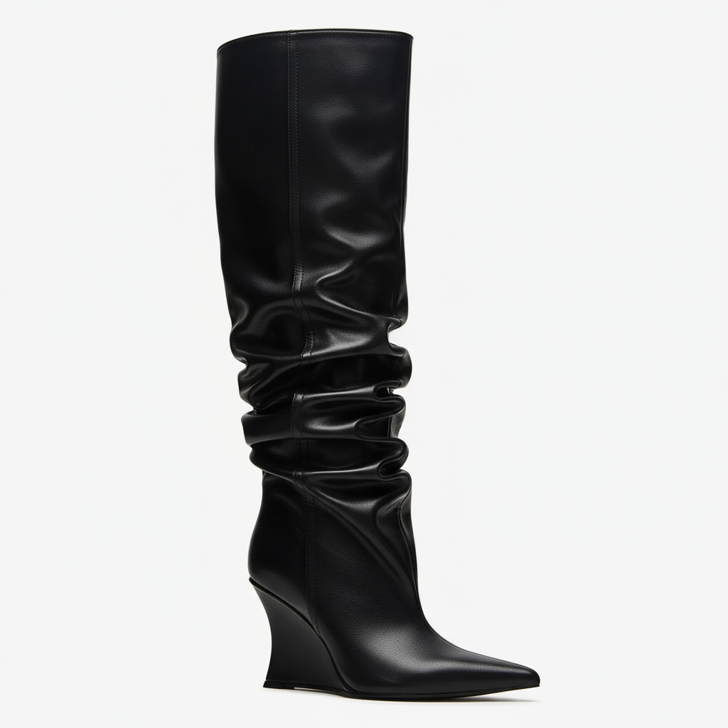 Step into elegance with our unique women's knee-high boots, crafted from premium lacquered and featuring a chic wrinkled design. These exclusive boots not only elevate your style but also complement various outfits, making them a must-have in your wardrobe.