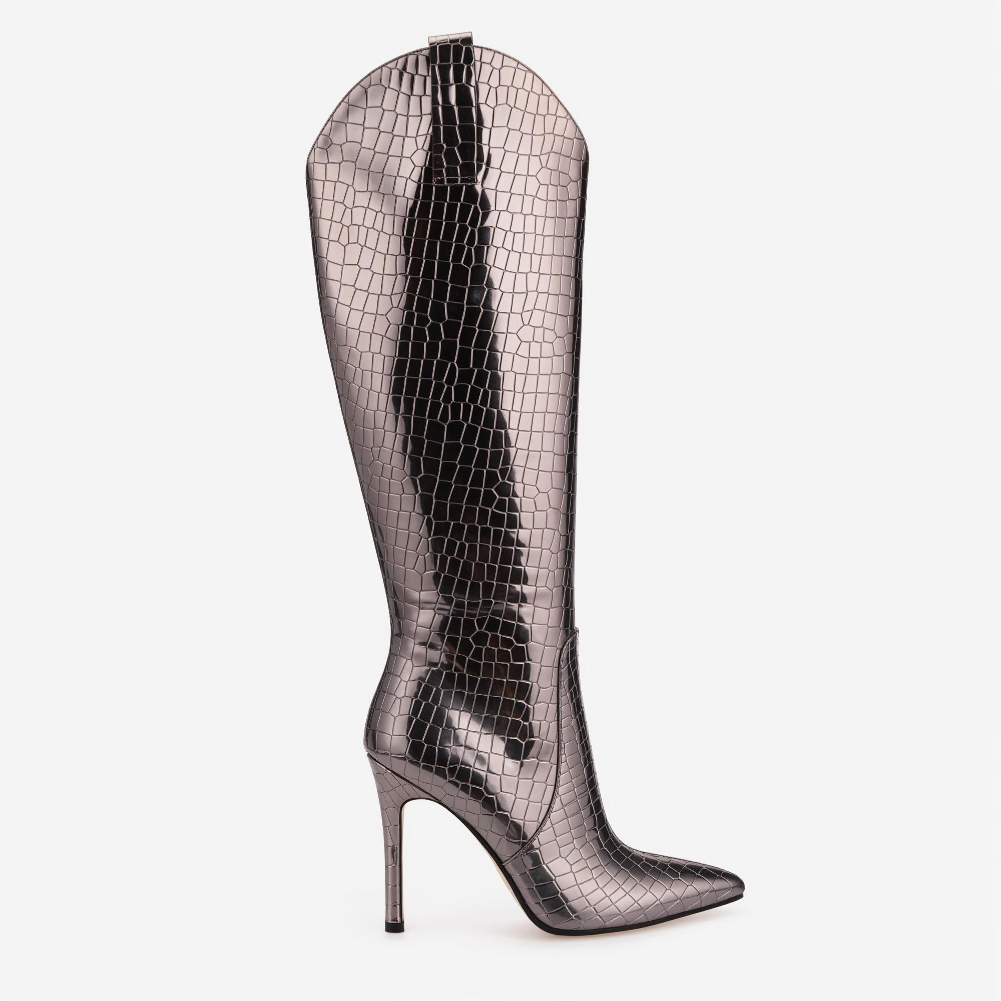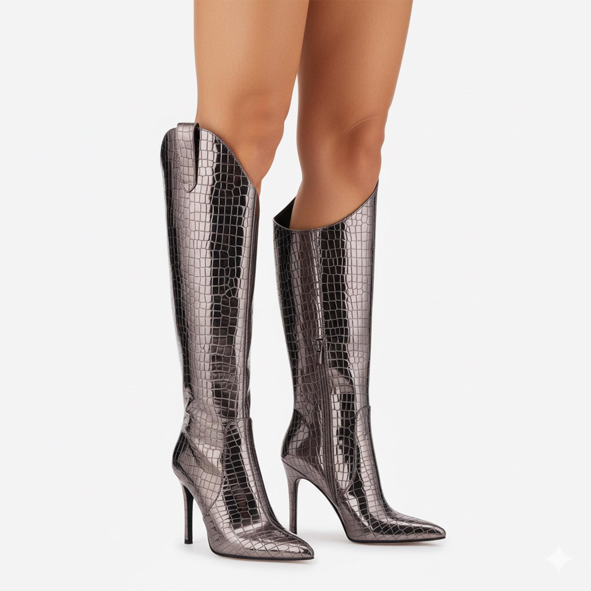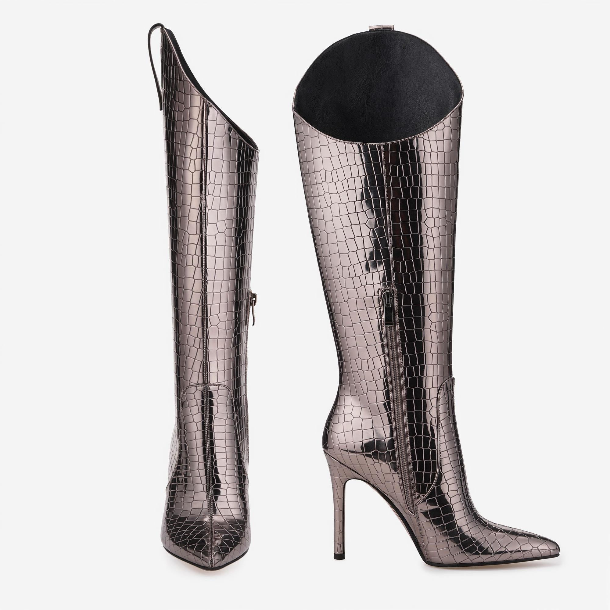 Unleash Your Inner Diva: These Knee-High Fashion Boots exemplify sophistication with their unique metallic glossy finish and pointed toe design. Crafted from premium materials, these boots showcase an exclusivity that sets you apart at parties, performances, and events.