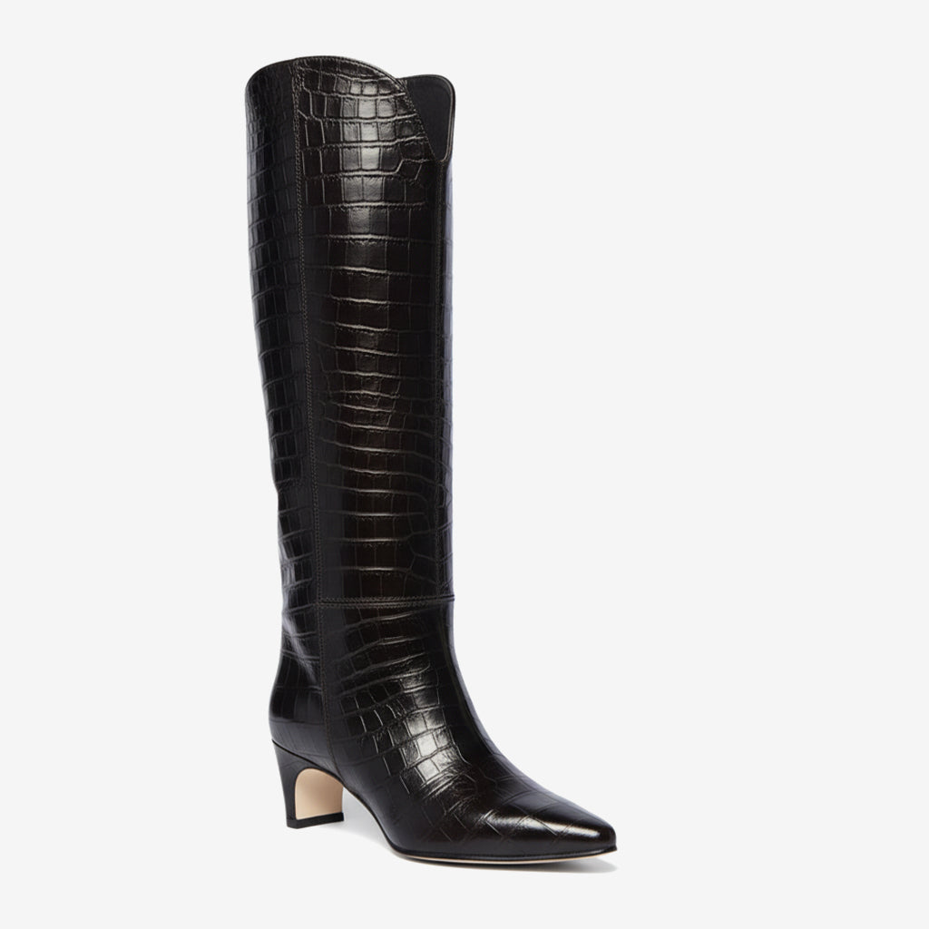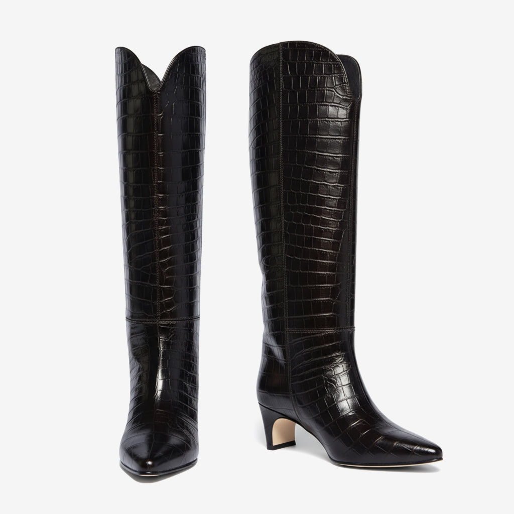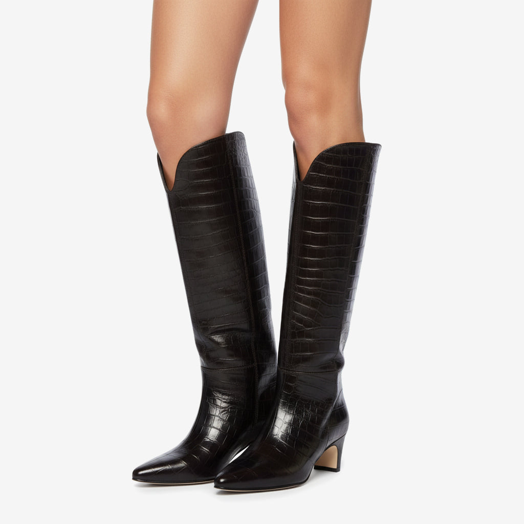 Style them easily with both work attire and chic evening dresses, making them your go-to versatile footwear choice. Slip into these pointed toe beauties and make a statement wherever you go. Be it a busy day at the office or a delightful night out, our knee-high boots are designed to meet all your fashion needs.
