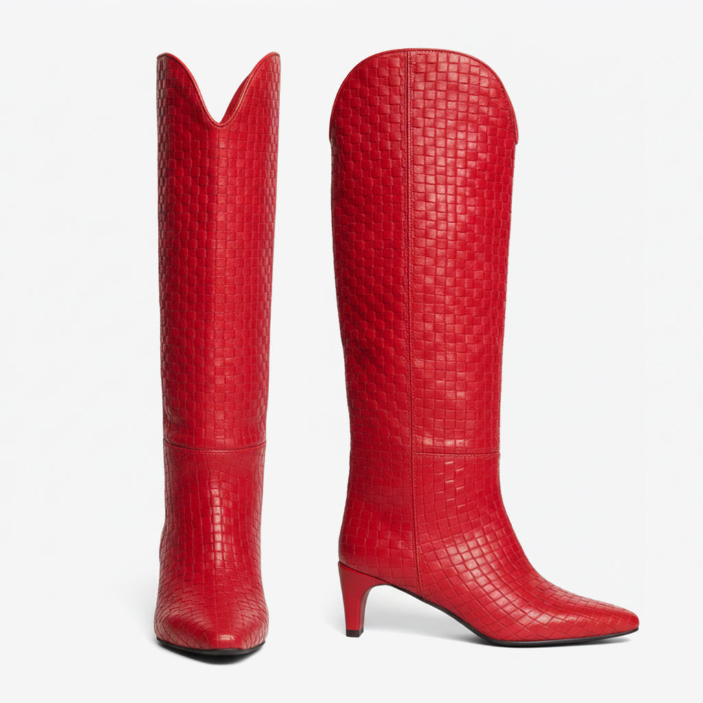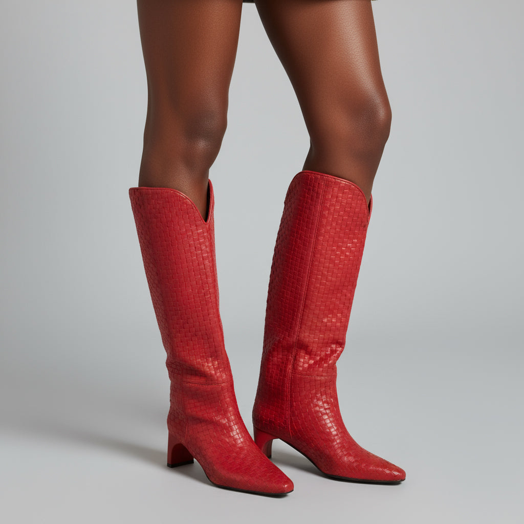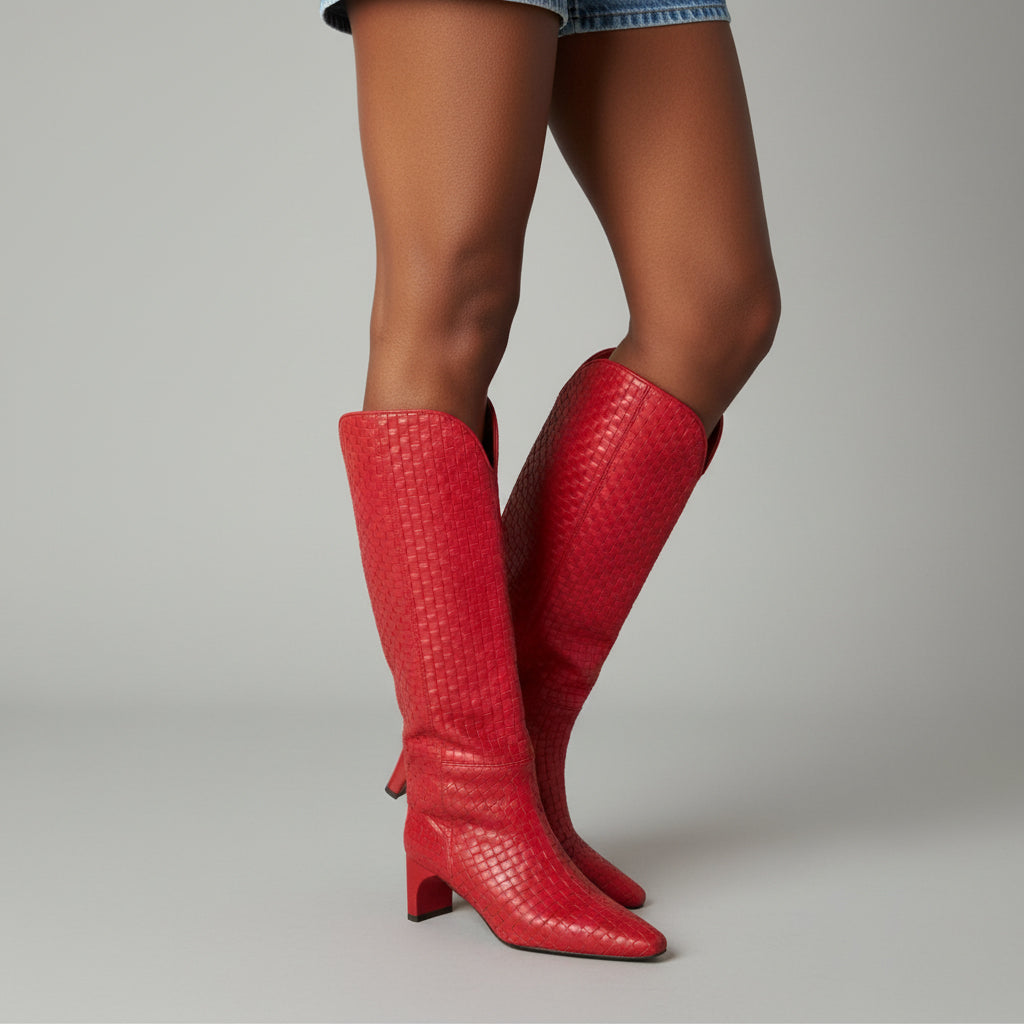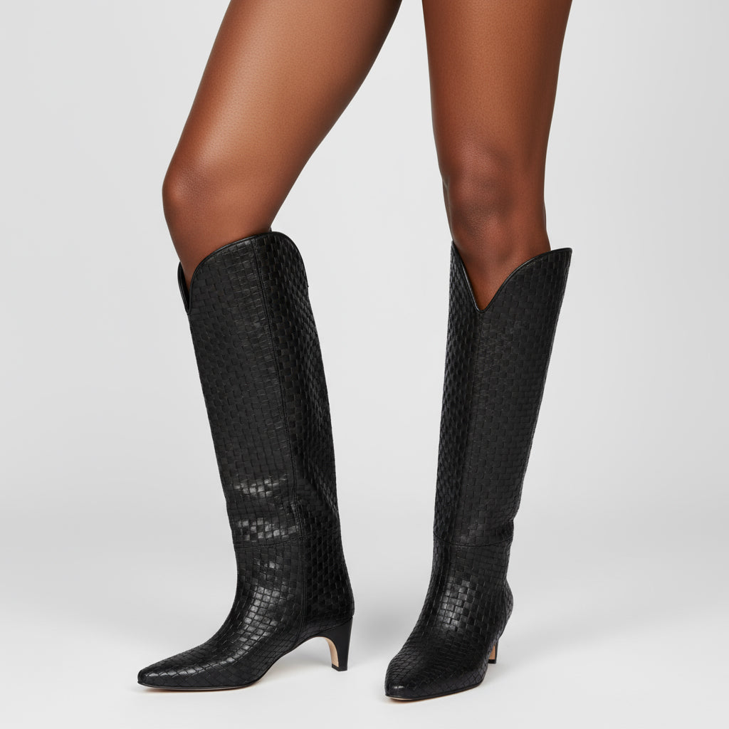 Elevate your style with our Knee High Fashion Boots for Women, expertly crafted with unique craftsmanship. The exquisite woven pattern adds a touch of sophistication, while the hand-finished details ensure every pair is made with precision and care. These boots showcase a perfect blend of aesthetics and functionality, making them an essential addition to your wardrobe.
