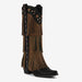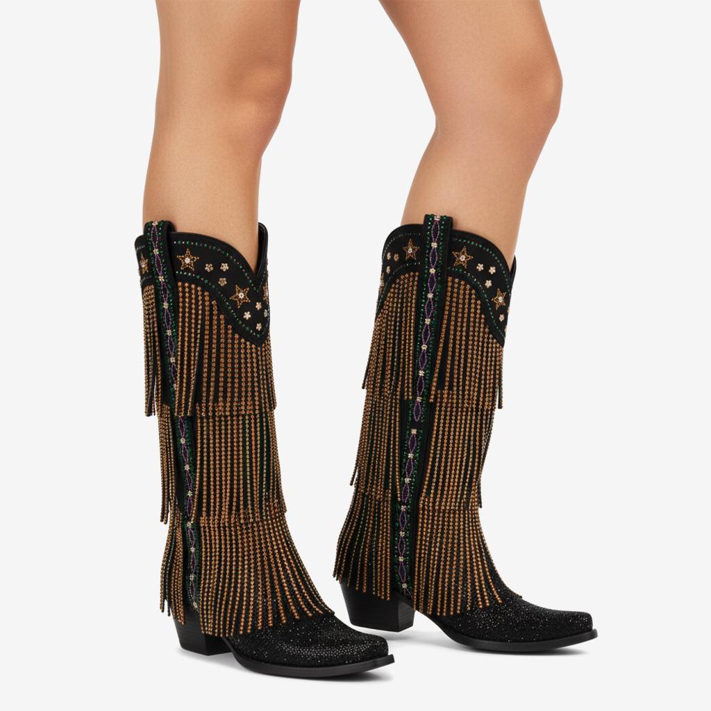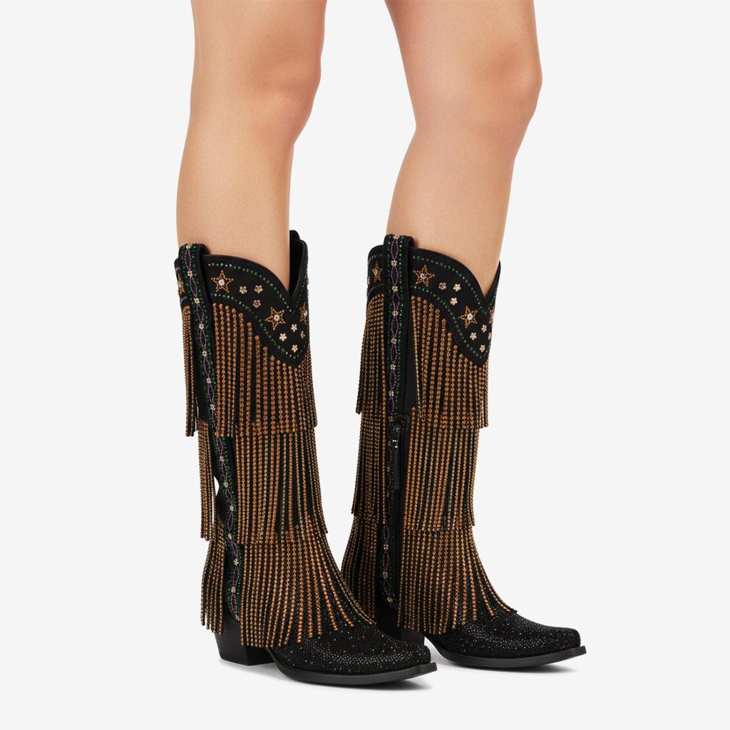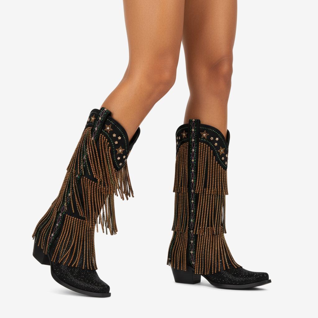Elevate your style with our Knee-High Fringe Boots, expertly handcrafted from premium faux suede that exudes luxury. Each pair features stunning fringe details and sparkling rhinestones that catch the light, making these boots the perfect statement piece for any occasion.