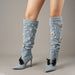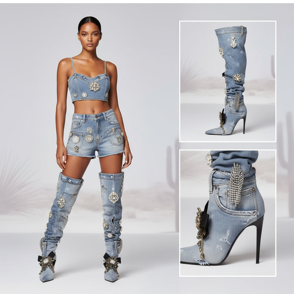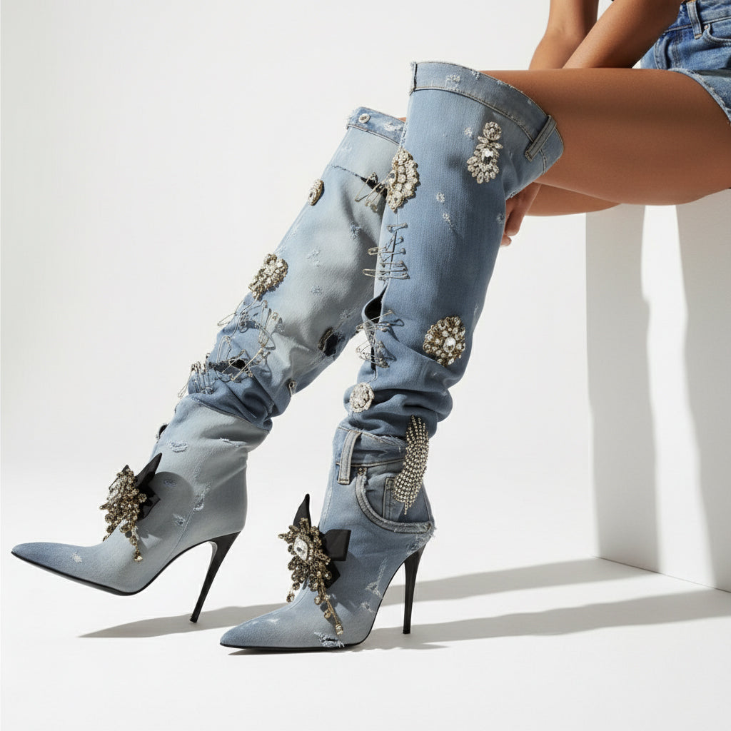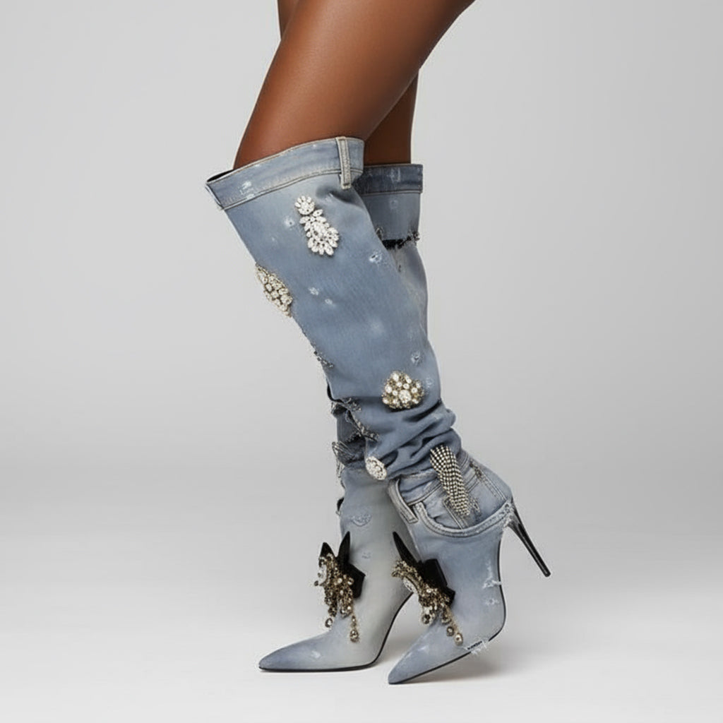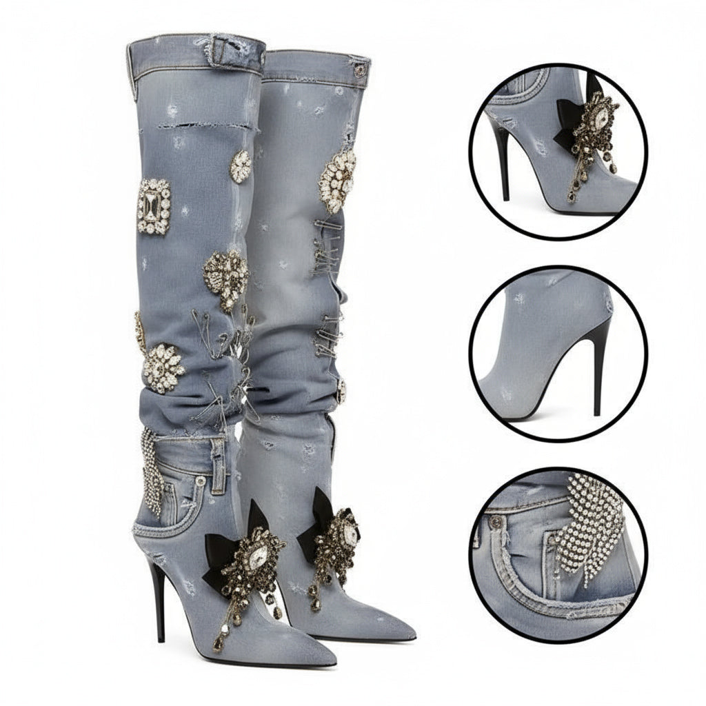 Step into a world of sophistication with our Knee-high Fashion Ripped Denim Boots. Crafted from luxurious denim, these boots stand out with their stunning jewel embellishments and sleek pointed-toe design, offering a unique blend of elegance and style.