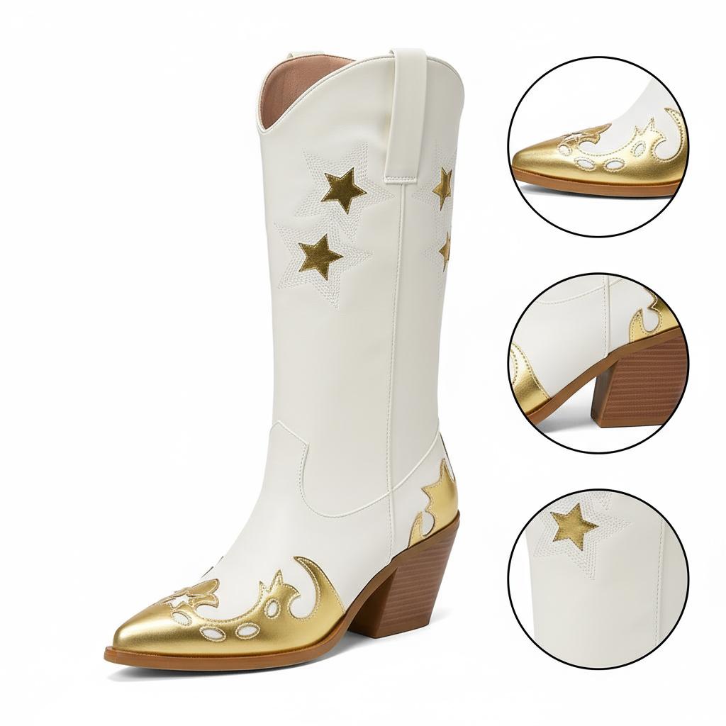 Composition: Vegan Leather Elevate Your Style with Unique Design: Our Off White Star Metallic Gold Applique Wide Mid Calf Boots seamlessly blend Western tradition with modern flair. Crafted from premium PU with a stunning star motif, these boots redefine casual chic while celebrating your unique sense of style.