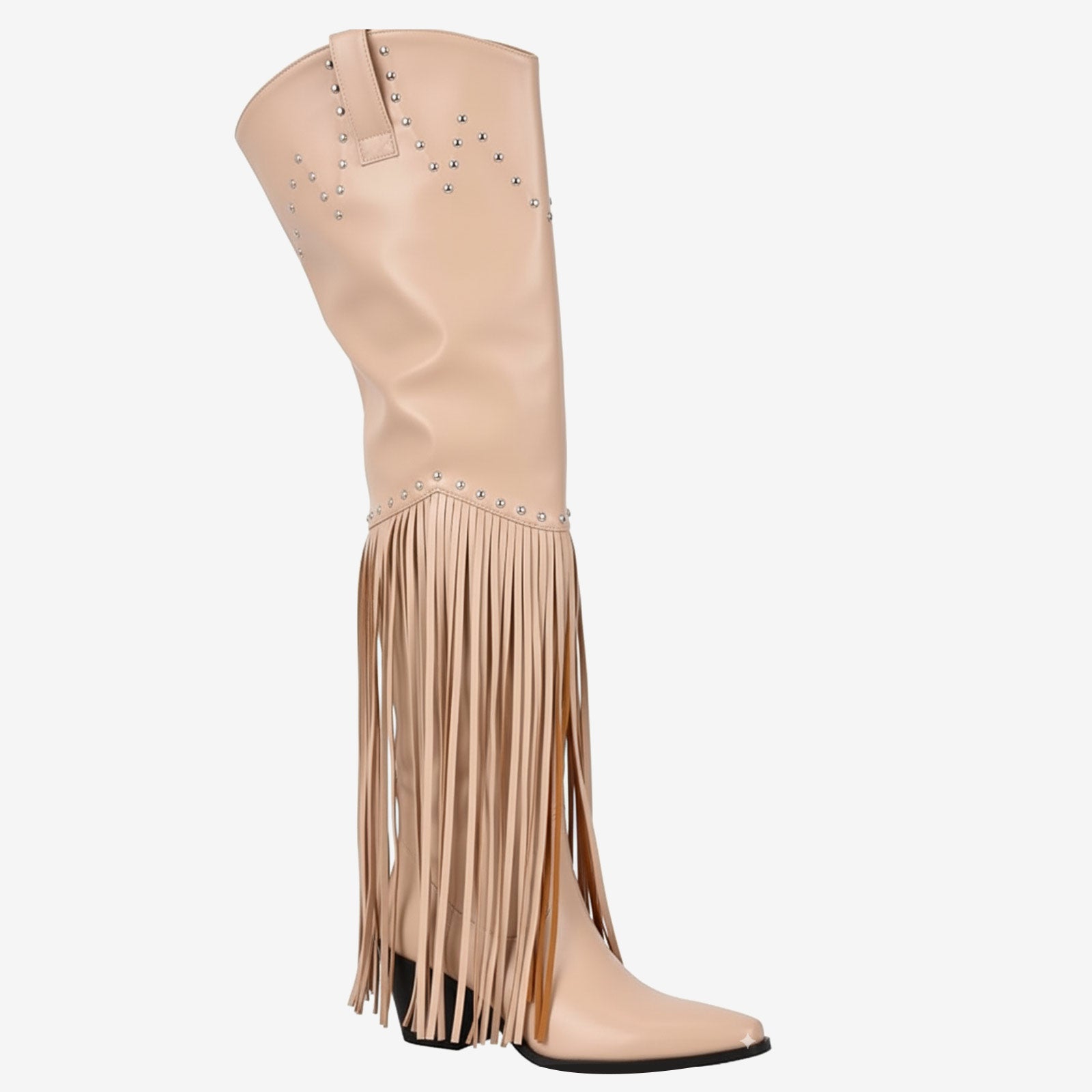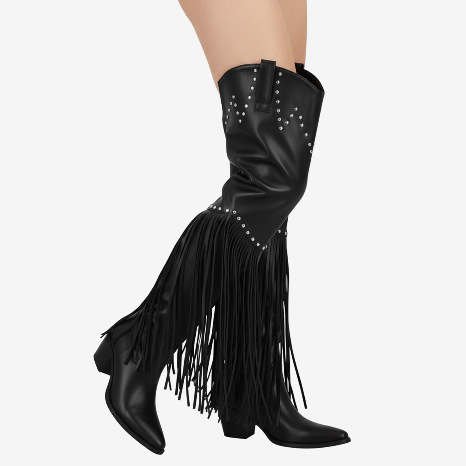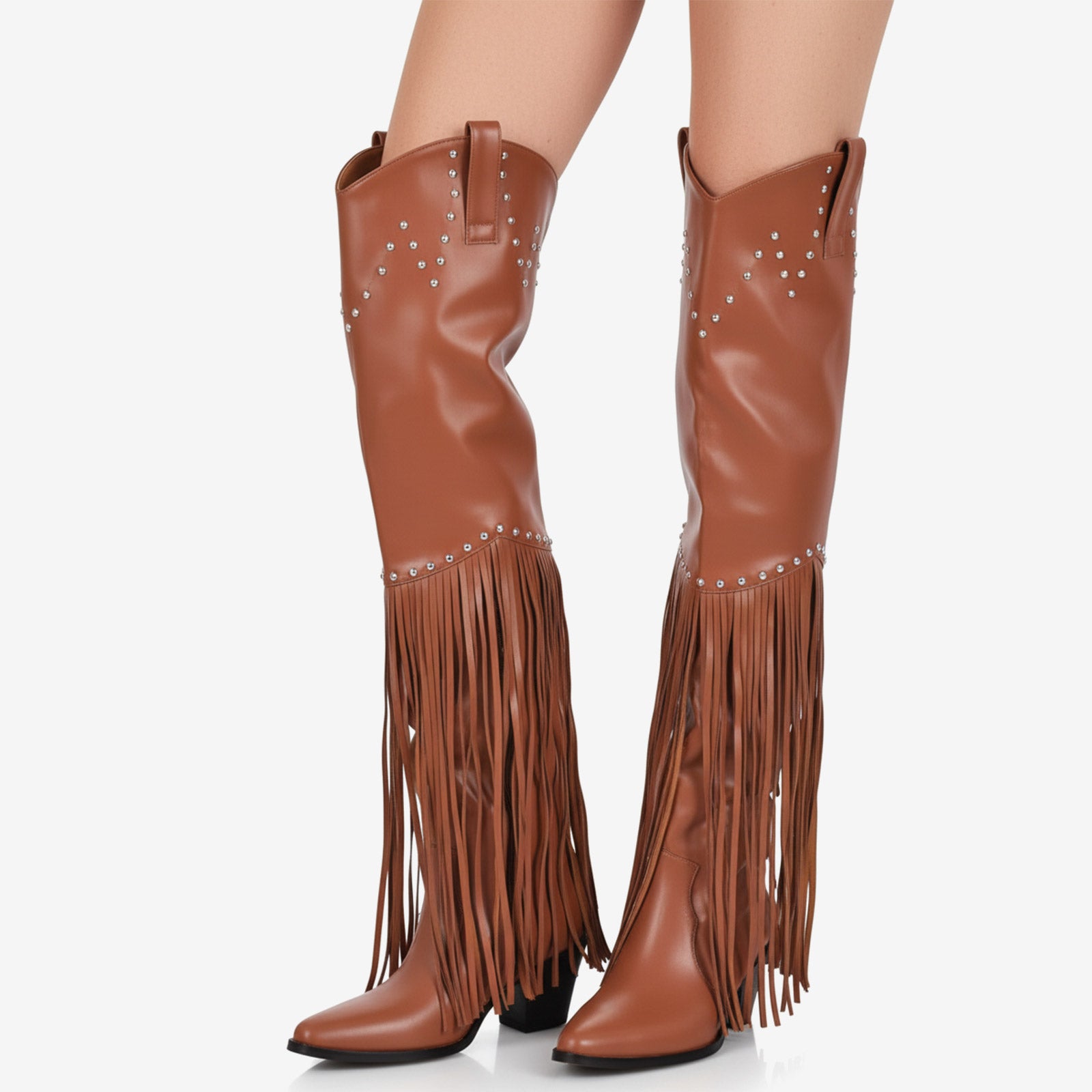Elevate Your Style: Our over-the-knee boots are designed with a unique blend of fringe, studs, and patchwork to create a captivating look that stands out during parties, performances, and runway events.
