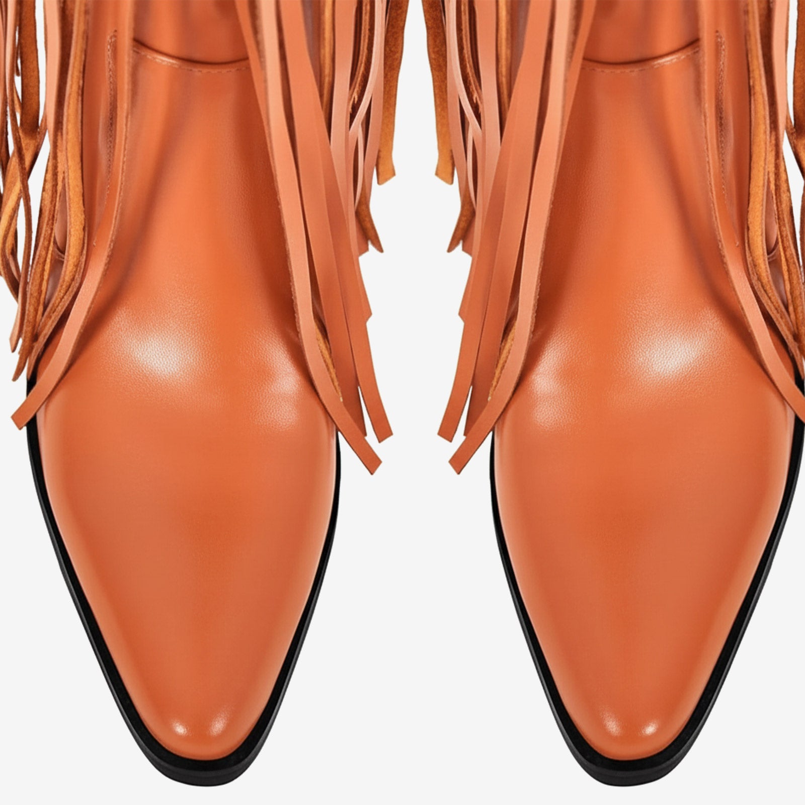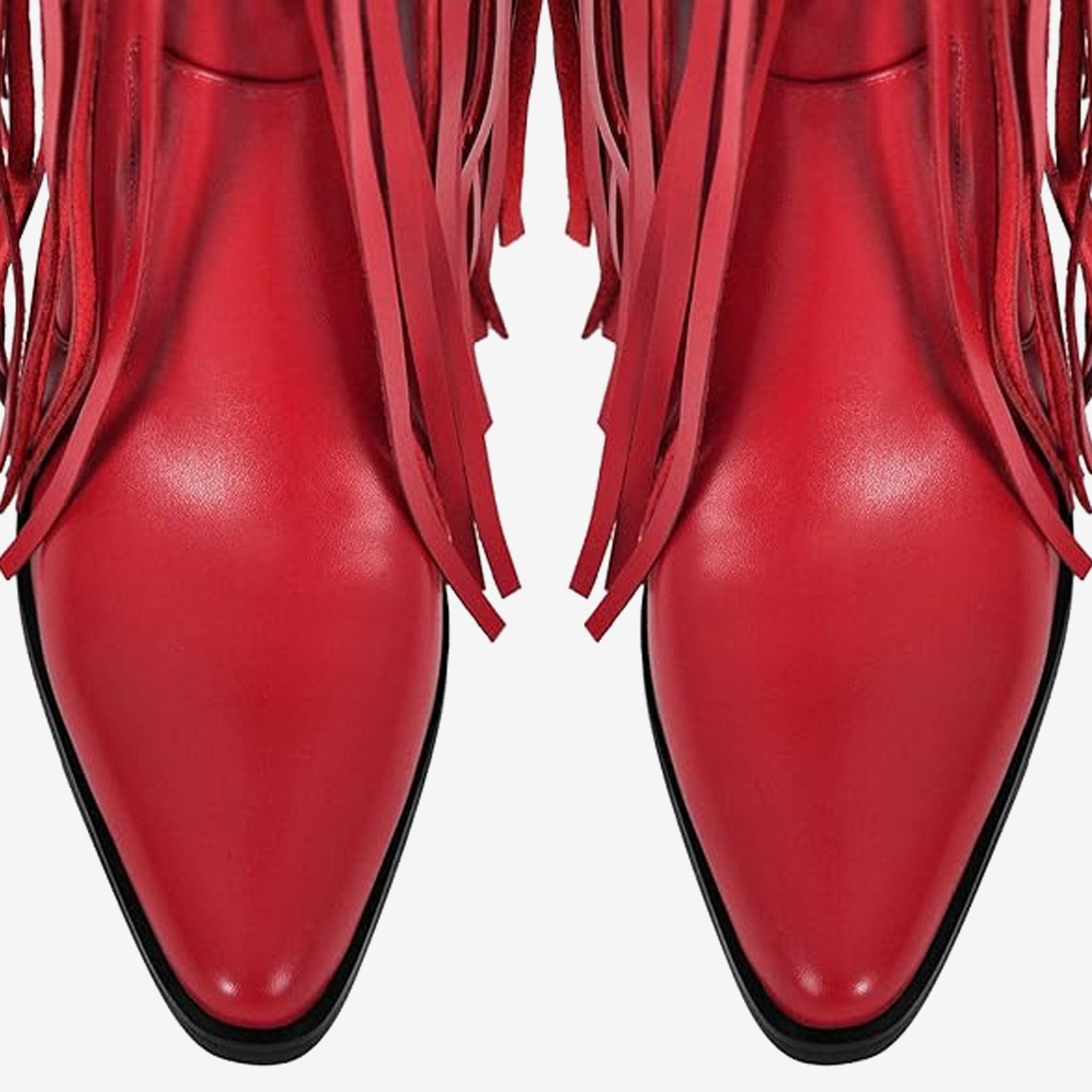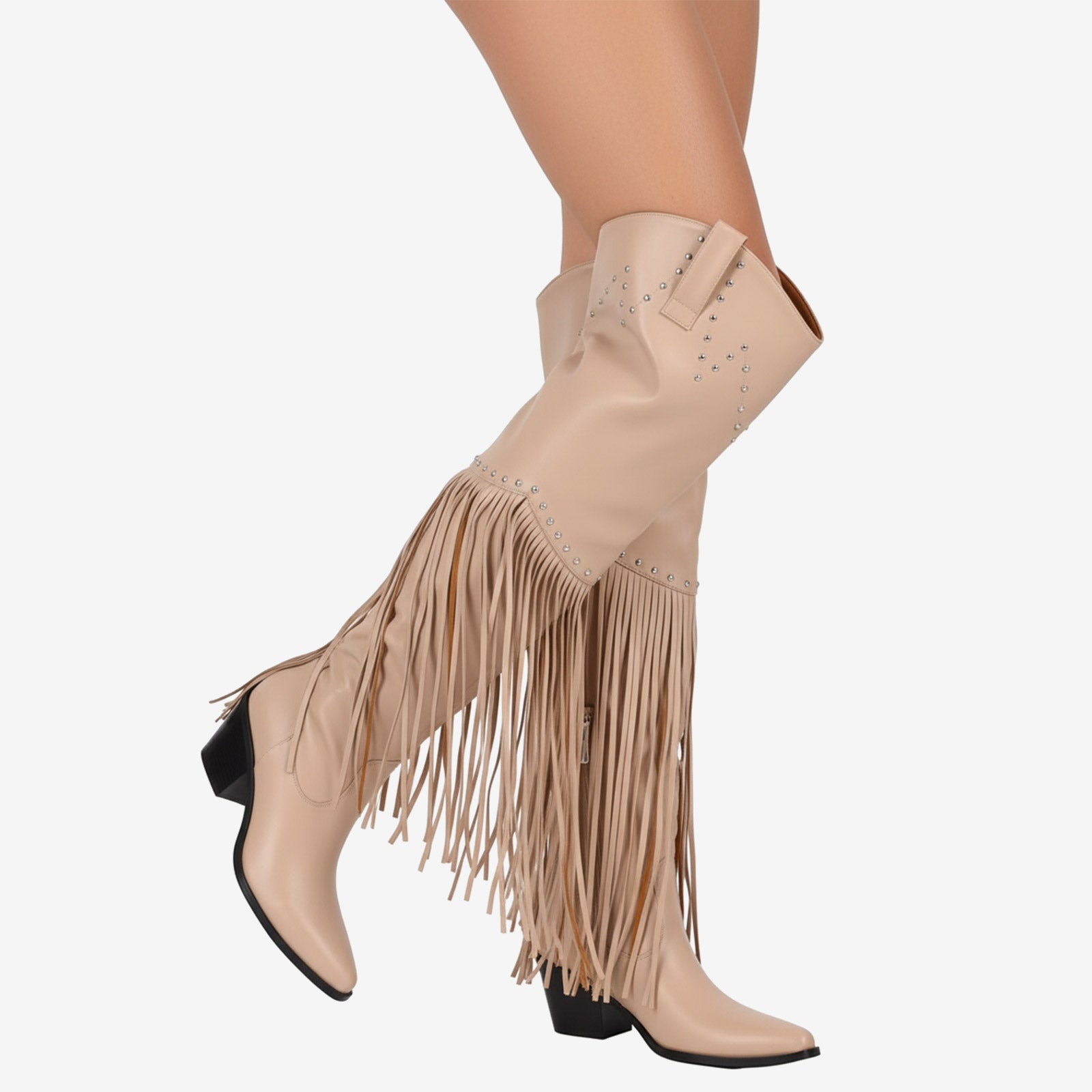 Elevate Your Style: Our over-the-knee boots are designed with a unique blend of fringe, studs, and patchwork to create a captivating look that stands out during parties, performances, and runway events.