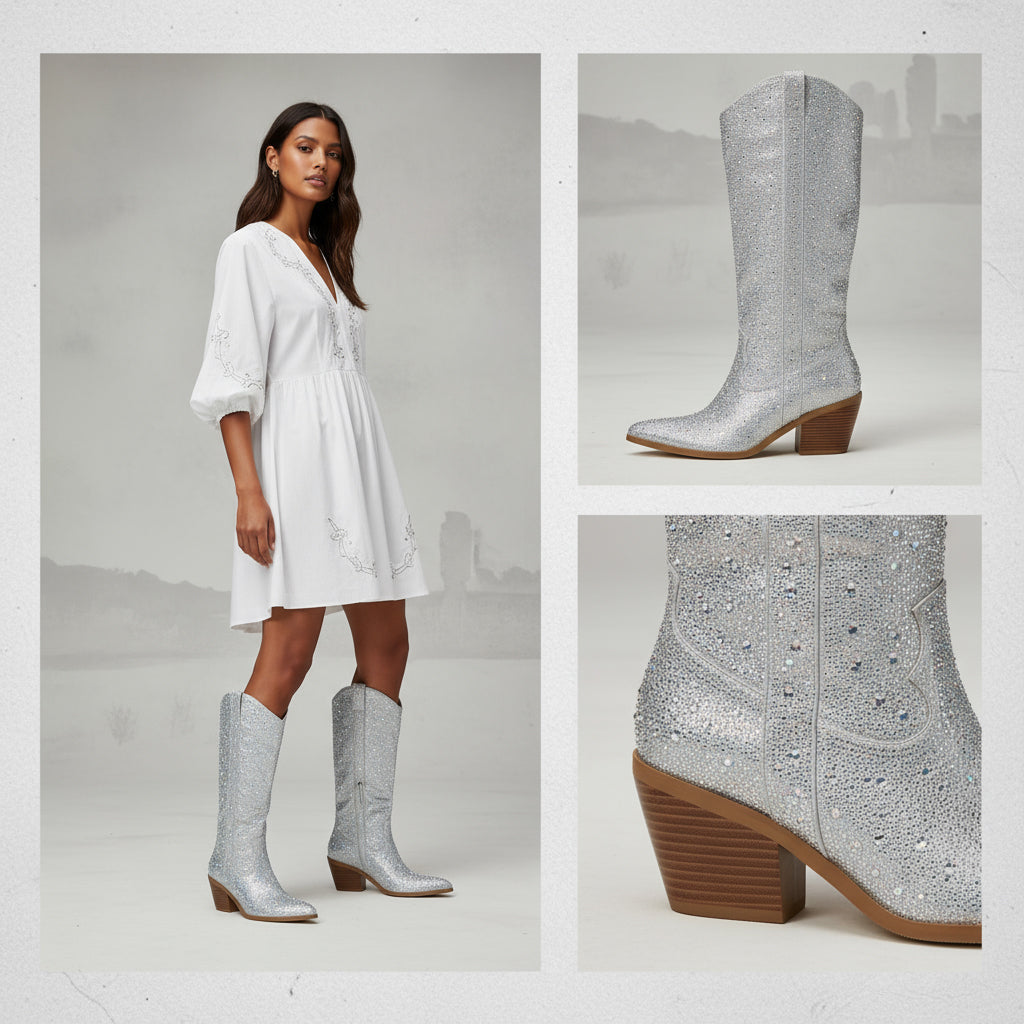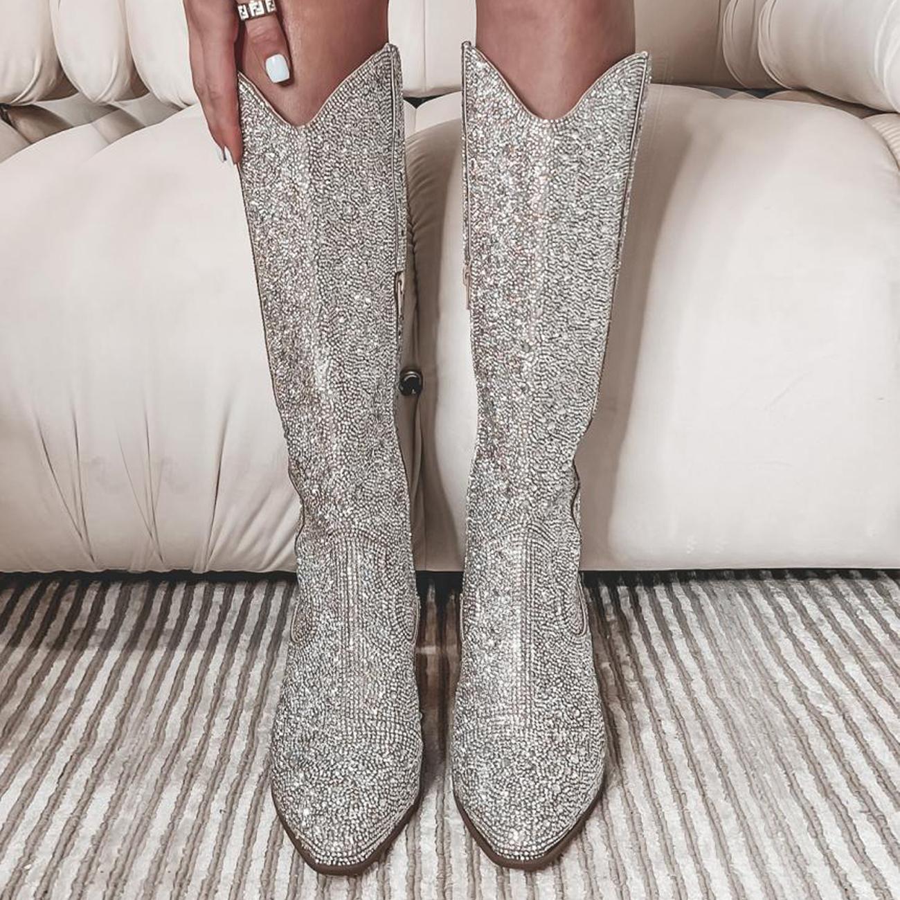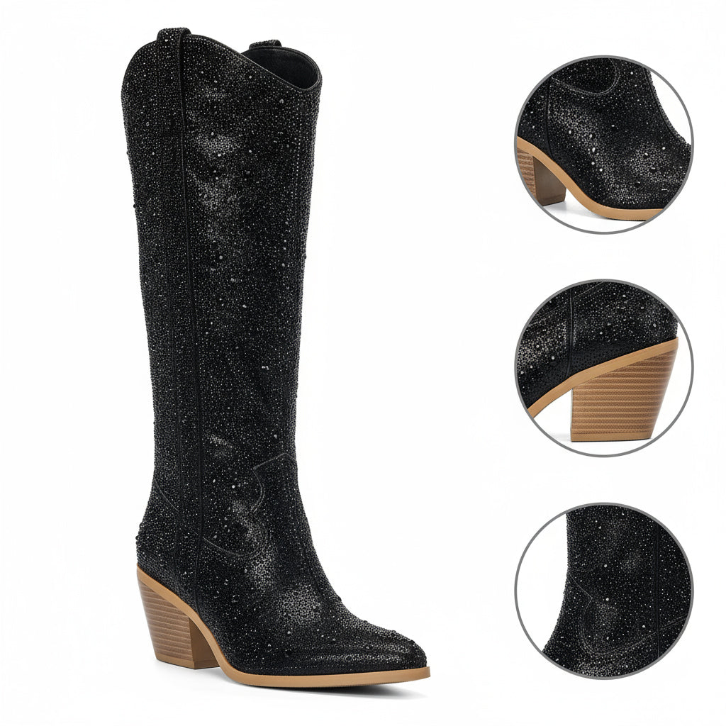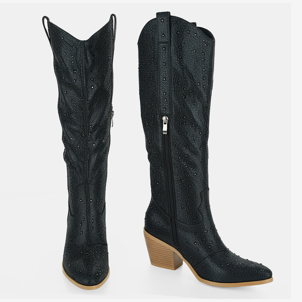 Elevate your style with our Premium Rhinestone Mid Calf Cowboy Boots. Crafted from high-quality PU leather, these boots redefine durability and fashion. Designed with an elegant chunky heel for exceptional stability, they offer both comfort and confidence with every step. Key Features: The mid-calf silhouette, paired with a chic design, makes these boots a staple in any fashion-forward wardrobe. The chunky heel measures 2.17 inches, allowing for both style and safety during your outings. With a boot height of 13 inches, they provide ample coverage and support without sacrificing looks. Whether paired with a dress for an elegant evening or jeans for a trendy casual look, these boots are destined to become your favorite go-to. Embrace your adventurous spirit while staying comfortable and stylish in any setting. Step into a world of fashion and flair—choose our Rhinestone Mid Calf Cowboy Boots today!