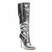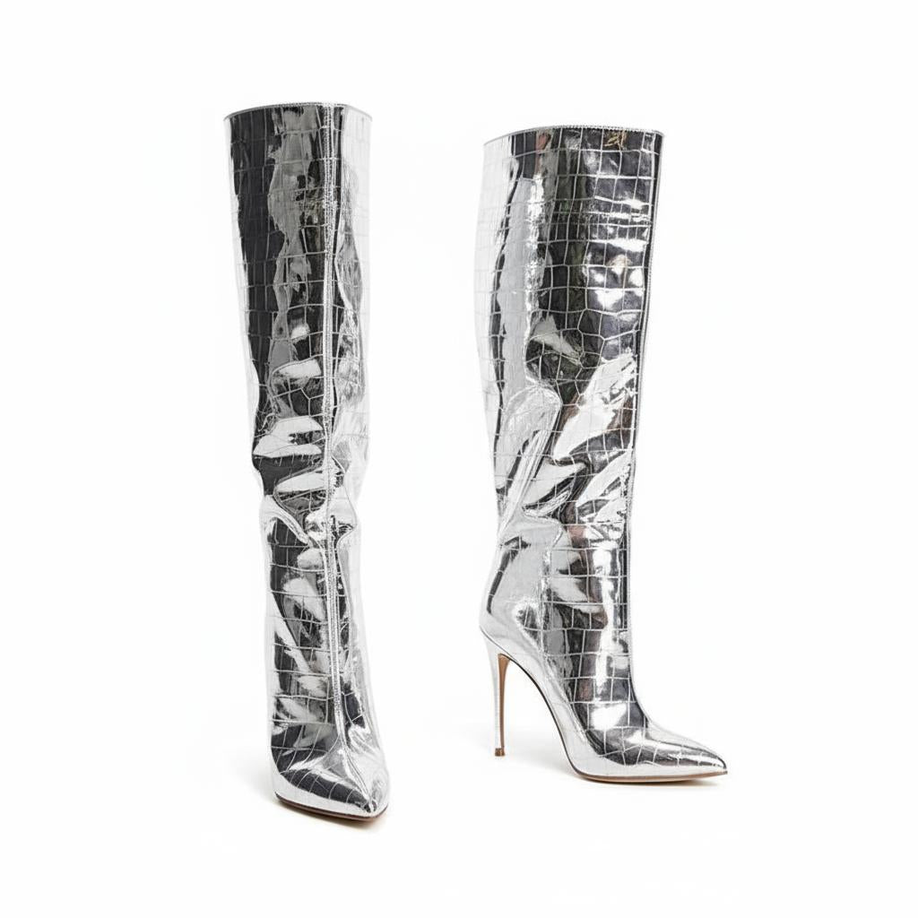 3. Fashionable and Functional Design: The striking mock-croc pattern and metallic silver finish create a contemporary look, while the durable outsole ensures longevity. With a slim high heel measuring 3.75 inches, these boots not only accentuate your legs but also provide stability and style for both casual outings and glamorous occasions.