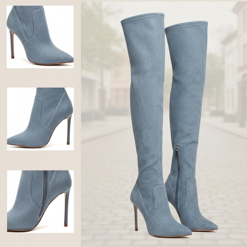 Elevate your fashion game with our Stiletto Over-The-Knee Boots for Women. Crafted from premium denim, these boots deliver a perfect blend of style and durability. The unique over-the-knee design not only flatters your silhouette but also defines your elegance with every step.