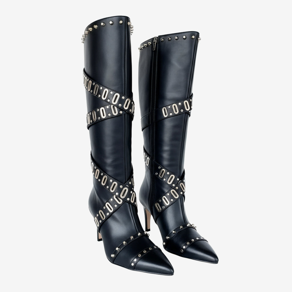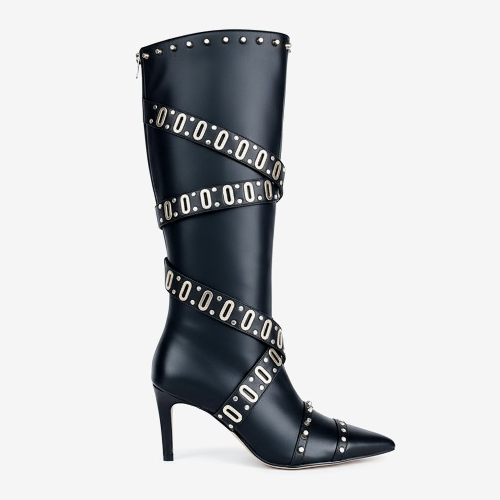 Elevate your style with our Rivet Buckle Studded Pointed-toe High Heel Mid Calf Boots, crafted from luxurious vegan leather. This exclusive design features stylish rivet and stud embellishments that perfectly complement the sleek pointed toe silhouette, adding an elegant touch to any outfit.