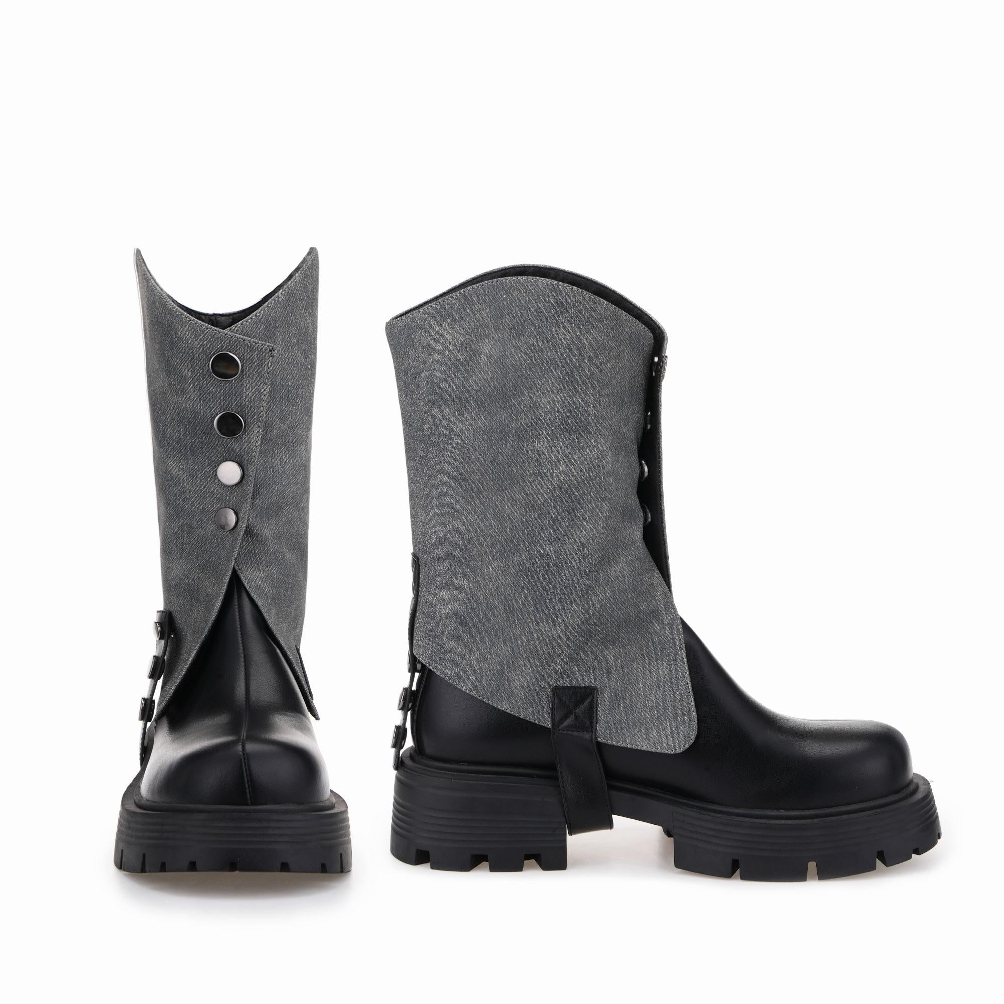 Crafted with precision and an eye for detail, our ankle boots blend classic design with contemporary flair. The unique two-piece construction showcases an exquisite round toe and a striking metallic buckle for an effortless, stylish look. Perfect for any wardrobe, these boots are more than just footwear; they are a statement of fashion.