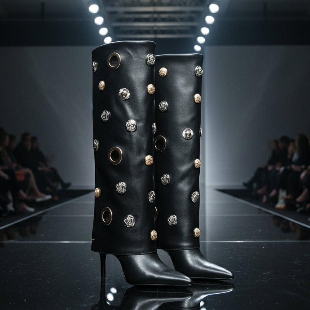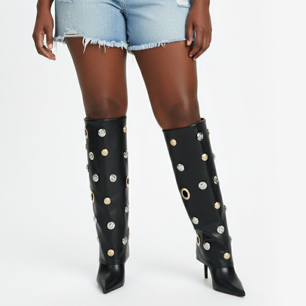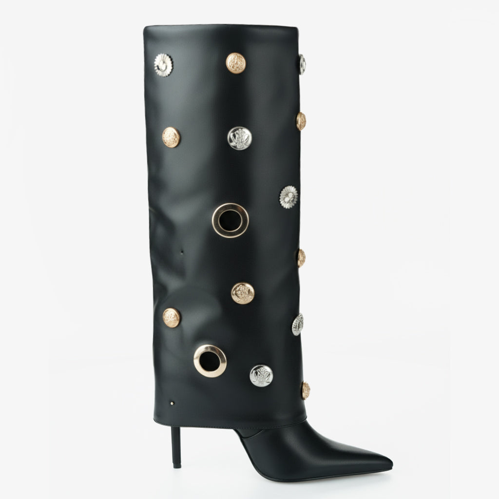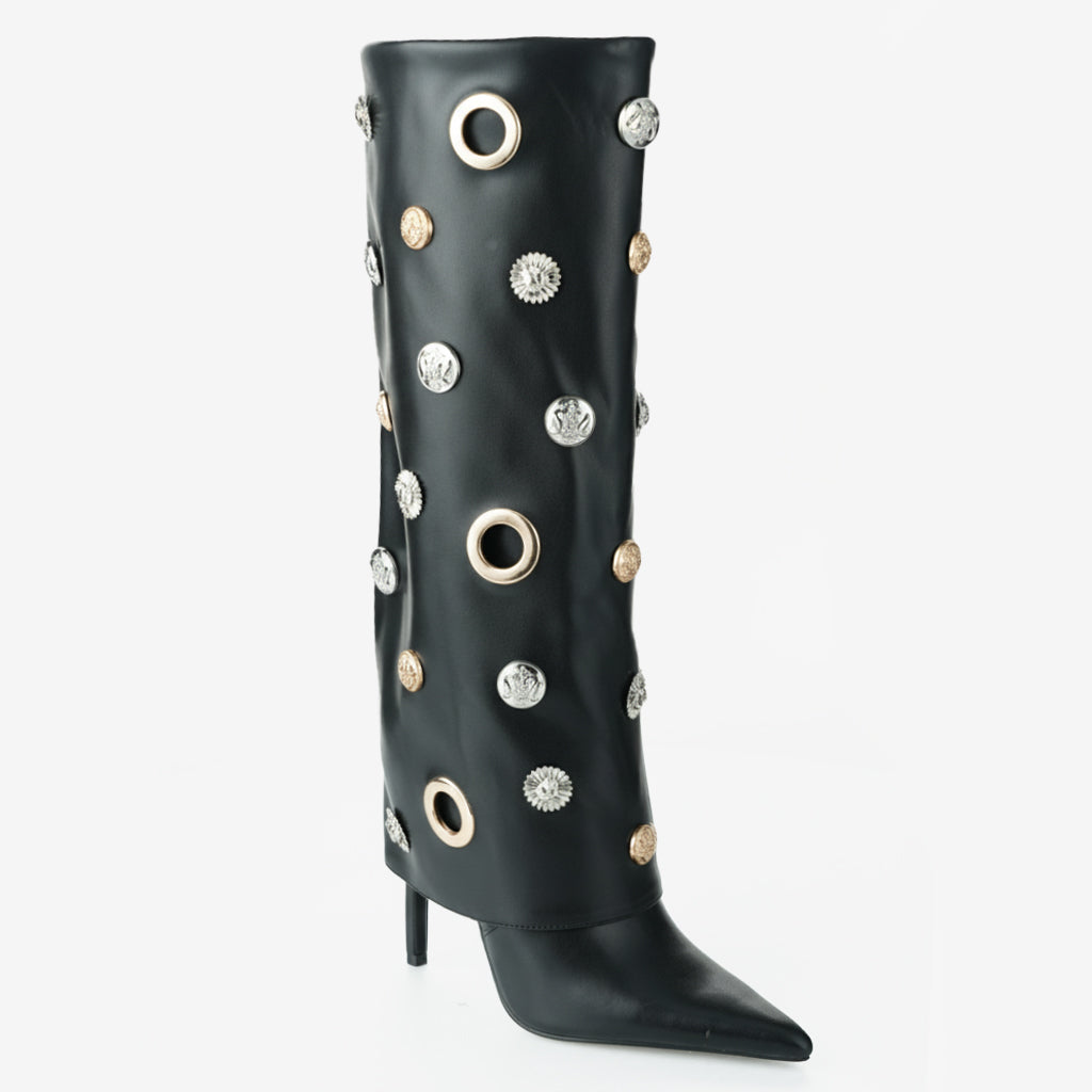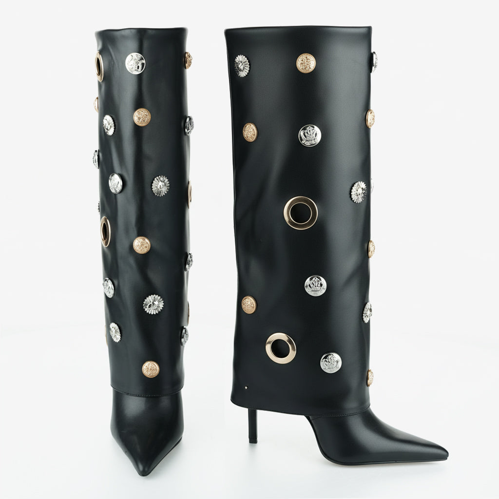 Versatile Styling Options: Perfect for formal gatherings, parties, or casual outings, these stylish boots can be effortlessly paired with dresses, skirts, or fitted jeans. Step into the spotlight and let these boots enhance your fashion statement, no matter the occasion.Elevate your style with our Stylish Knee-High Women's Boots. Crafted from luxurious PU leather, these boots showcase a unique hollow design paired with elegant metal accents, making them perfect for parties, performances, or casual outings.