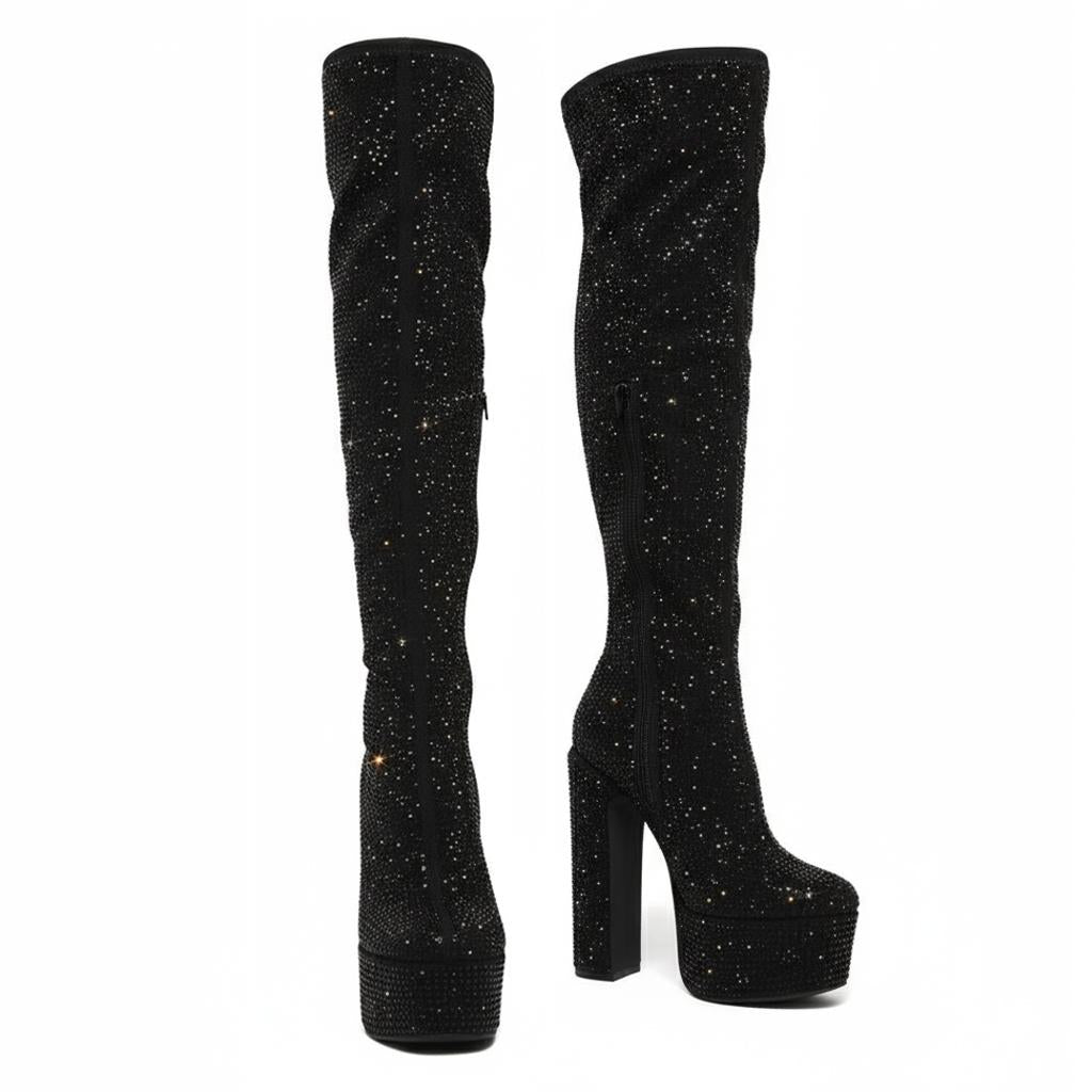 Discover Unmatched Elegance: Our Thigh High Satin Platform Boots blend luxurious craftsmanship with a unique design that celebrates your legs. Handcrafted with high-quality satin, these boots feature exquisite rhinestone embellishments that add a stunning touch of sparkle. The meticulously hand-stitched details reflect our commitment to unique craftsmanship and attention to detail.