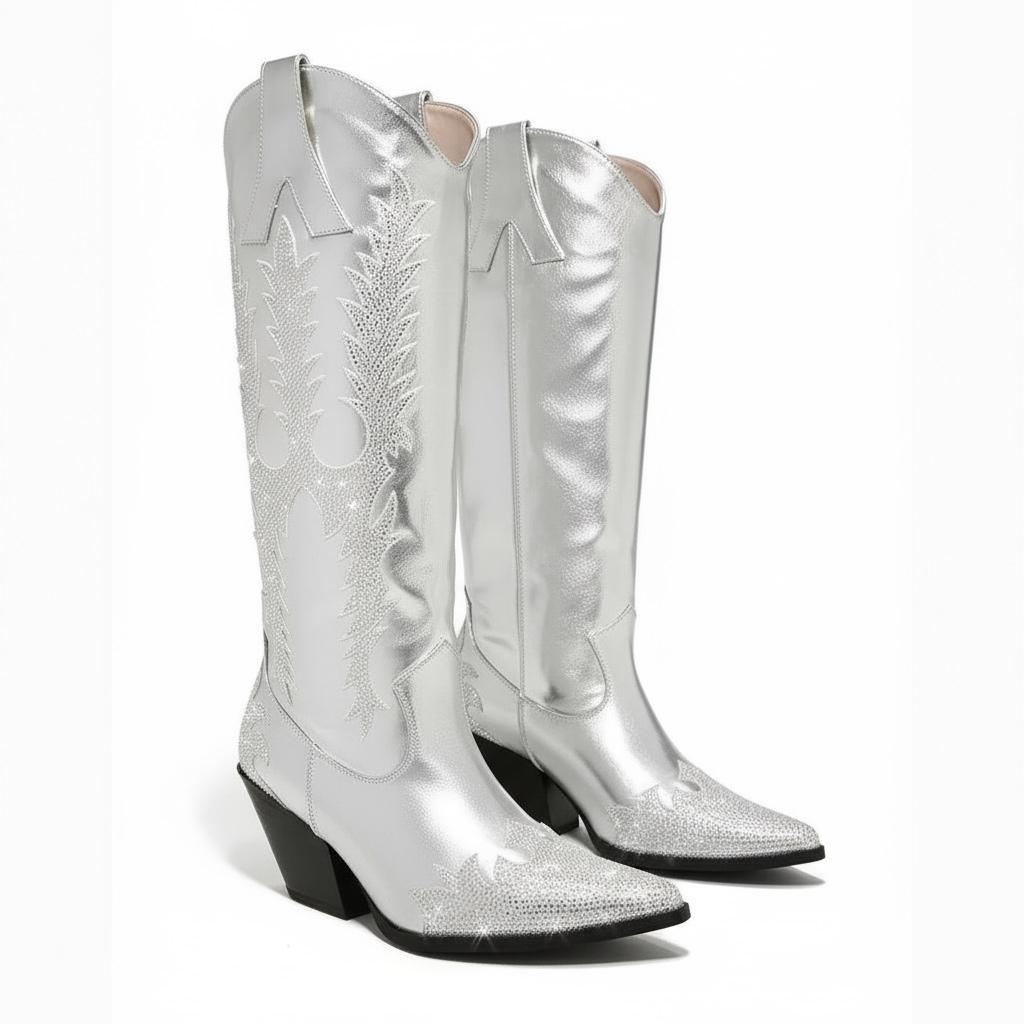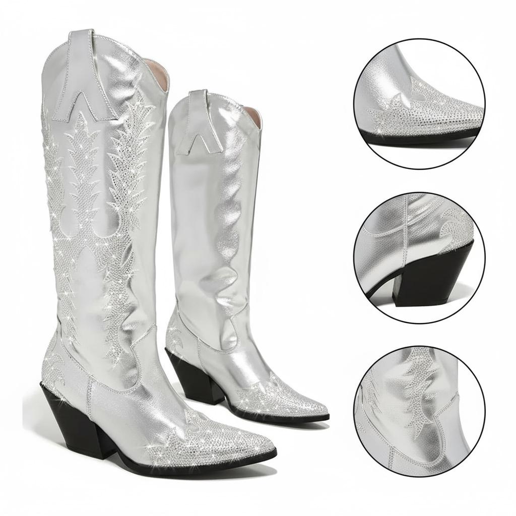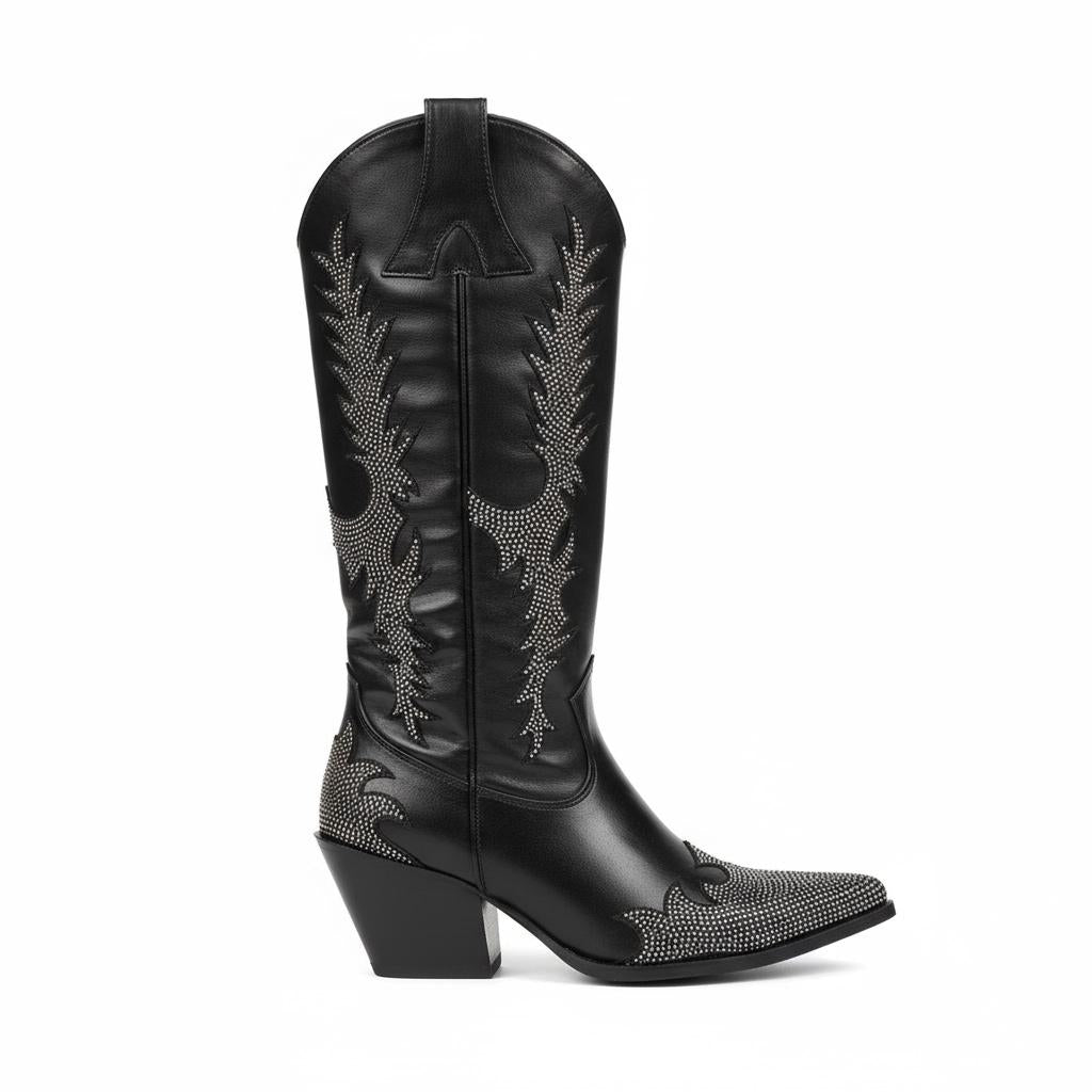 Introducing our Western Chunky Heels Ankle Boots, expertly crafted from genuine grain leather to provide the perfect blend of style and comfort. These boots feature a unique design that combines eye-catching rhinestone embellishments with a modern chunky heel, making them a statement piece for any wardrobe.