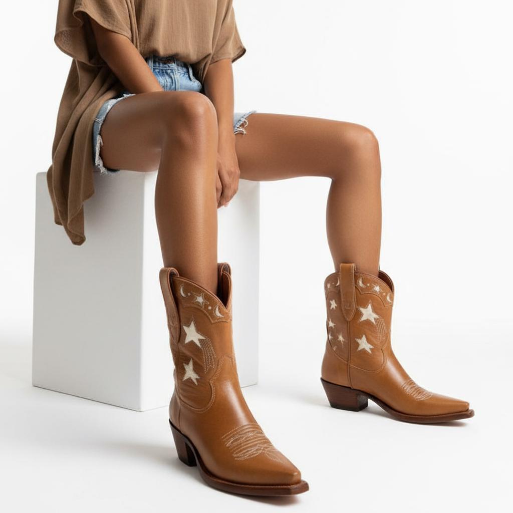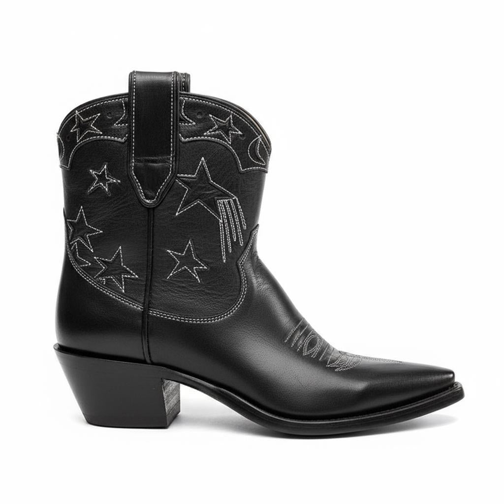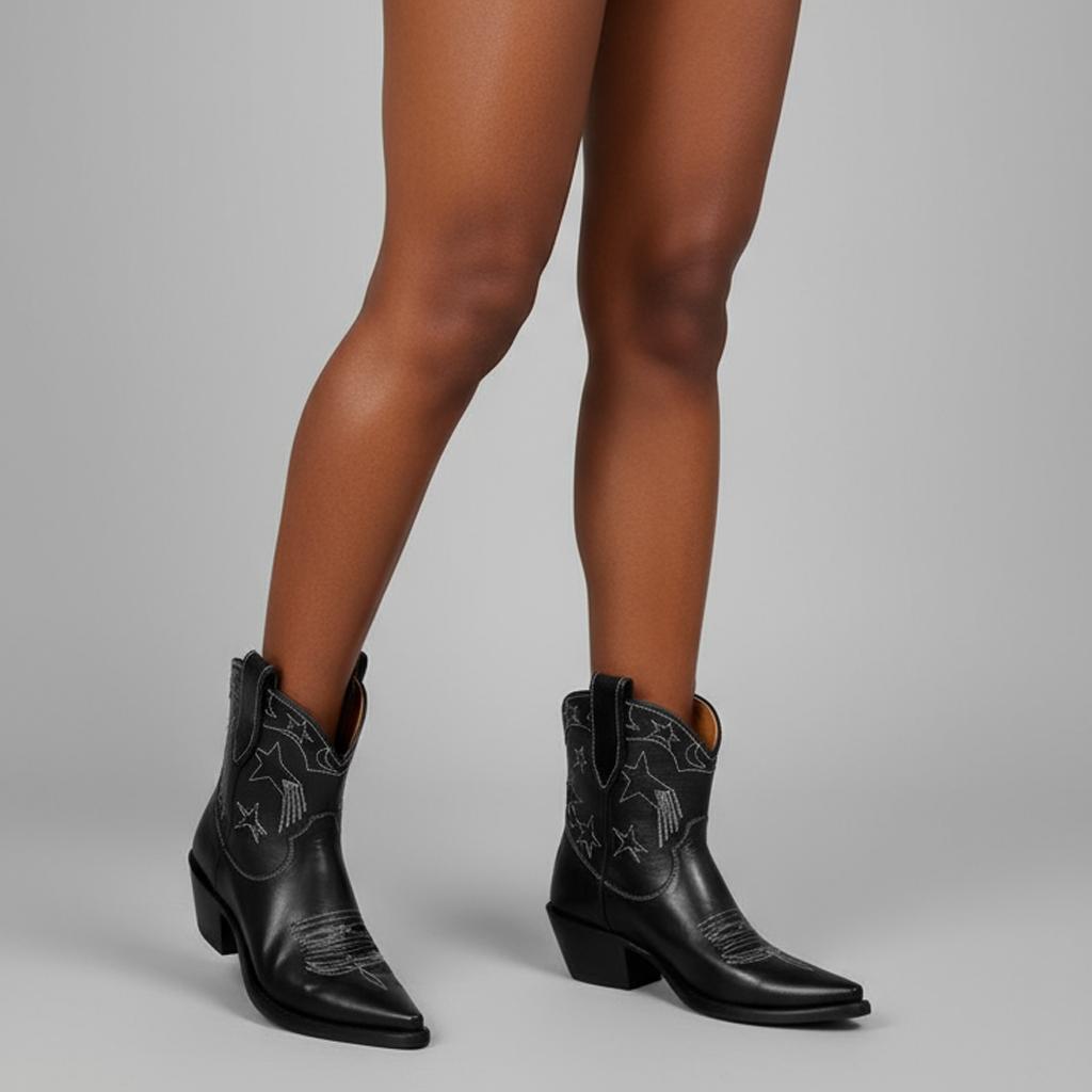 Step into a world of elegance with our Western Cowboy Ankle Boots for Women, crafted from premium full-grain leather for unmatched durability. The unique star appliqué adds a stylish twist, making these boots a standout choice for any fashion-forward individual. Ergonomically designed with a comfortable 2" chunky heel, they offer all-day wear, ensuring you never have to compromise on comfort for style.