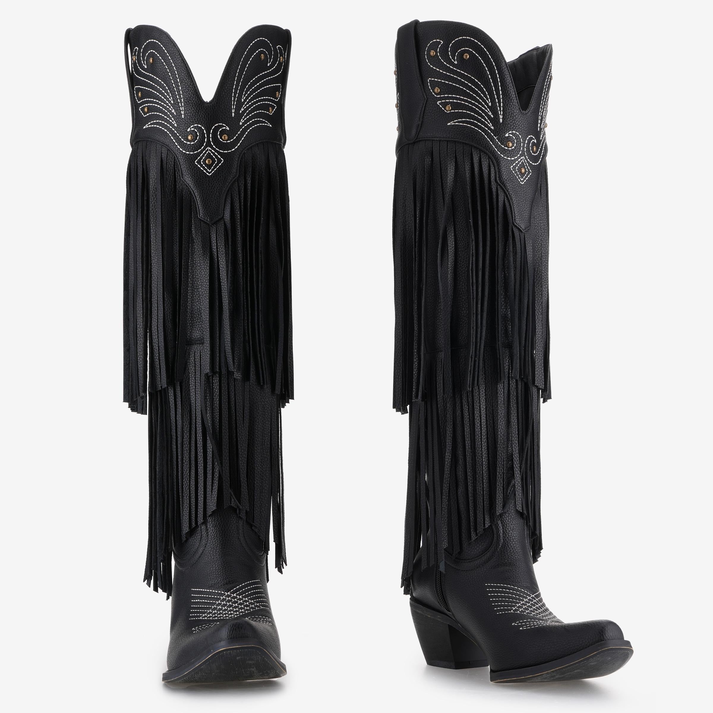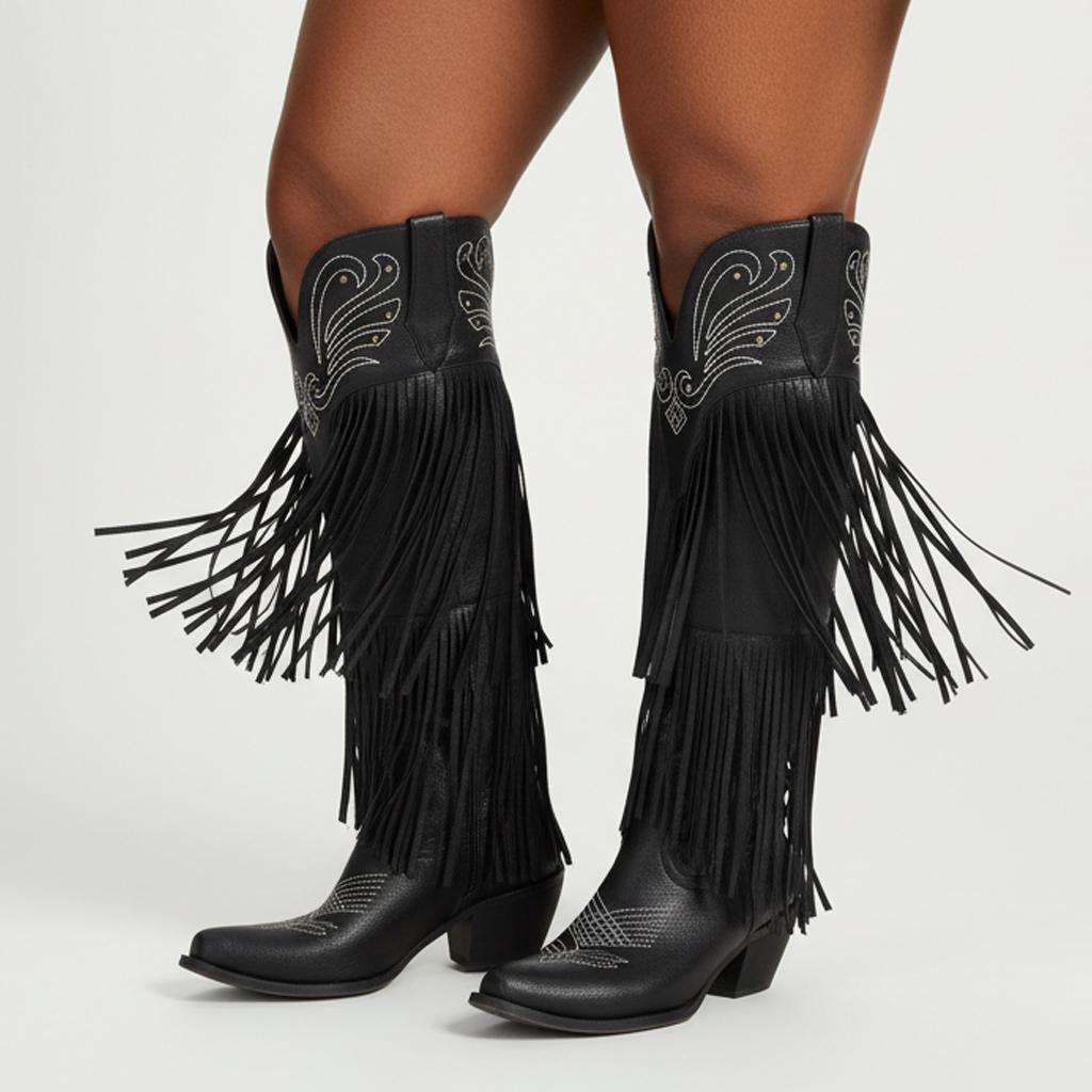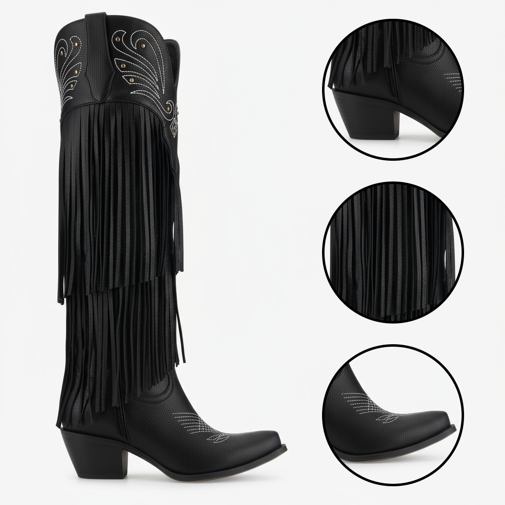 Crafted with a unique blend of fashion and comfort, these stunning over-the-knee western boots redefine modern elegance. The exquisite embroidered details, alongside eye-catching fringes and rivets, set these boots apart, making them the perfect accessory for any stylish wardrobe.