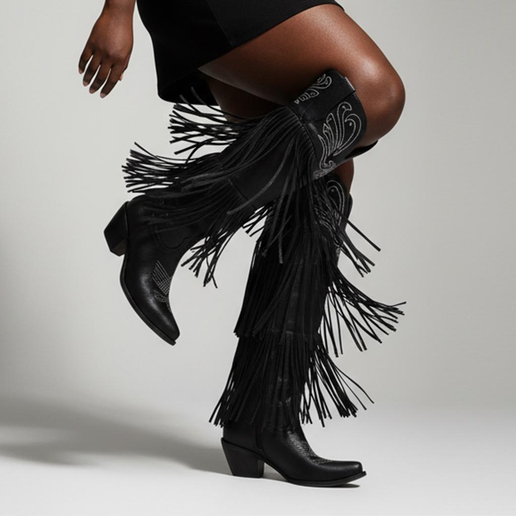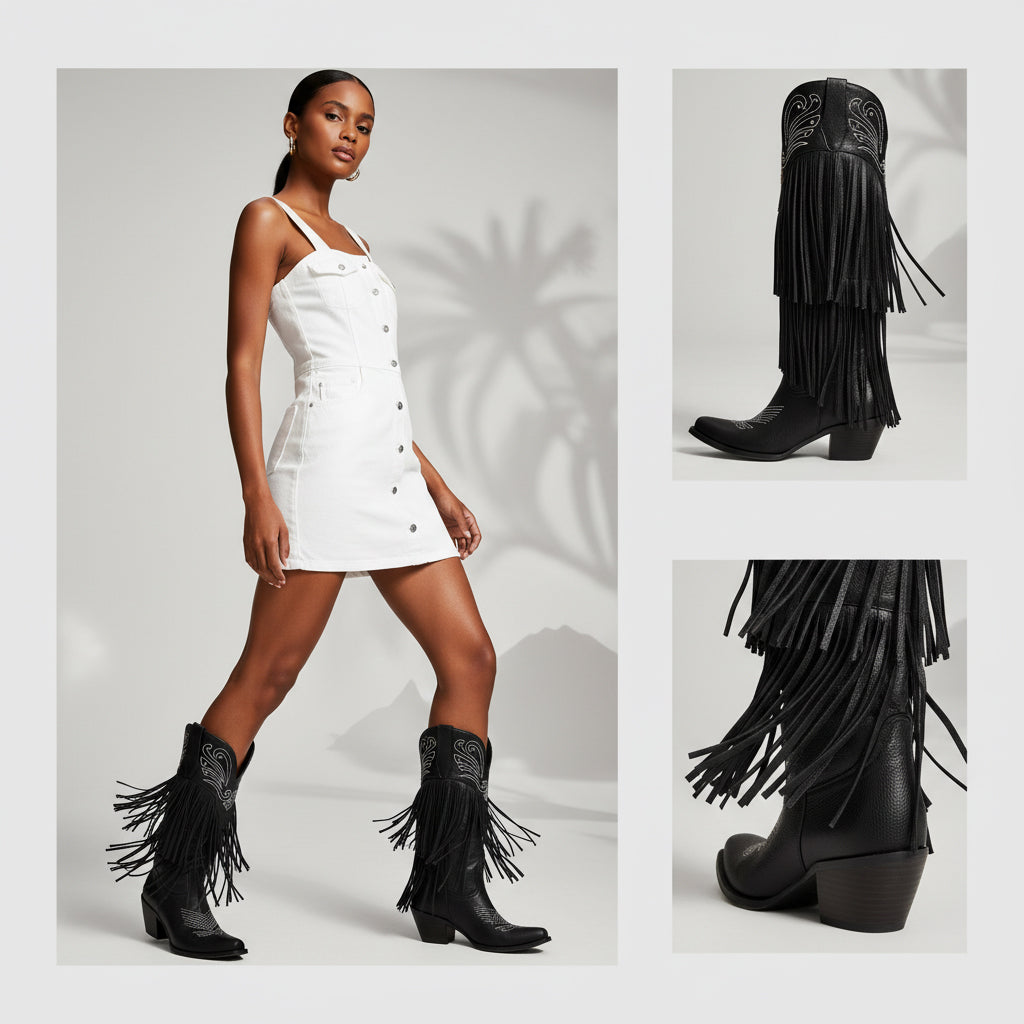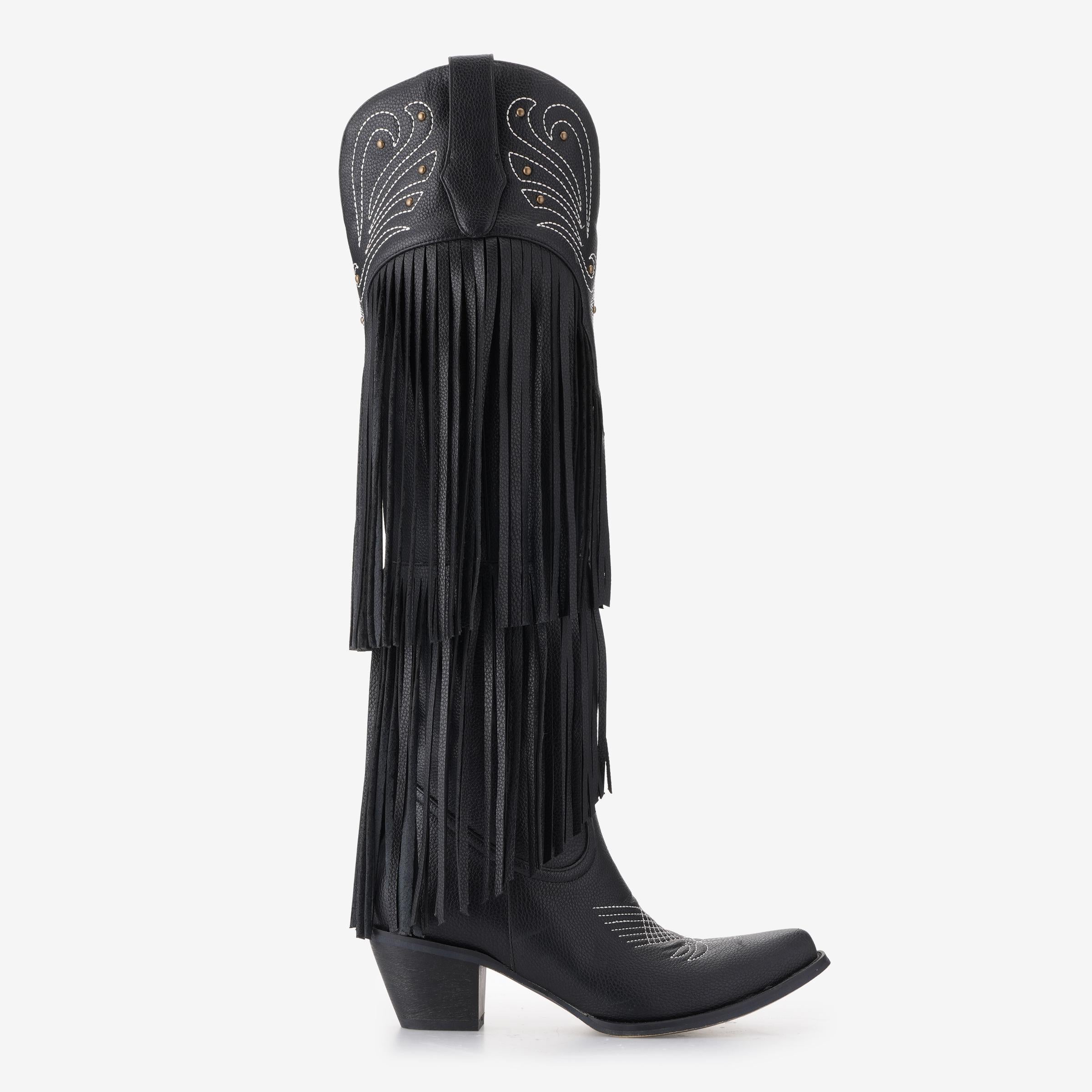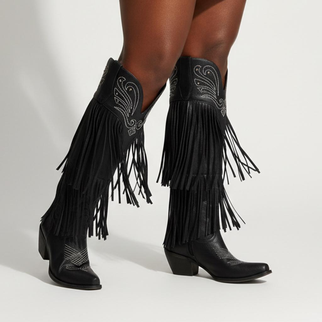 Crafted with a unique blend of fashion and comfort, these stunning over-the-knee western boots redefine modern elegance. The exquisite embroidered details, alongside eye-catching fringes and rivets, set these boots apart, making them the perfect accessory for any stylish wardrobe.