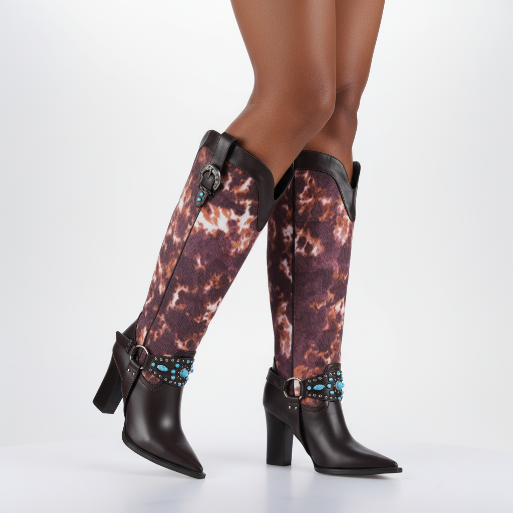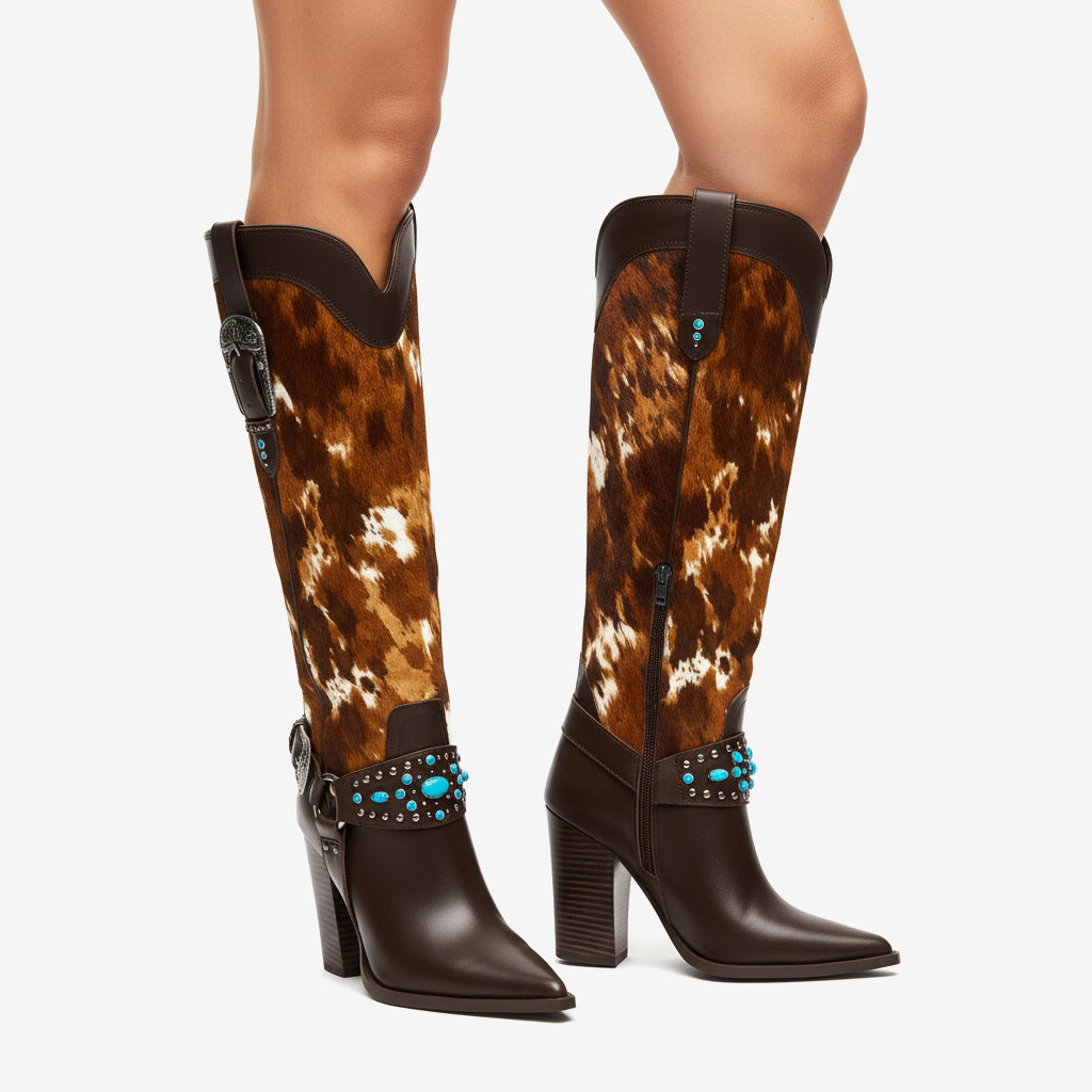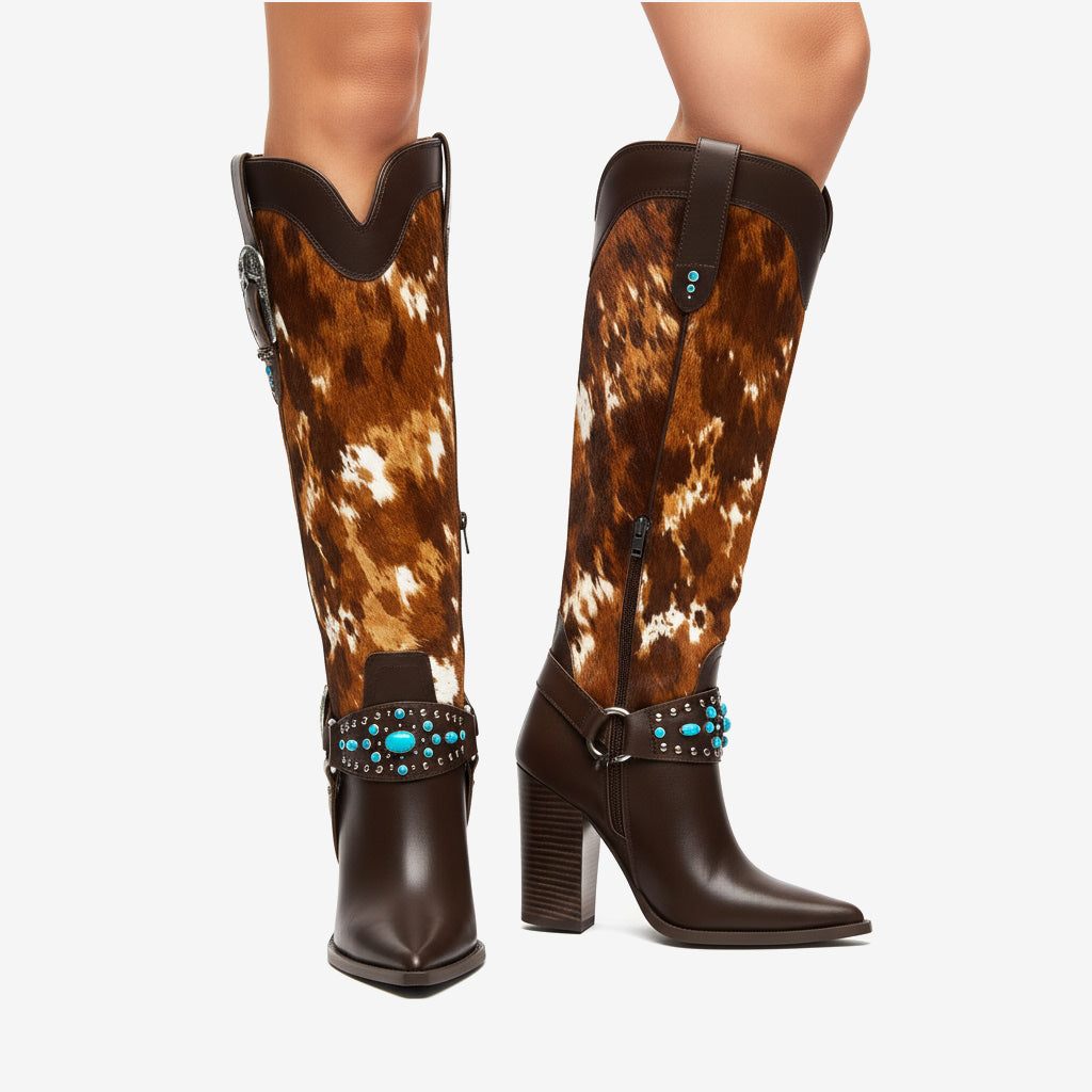 Unleash Your Inner Cowboy: Our Western Cowboy Knee High Boots for Women are expertly crafted from premium PU leather, featuring a stylish studded and buckled design that stands out. The unique blend of fashion and function keeps you looking chic while ensuring durability.