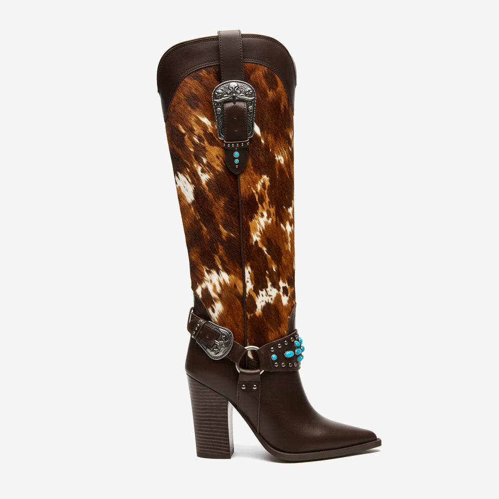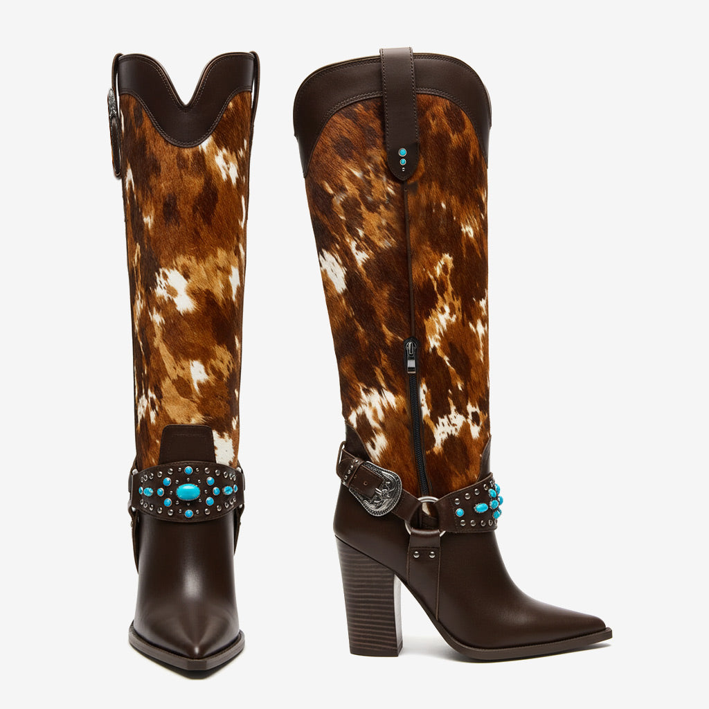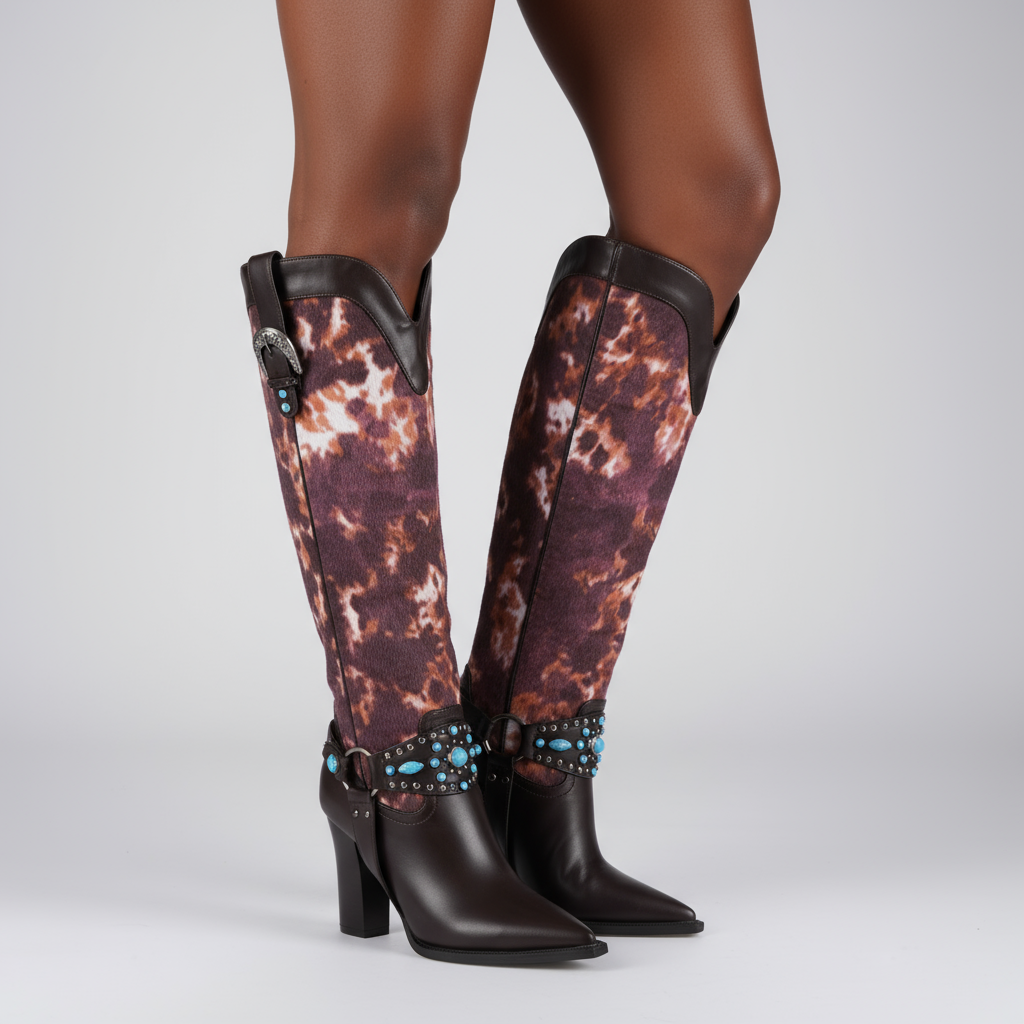 Unleash Your Inner Cowboy: Our Western Cowboy Knee High Boots for Women are expertly crafted from premium PU leather, featuring a stylish studded and buckled design that stands out. The unique blend of fashion and function keeps you looking chic while ensuring durability.