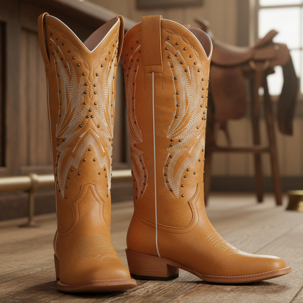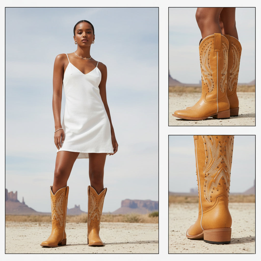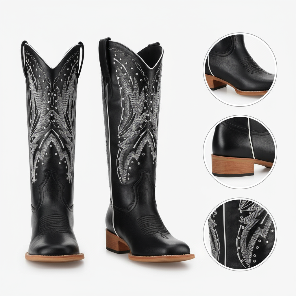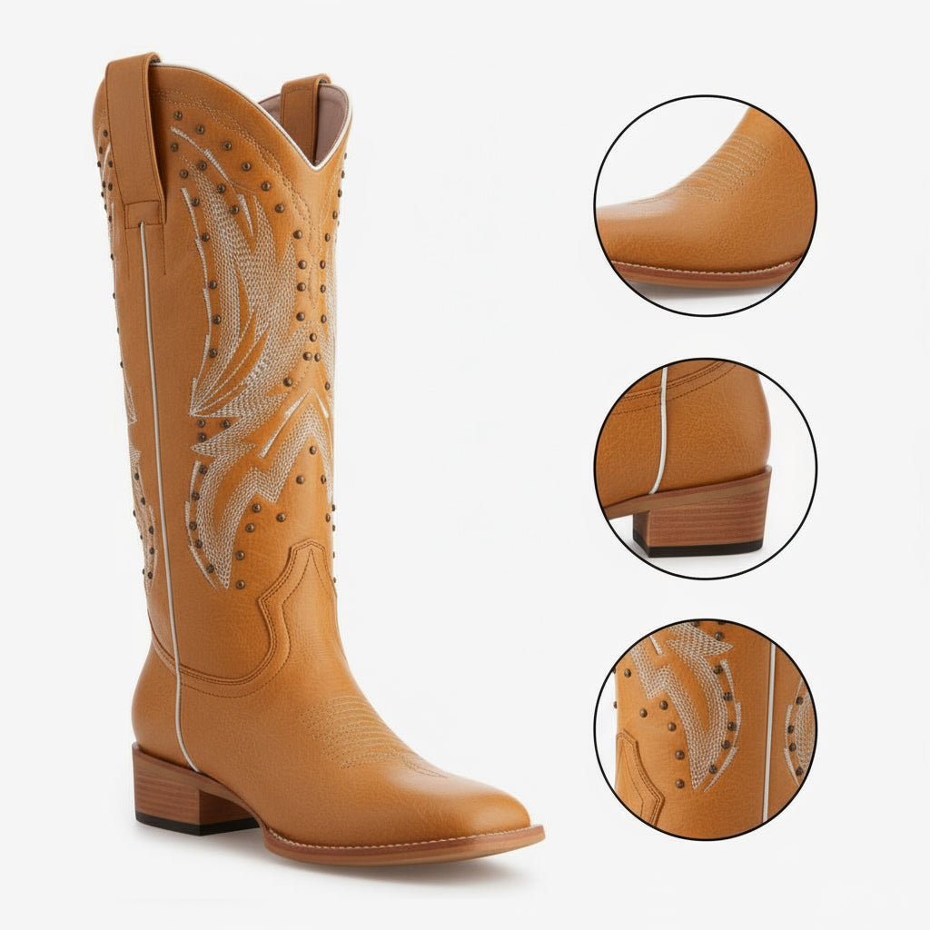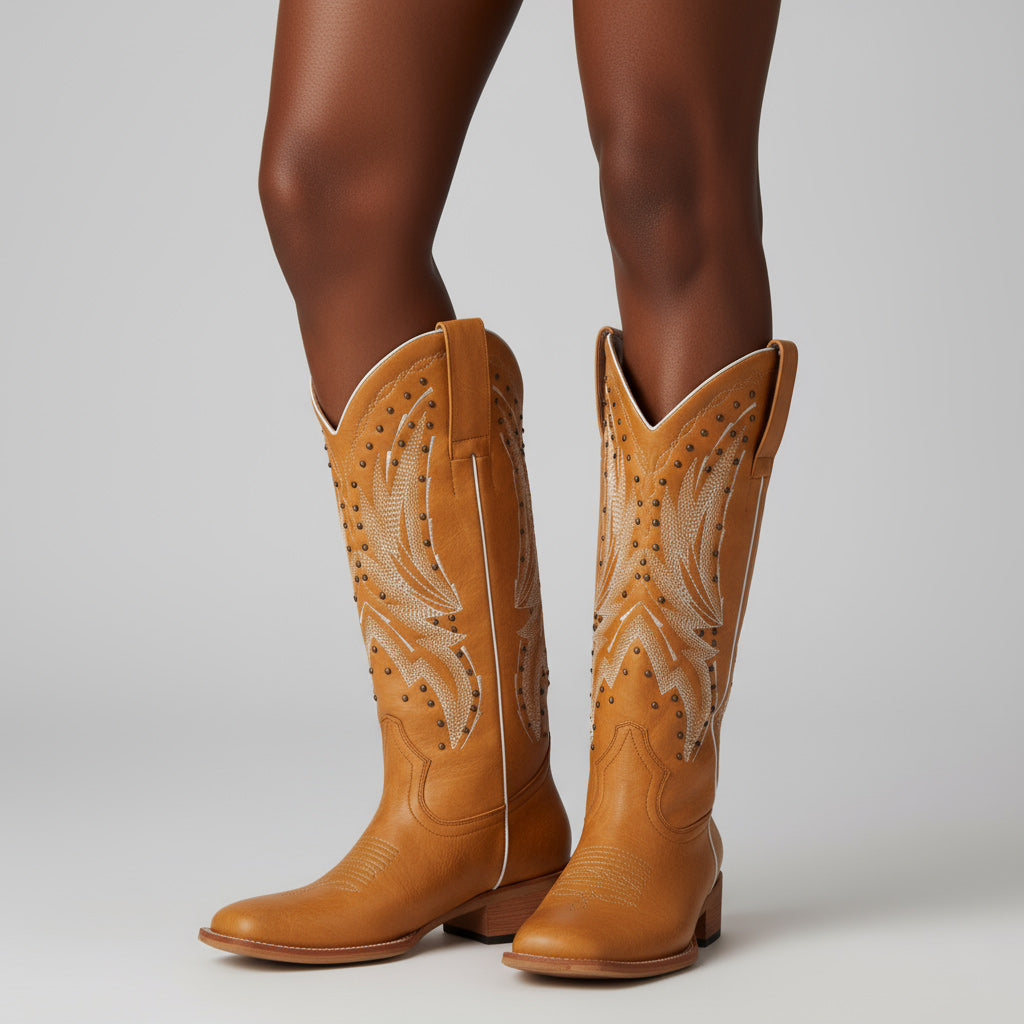 Introducing our Western Cowboy Women's Boots, designed to elevate your wardrobe with a unique blend of handcrafted artistry and modern functionality. Each pair is expertly crafted from full-grain leather, ensuring a durable and visually striking finish. The stunning embroidered and studded details enhance the overall aesthetic, offering a chic look that stands out in any setting.