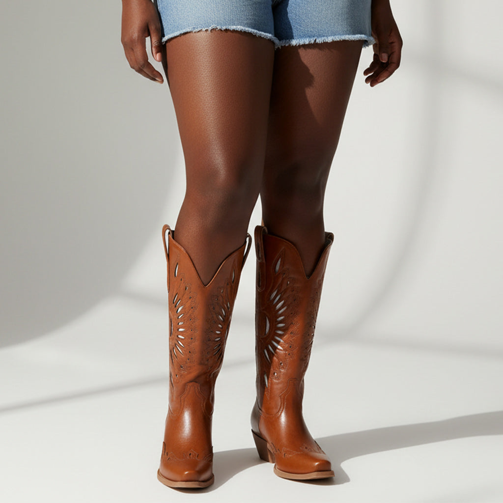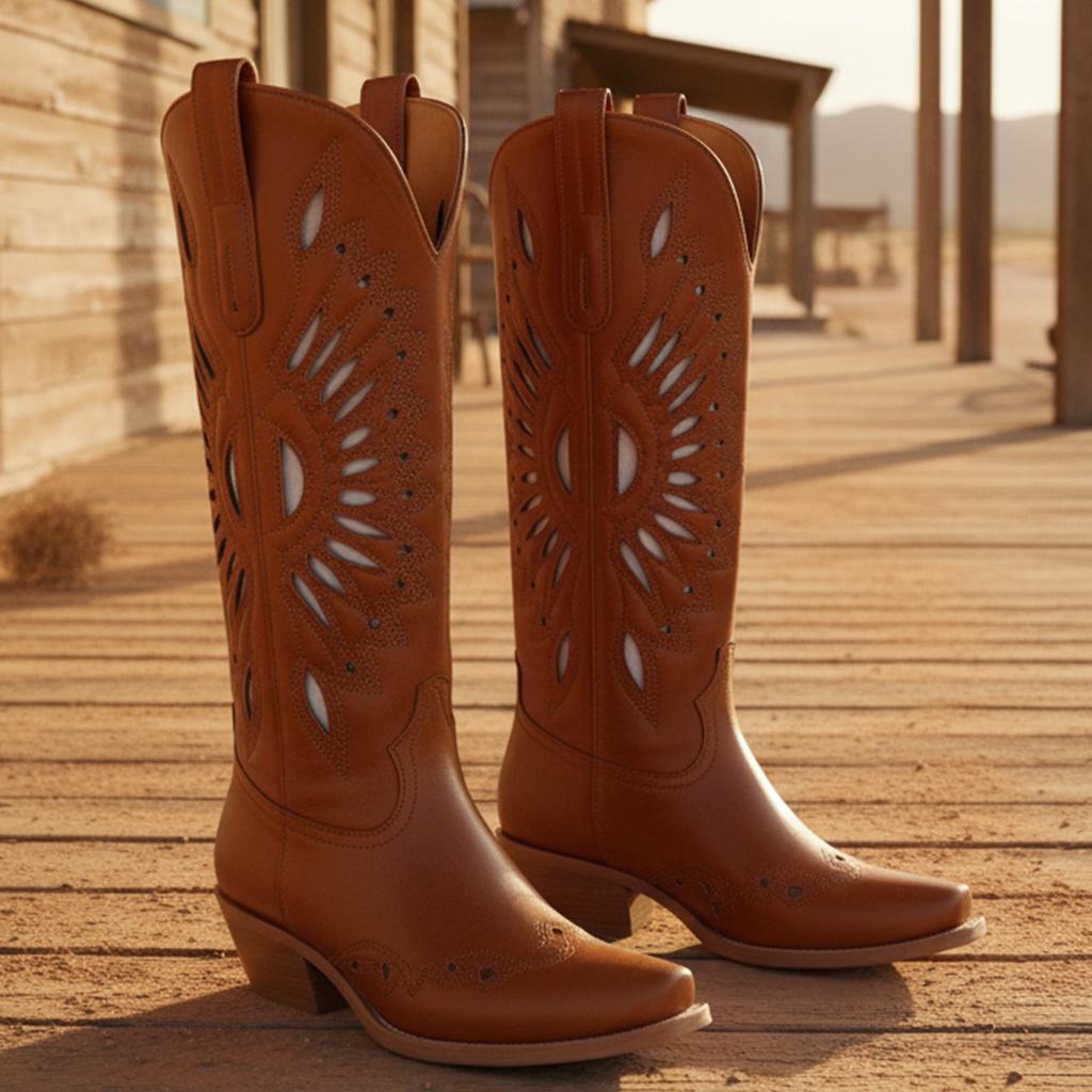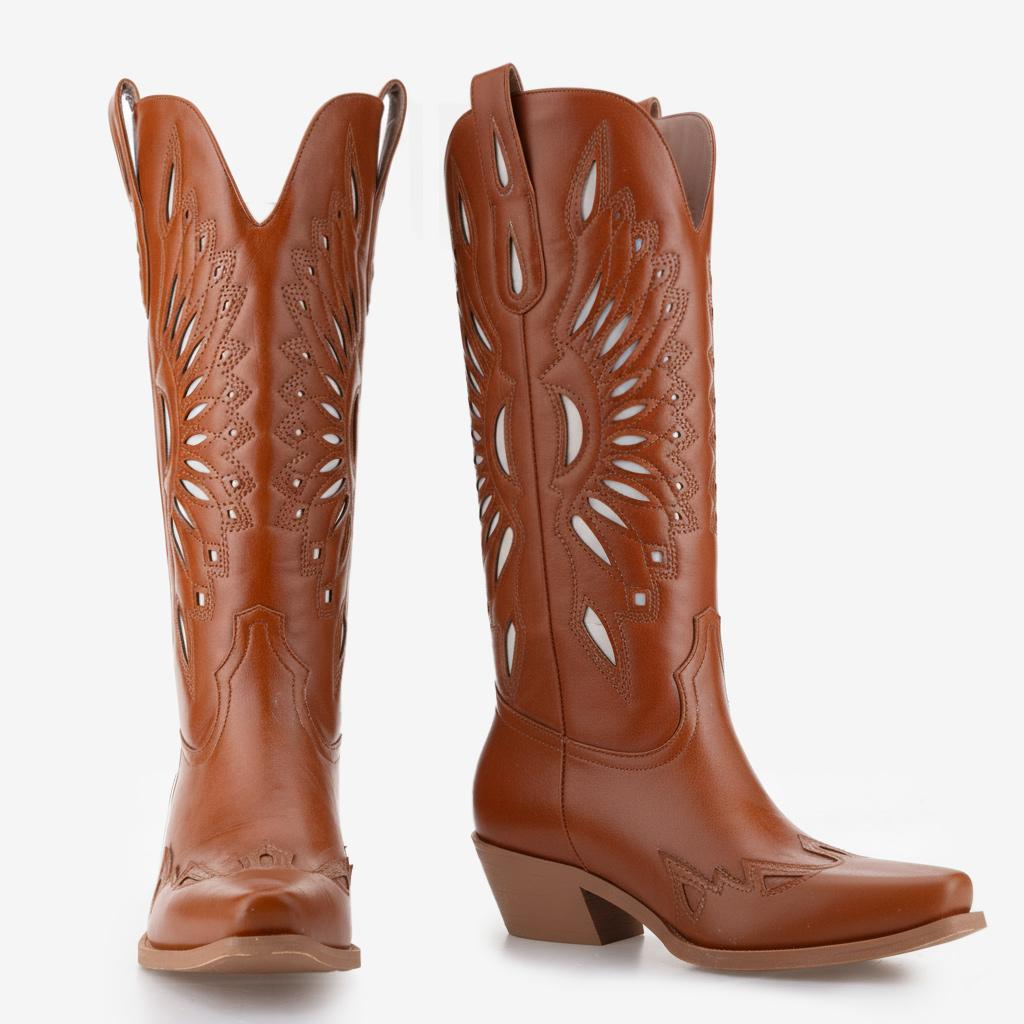 Experience Unmatched Comfort and Style with our Western Cowgirl Boots, handcrafted from genuine full-grain leather. Each pair showcases unique craftsmanship, featuring a chic floral inlay design that adds a rustic charm to your wardrobe. Expertly crafted with attention to detail, these boots are not just footwear; they represent a lifestyle.