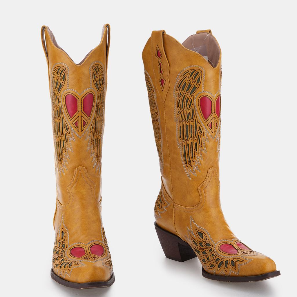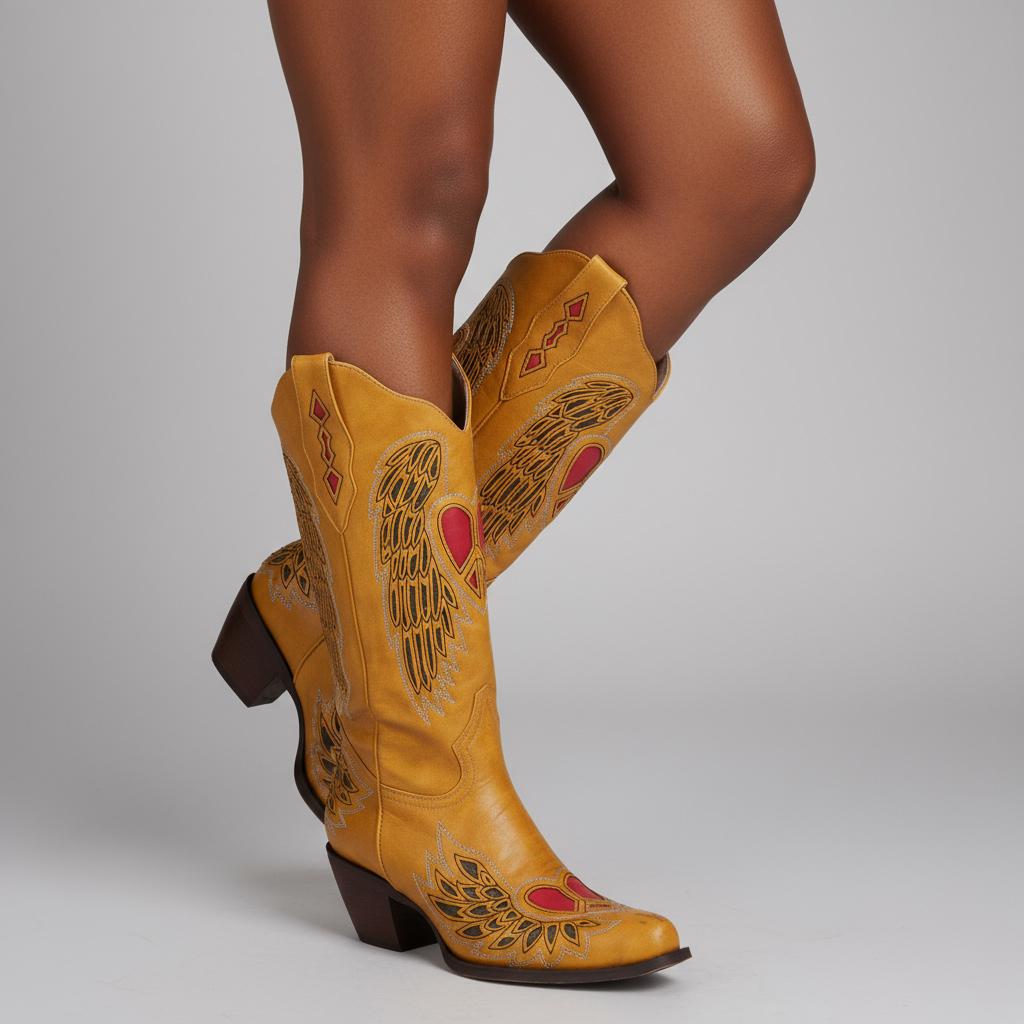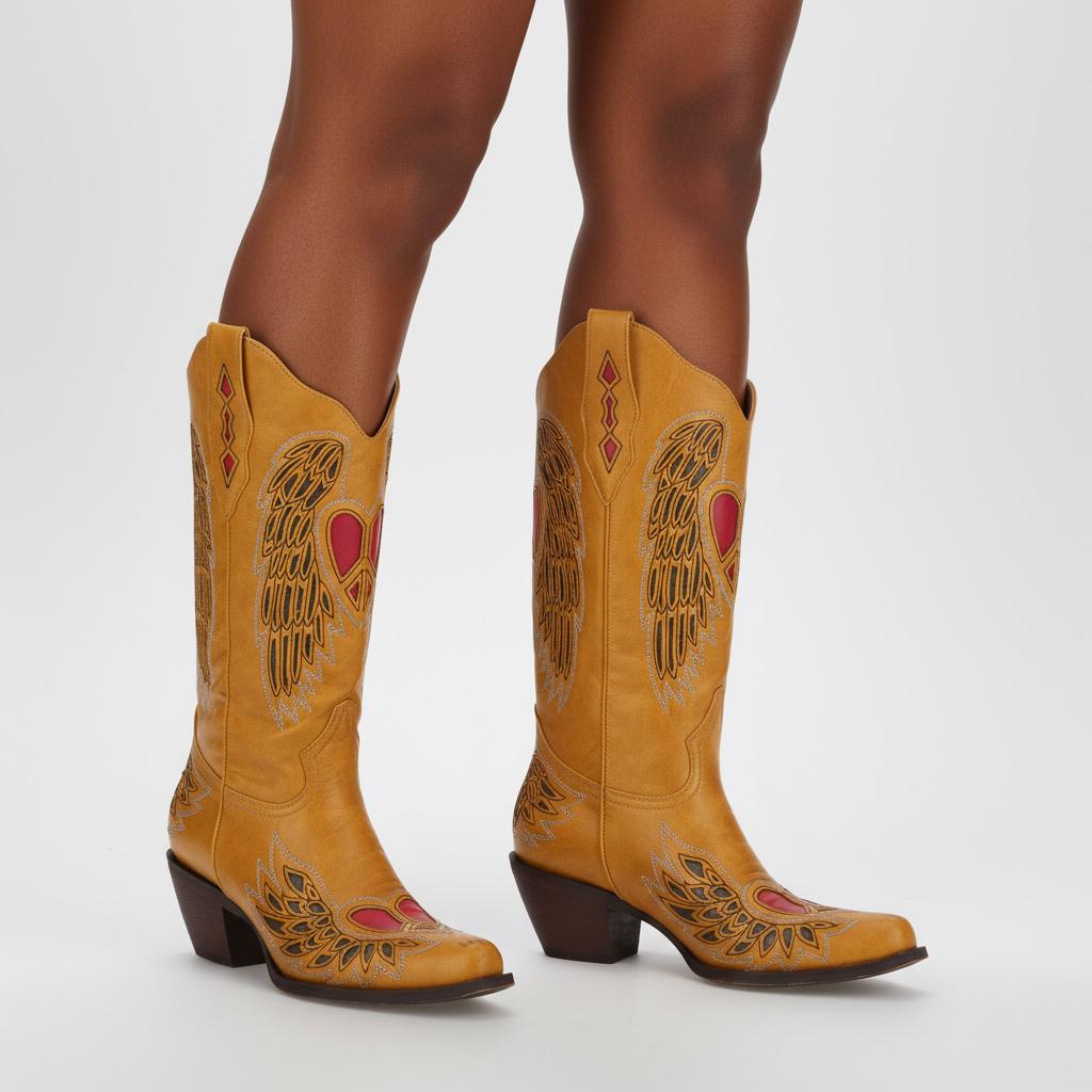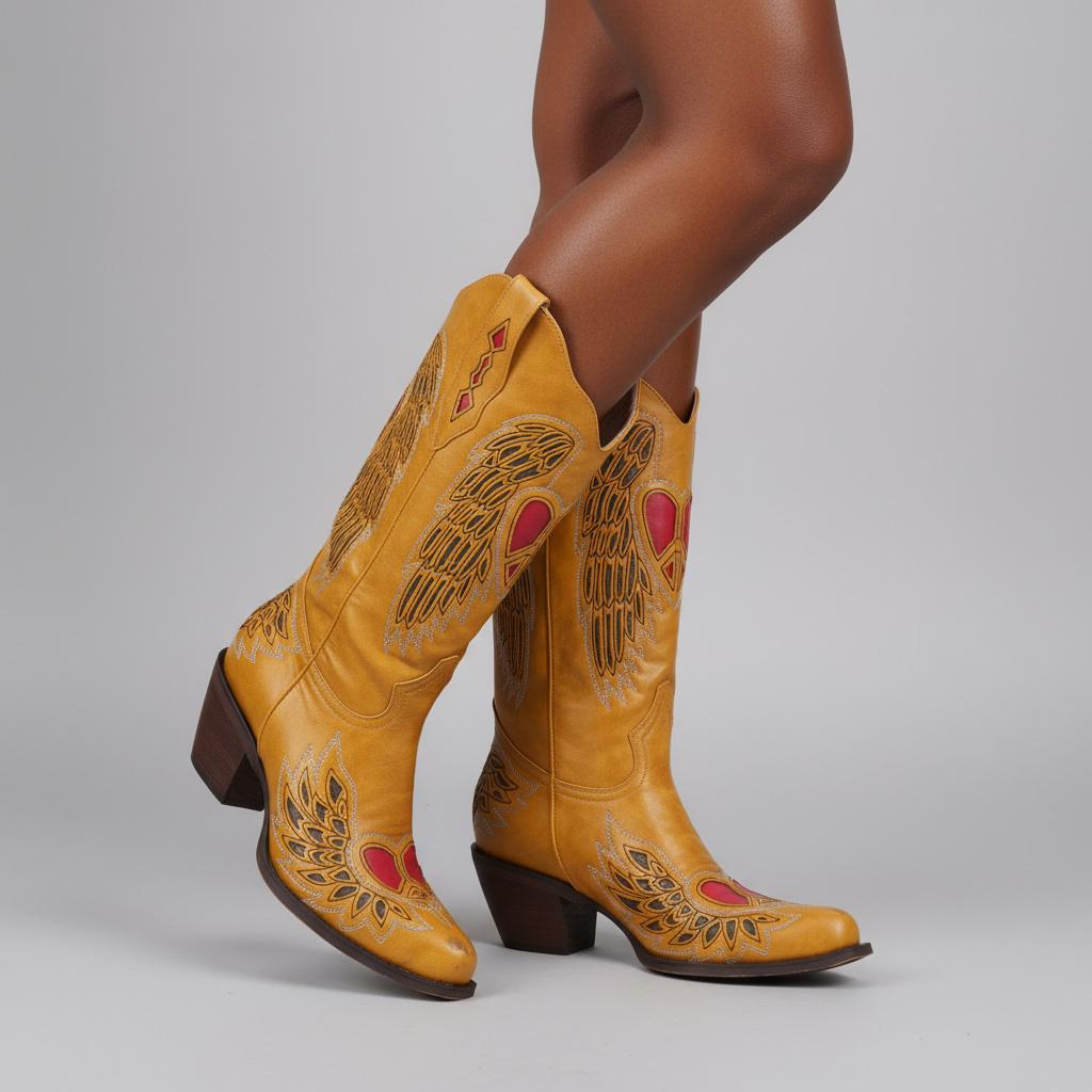Crafted from premium vegan leather, these Western cowgirl boots embody durability and luxury. The unique craftsmanship showcases carefully hand-stitched seams and embroidered heart details, making each pair a work of art. These boots represent not just a fashion statement, but an expression of individuality, catering to the modern woman's aesthetic.