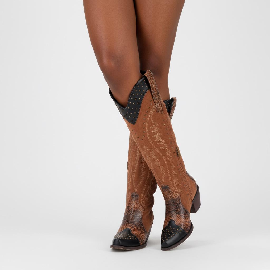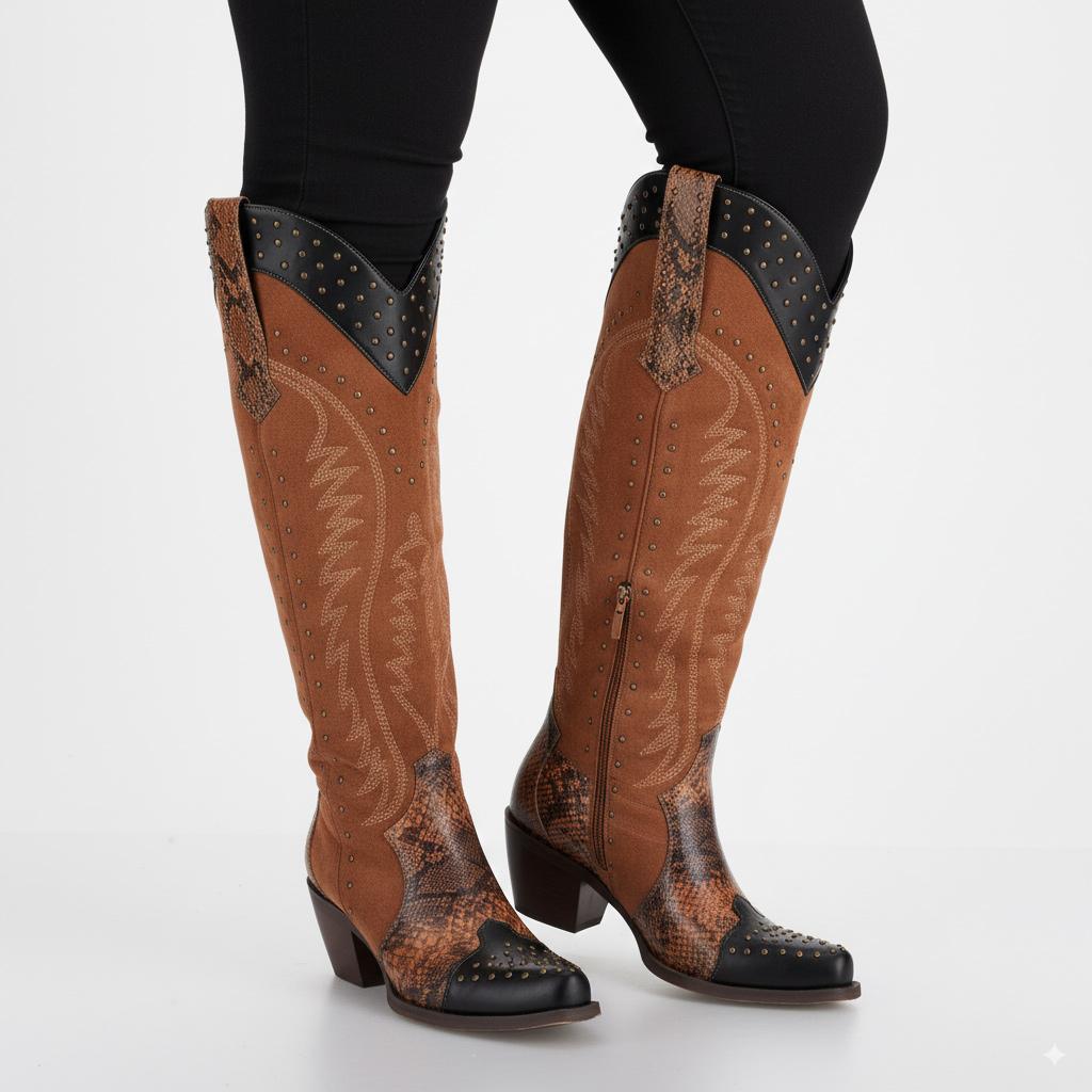 Experience luxury with our Western Cowgirl Knee-High Boots, crafted from top-quality faux suede that ensures a soft touch and elevated style. The elegant snip-toe design not only enhances your look but also reflects your unique fashion sense. Stand out with intricate animal patterns and stud detailing that add an exclusive flair to your footwear.