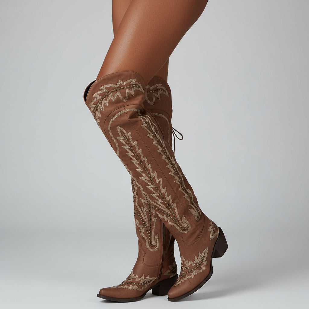 Discover the perfect blend of style and comfort with our Bronze Grass Embroidered & Studded Zip Lace-Up Snip Toe Knee-High Western Boots. Crafted from high-quality PU with a chic embroidered design, these boots are not just footwear but a statement piece for your wardrobe.