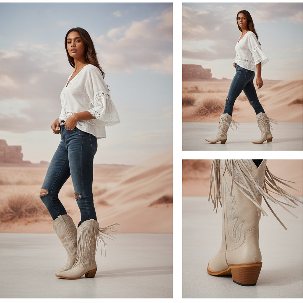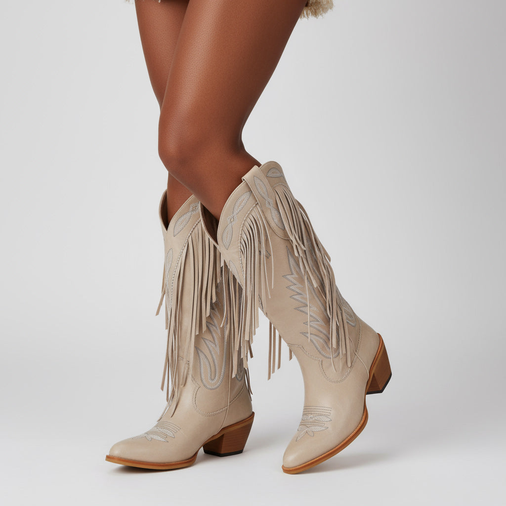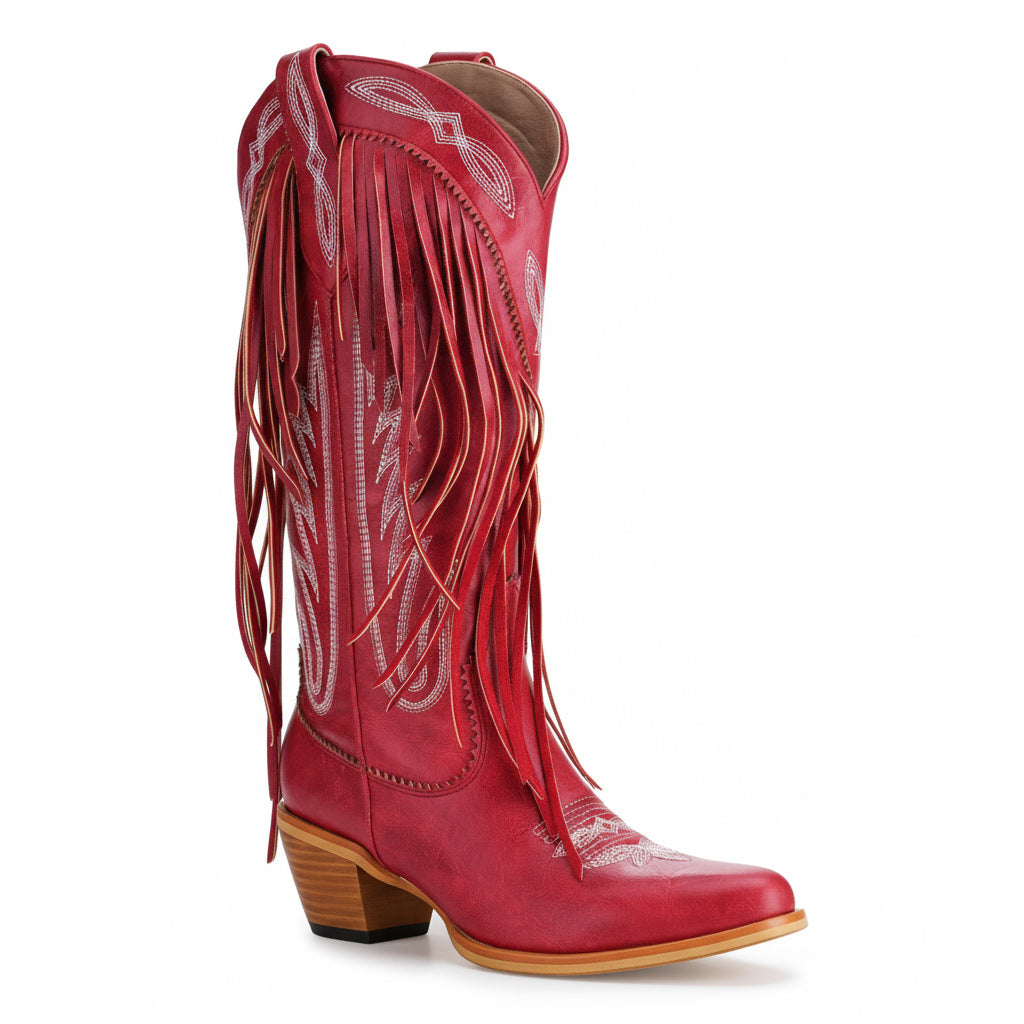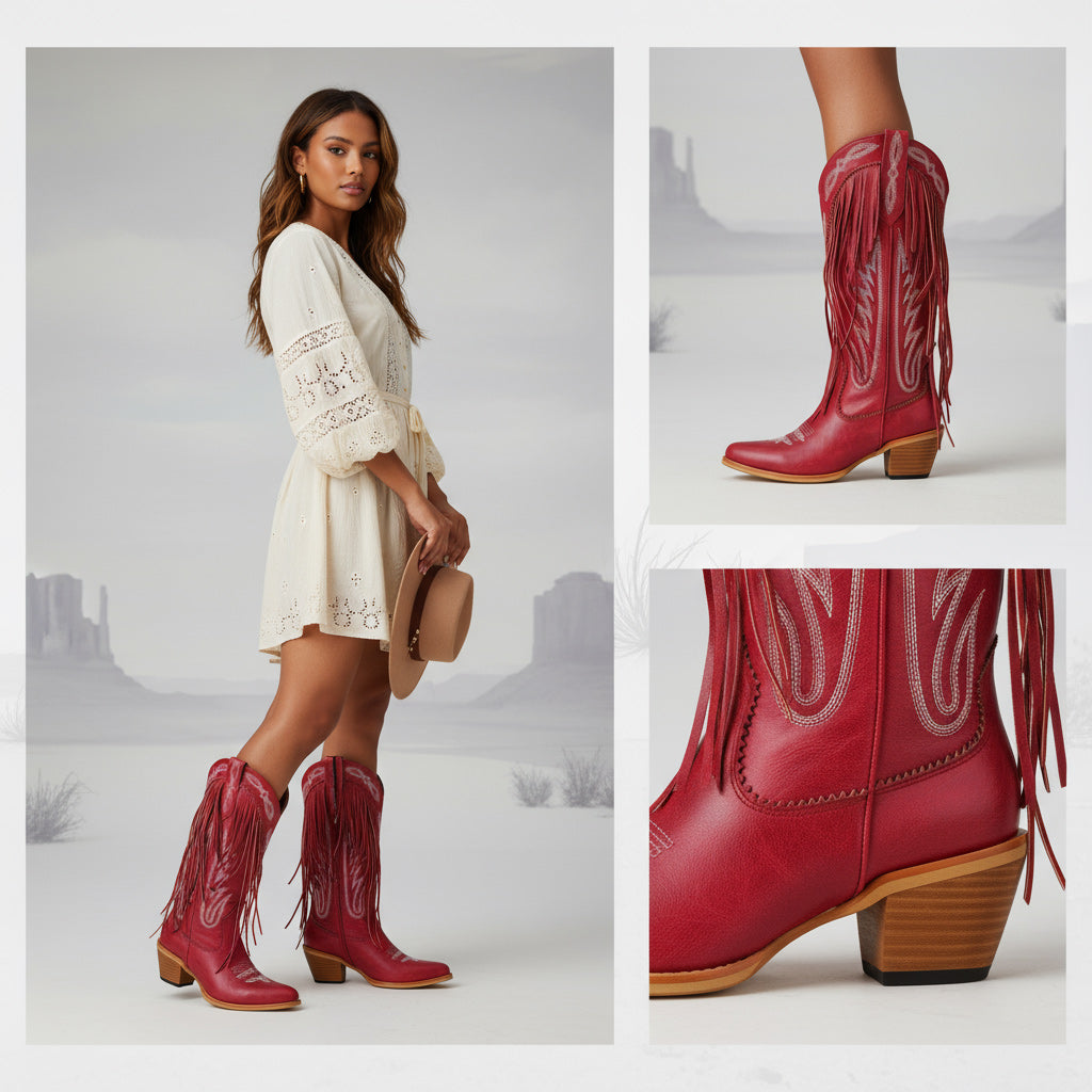Discover the perfect blend of style and comfort with our Western Floral Cowboy Boots for Women. These handcrafted boots feature a mid-calf design that ensures all-day wear, making them ideal for parties, travel, and performances. Crafted from premium full-grain leather, these boots embody unique craftsmanship with exquisite floral embroidery and stylish fringe detail for a chic look.