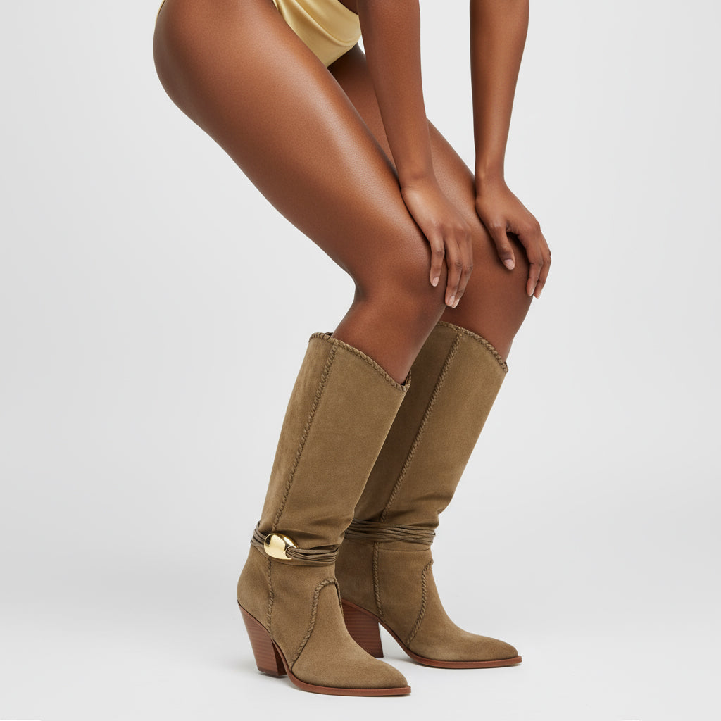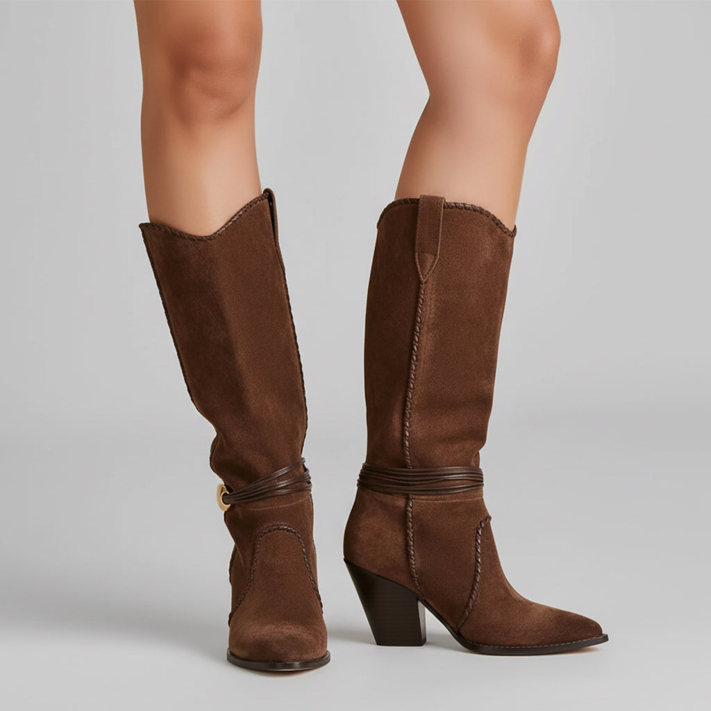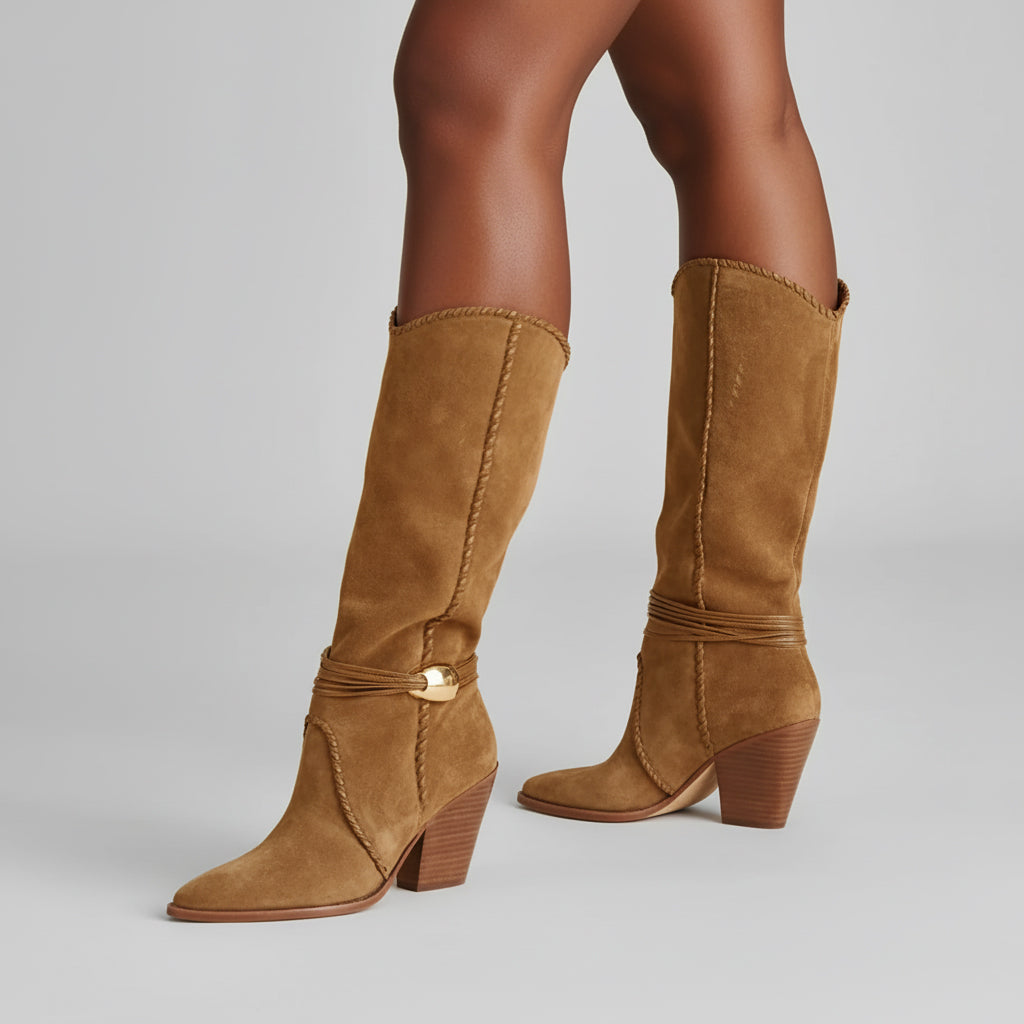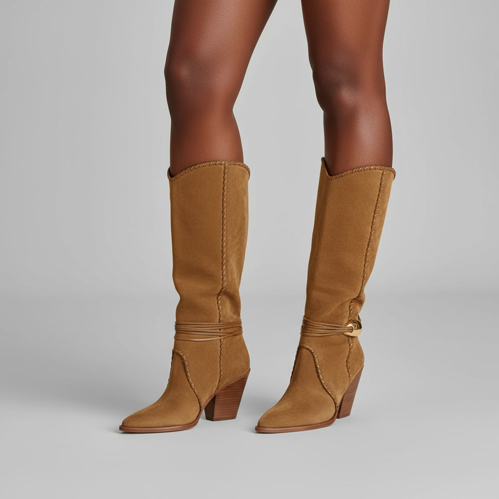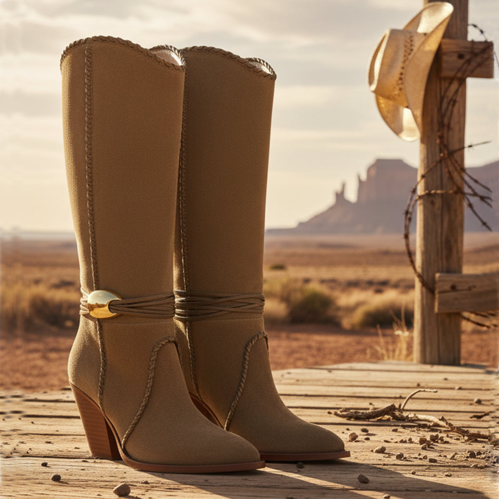 Elevate your style with our Western Knee-High Boots, meticulously crafted from soft faux suede to provide both comfort and sophistication. The unique woven design not only adds an exquisite touch but also showcases the expert craftsmanship that goes into each pair. Made for the modern woman, these boots blend fashion and functionality, making them your perfect companion for any occasion.