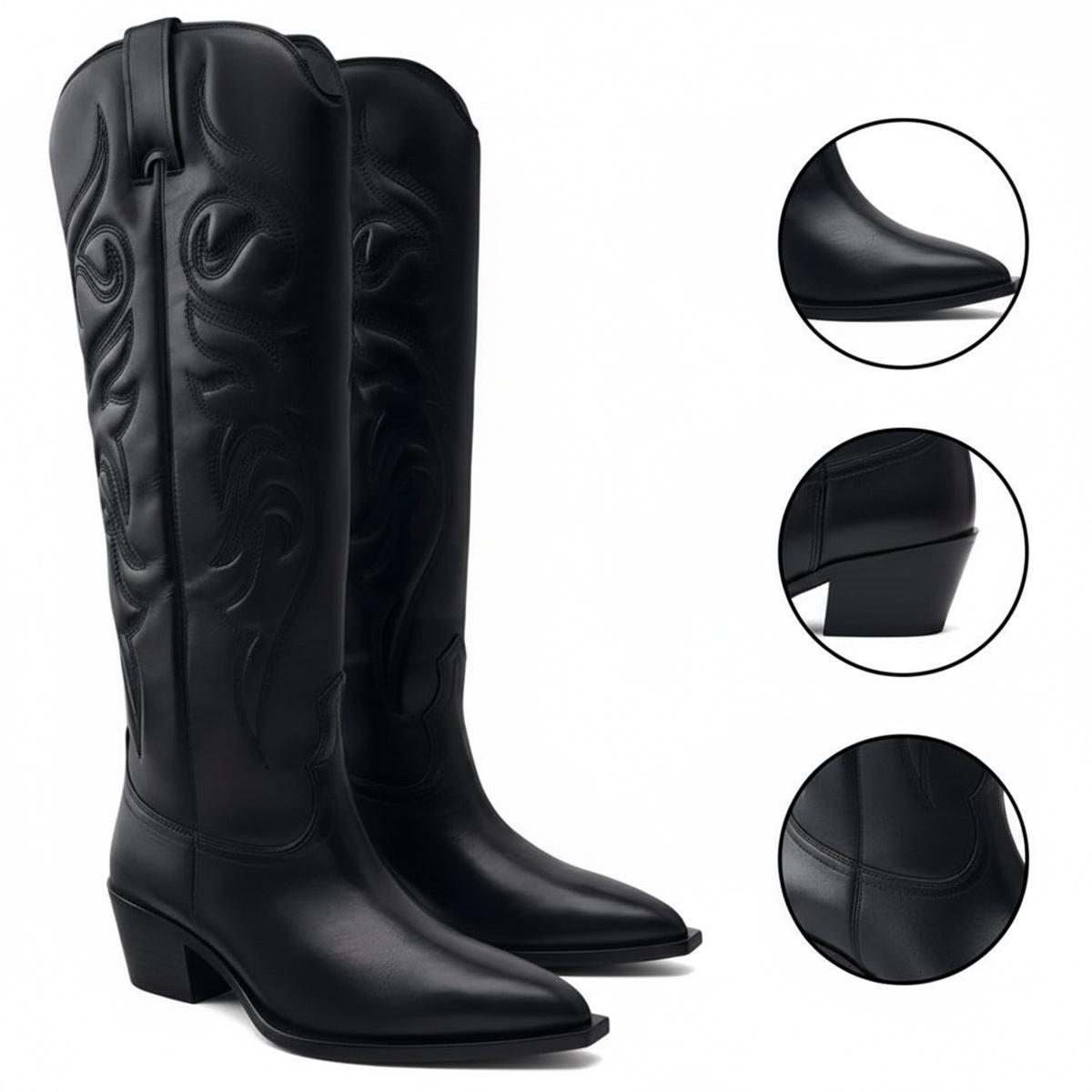 Introducing our Western Knee-High Boots for Women, designed with exquisite embroidery and a chic chunky heel. Crafted from premium full-grain leather, these boots embody a unique craftsmanship that ensures durability and timeless style.
