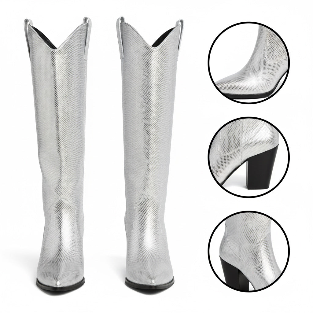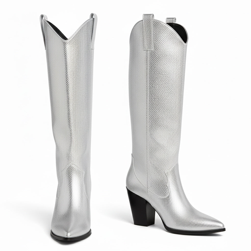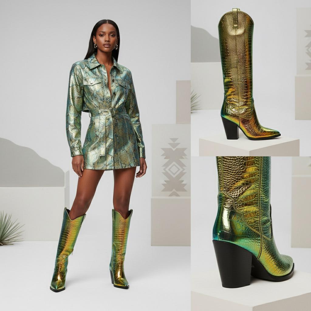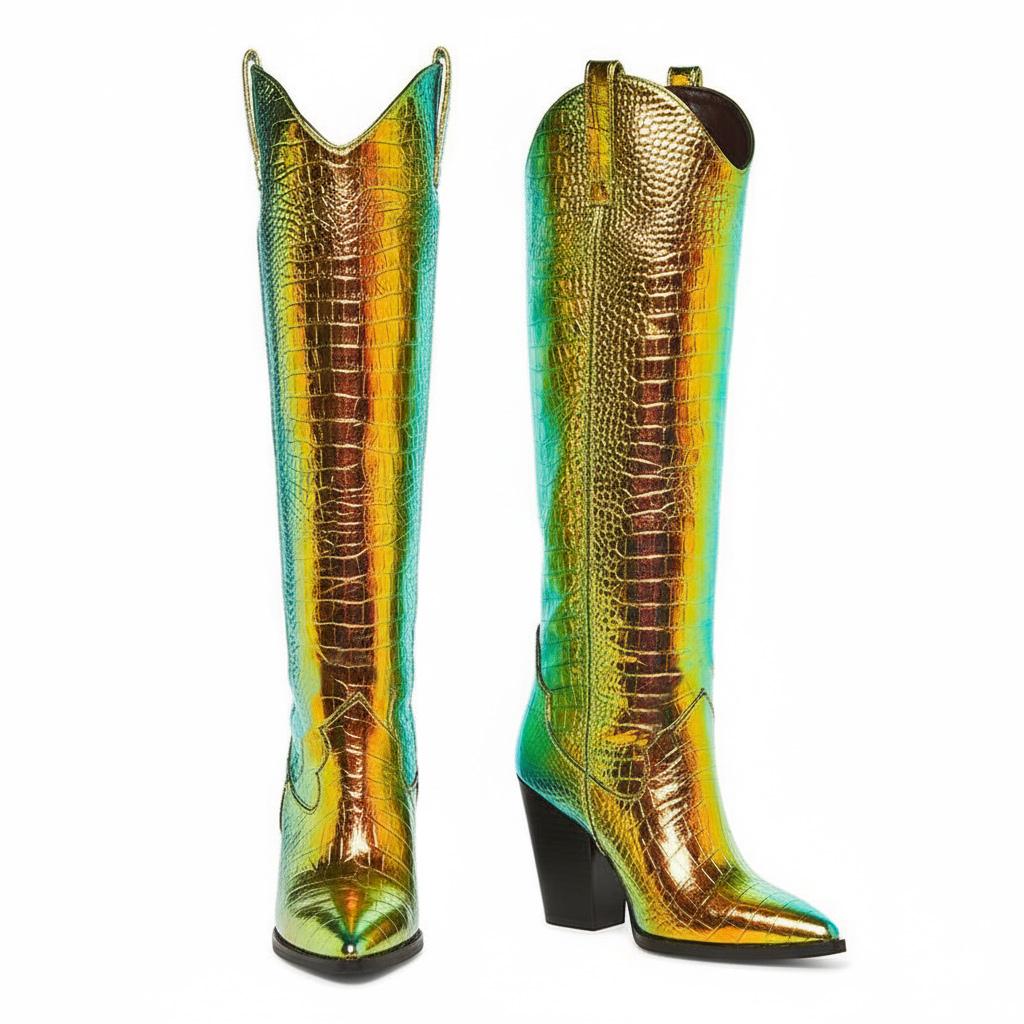 Keywords: Western knee-high boots, slip-on high heels, metallic finish boots, fashionable pointed-toe boots, geometric pattern knee-highs.