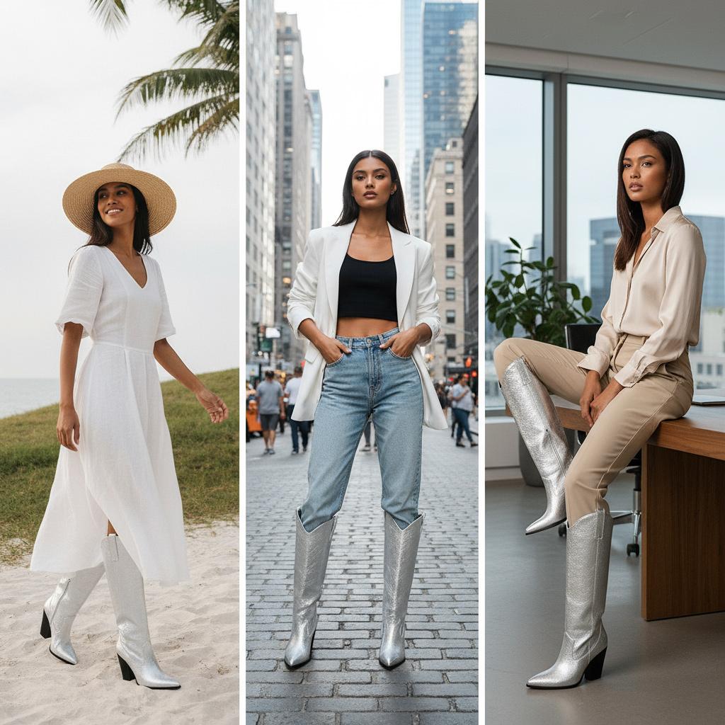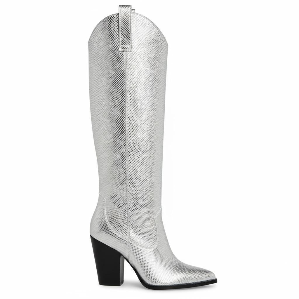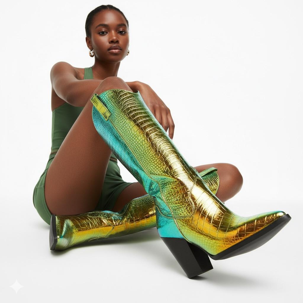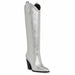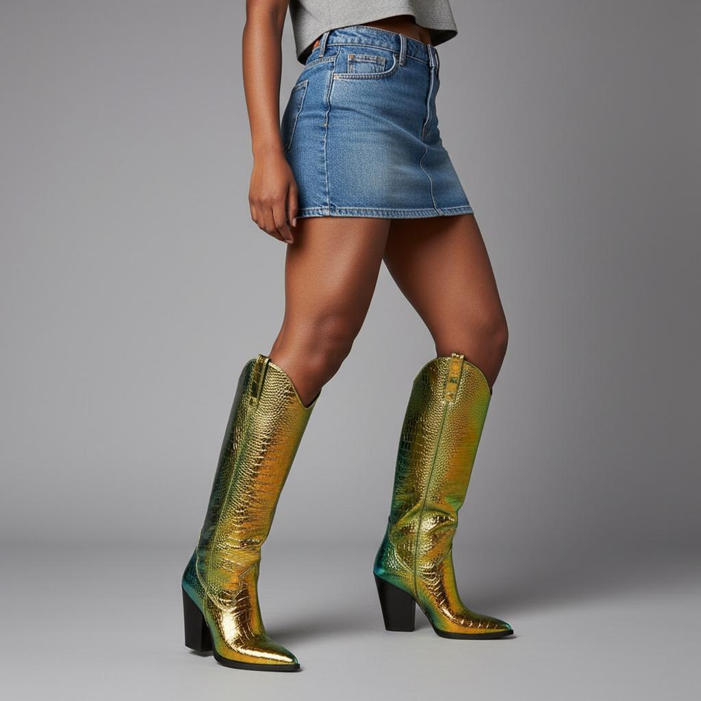 Keywords: Western knee-high boots, slip-on high heels, metallic finish boots, fashionable pointed-toe boots, geometric pattern knee-highs.