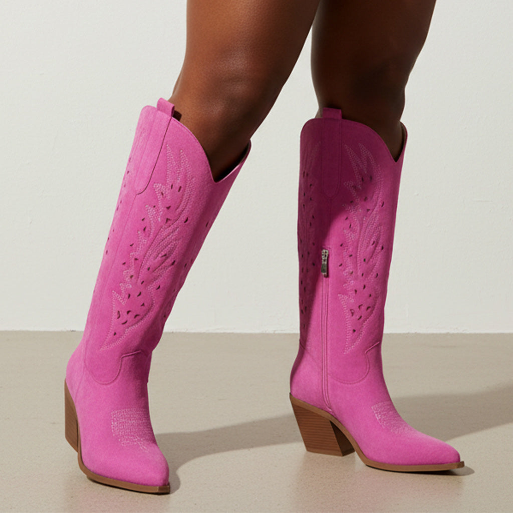 Step into sophistication with our exclusive Western Knee-High Boots, crafted from high-quality faux suede. The meticulous embroidery and chic zip detailing highlight a unique design that sets you apart in any crowd. Ideal for adventures or leisurely outings, these boots combine fashion with functionality to enhance your wardrobe.