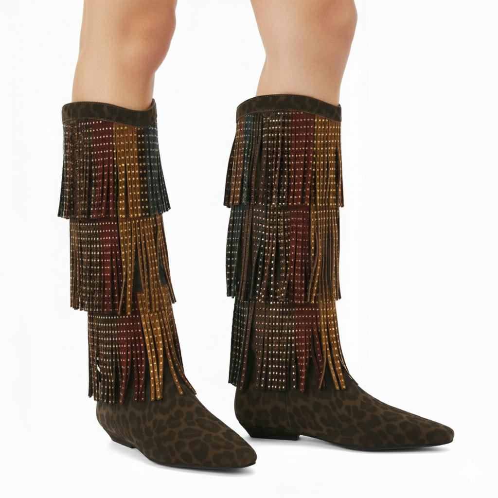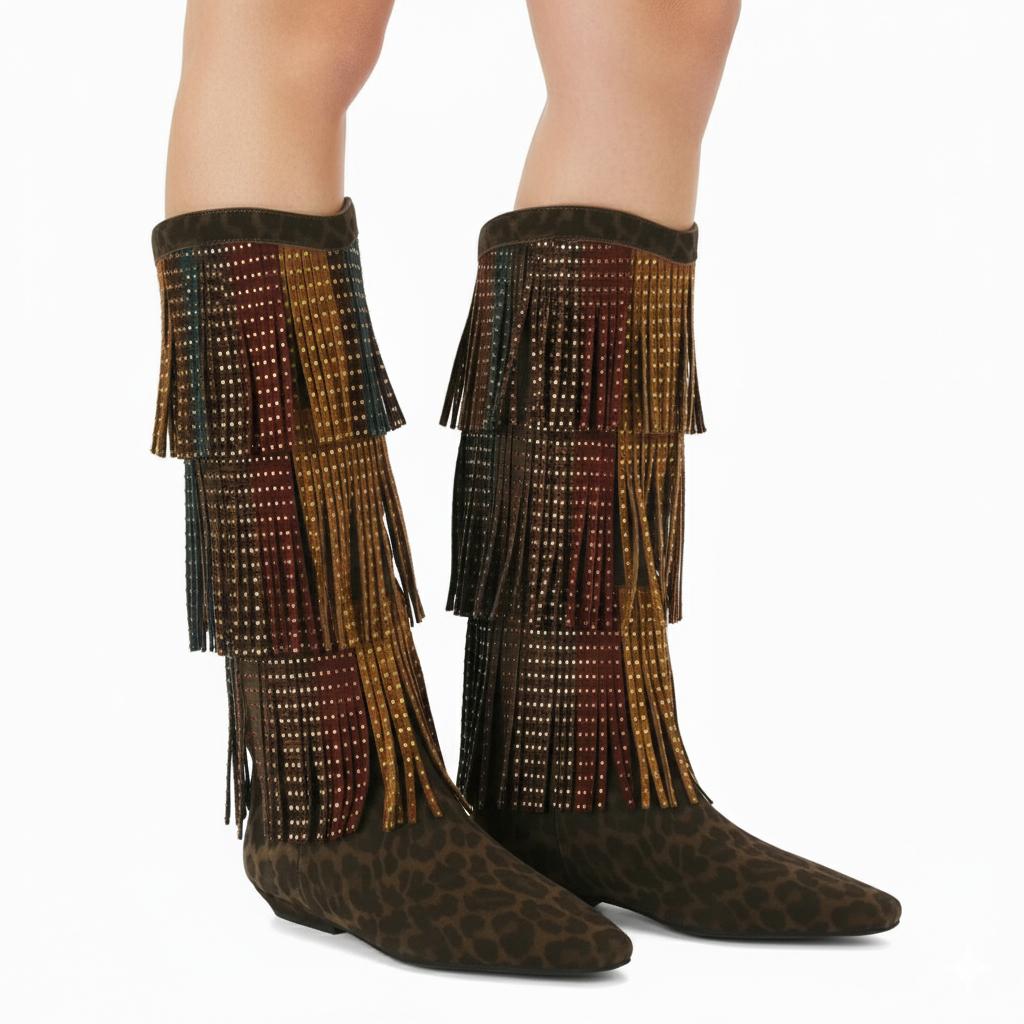 Discover the perfect blend of style and comfort with our Western Knee High Boots. Meticulously handcrafted from premium faux suede, these boots feature luxurious fringe and eye-catching rhinestone accents that add a unique flair to any outfit.