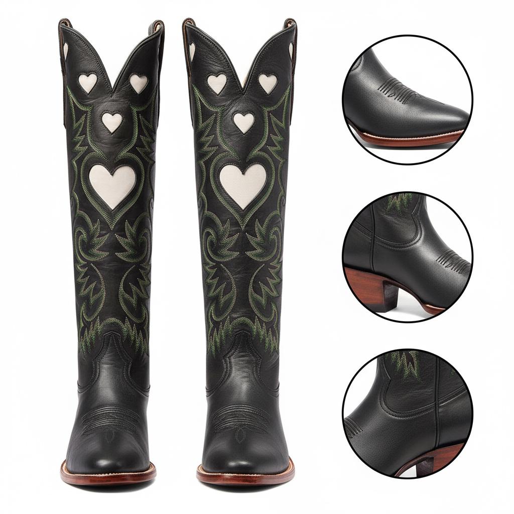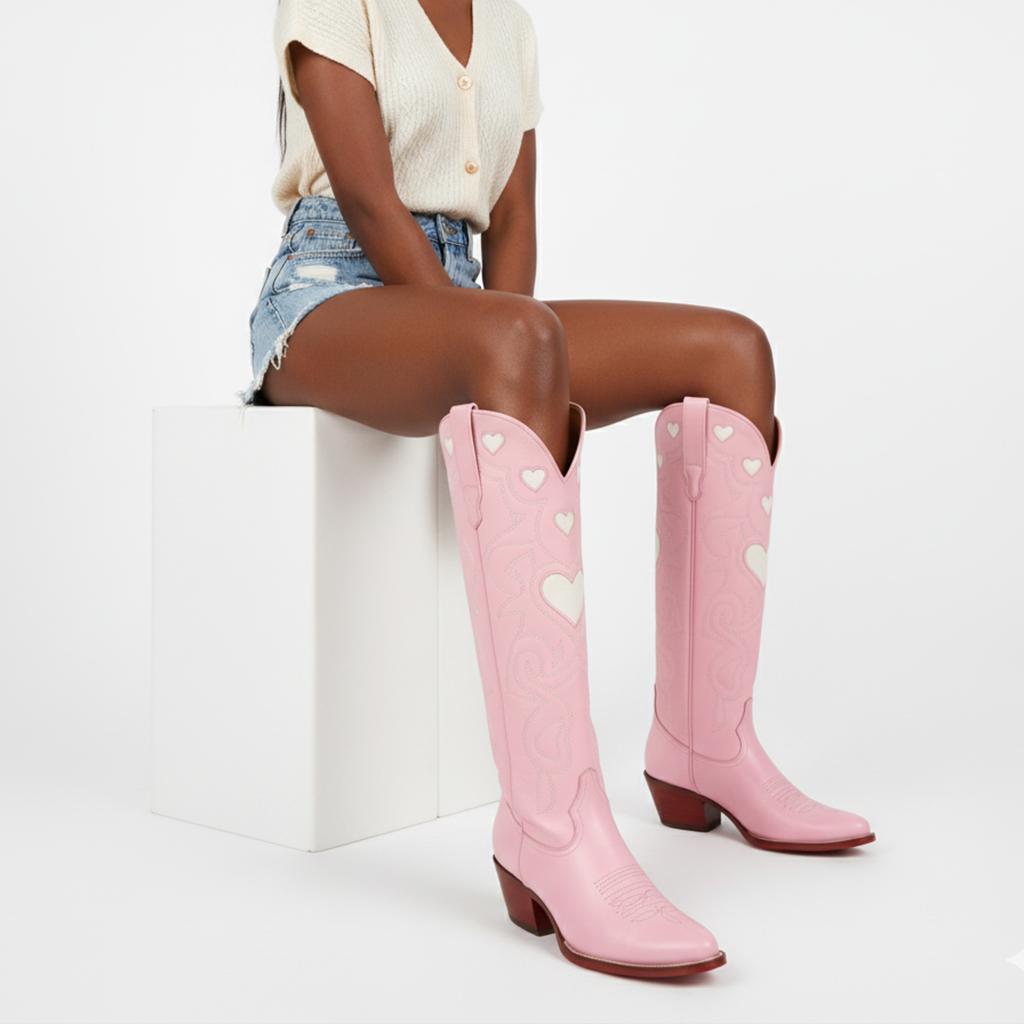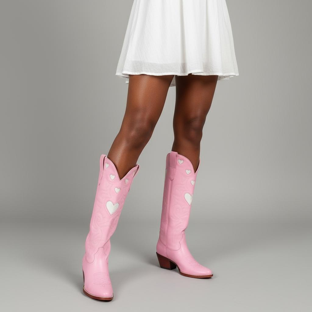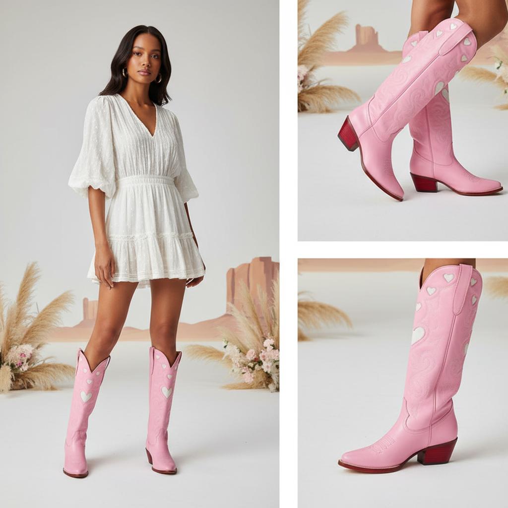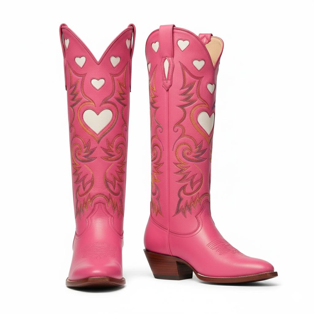 Elevate your footwear game with our Western Knee High Boots, uniquely designed for comfort and style. Crafted from genuine full-grain leather, these boots showcase exquisite hand-stitched embroidery that adds a touch of femininity with charming sweet pink hearts, ensuring you stand out in any crowd.