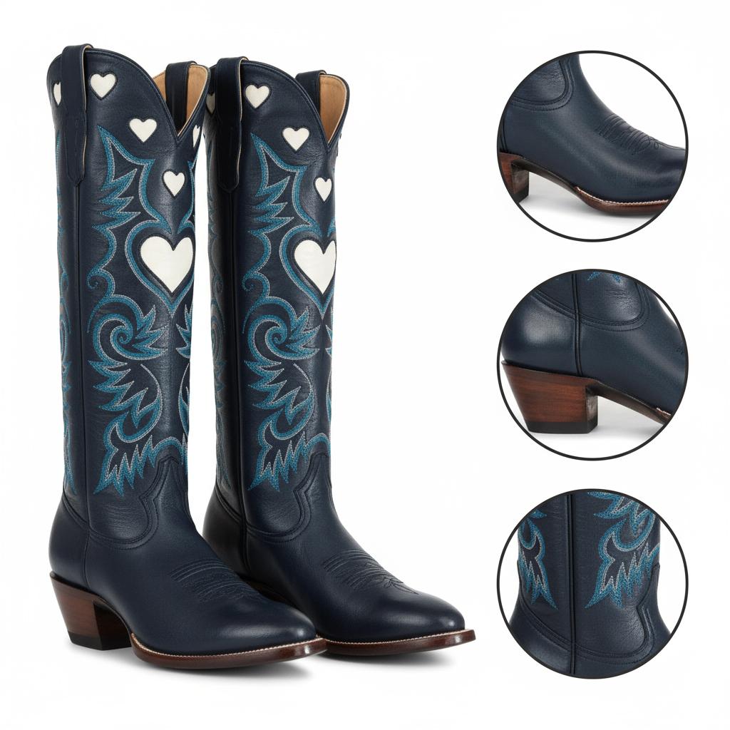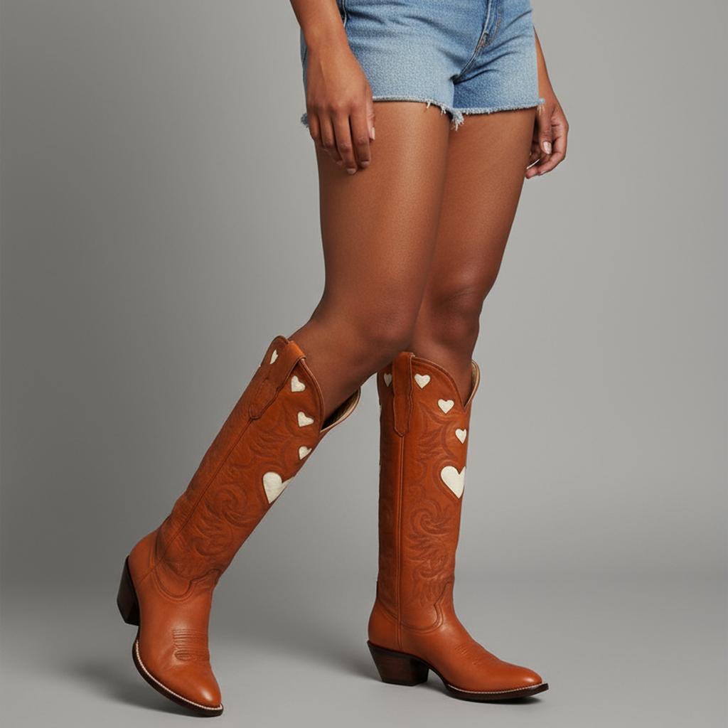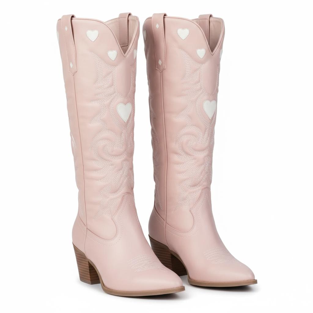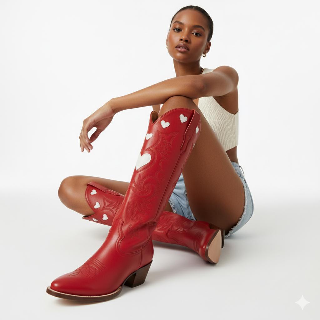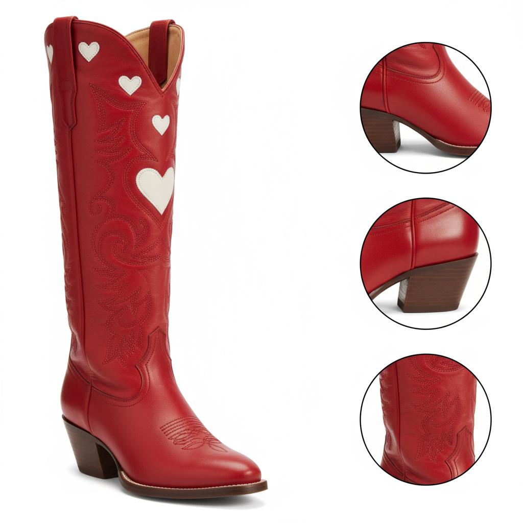 Elevate your footwear game with our Western Knee High Boots, uniquely designed for comfort and style. Crafted from genuine full-grain leather, these boots showcase exquisite hand-stitched embroidery that adds a touch of femininity with charming sweet pink hearts, ensuring you stand out in any crowd.
